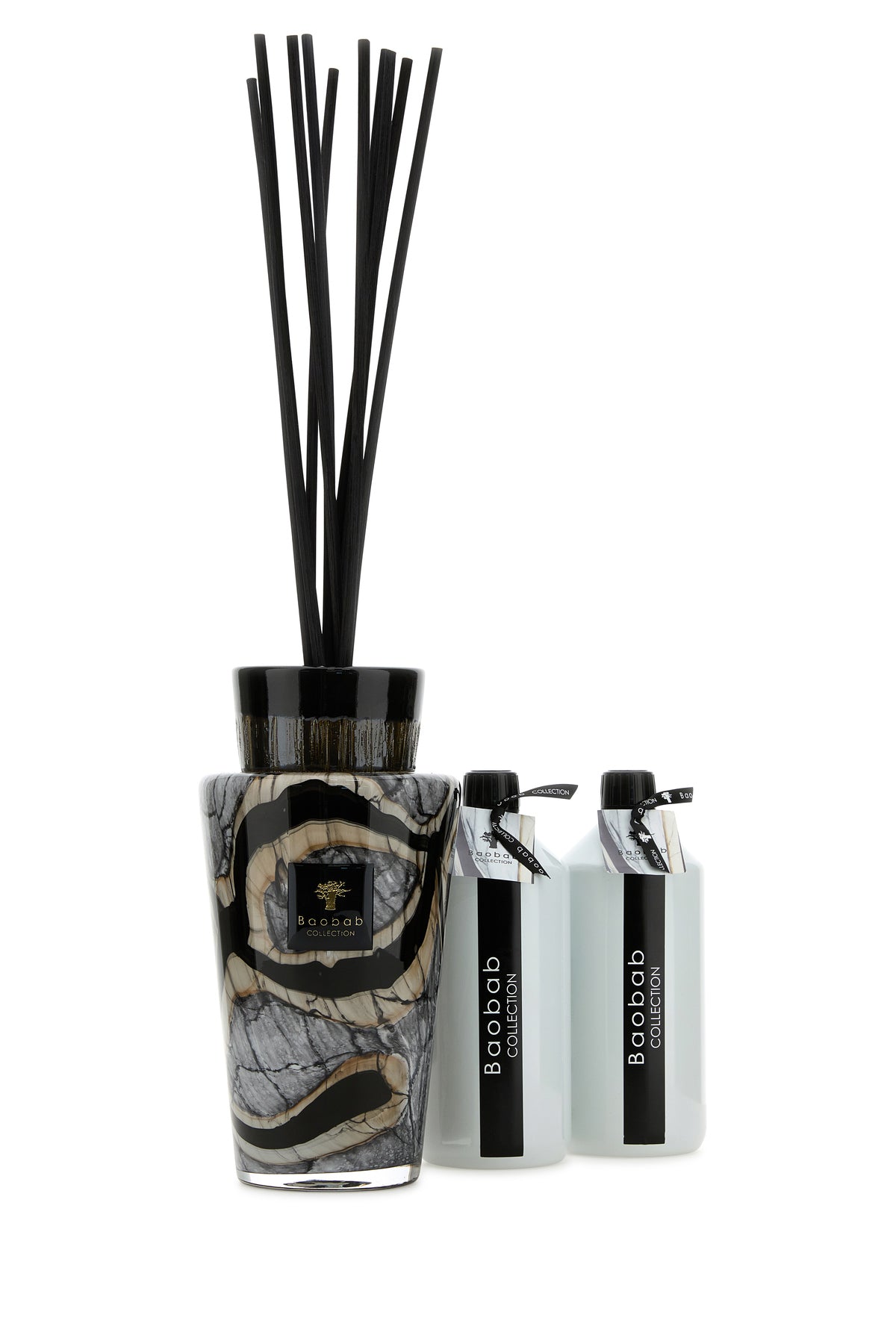 The Totem Marble diffusers are hand-blown by our glass artisans. In reference to the color scheme of precious marble, their ceramic caps are black and silver in accordance with the bottles.