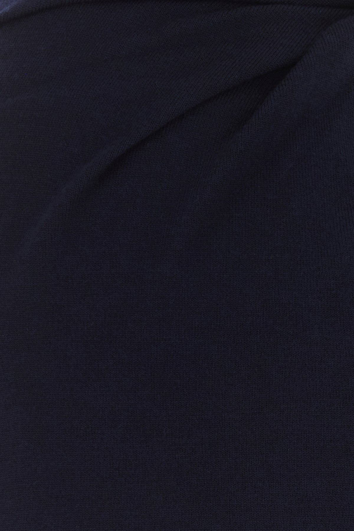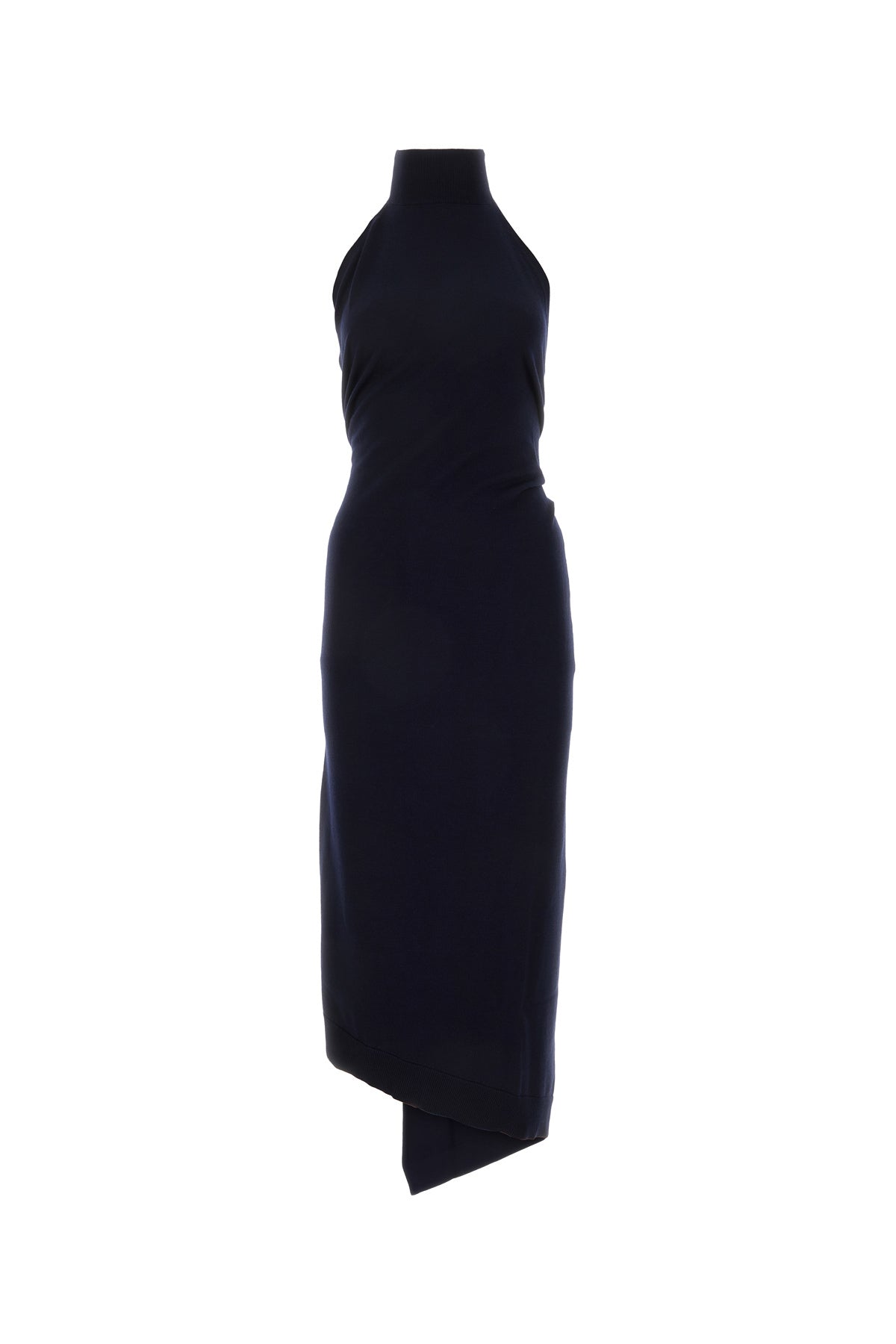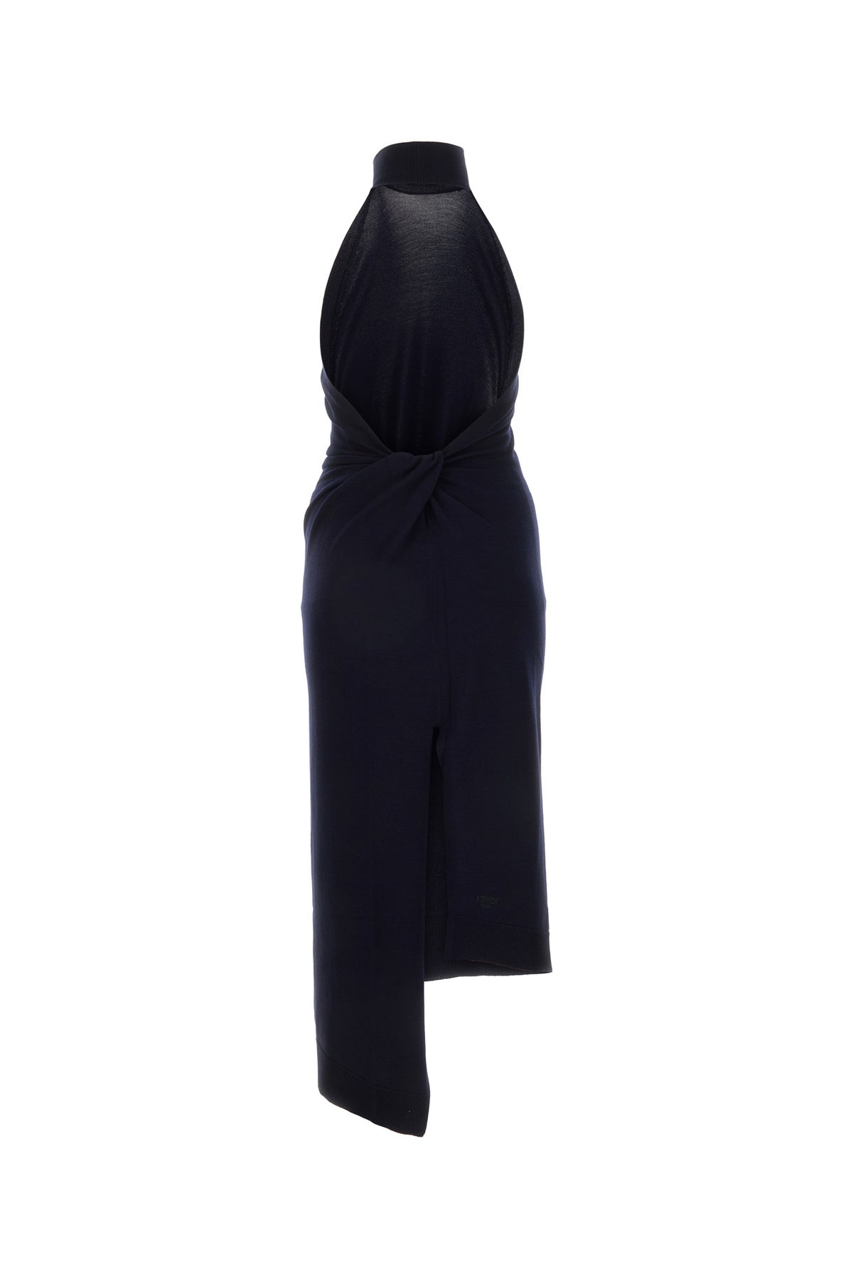 Midi dress realized in stretch wool blend characterized by deep back neckline and tonal logoed embroidery at the back.