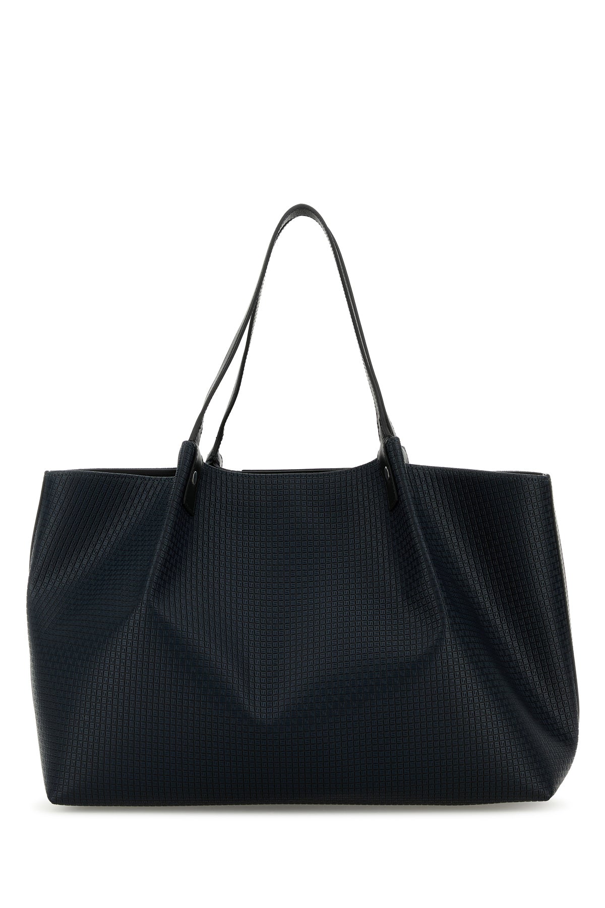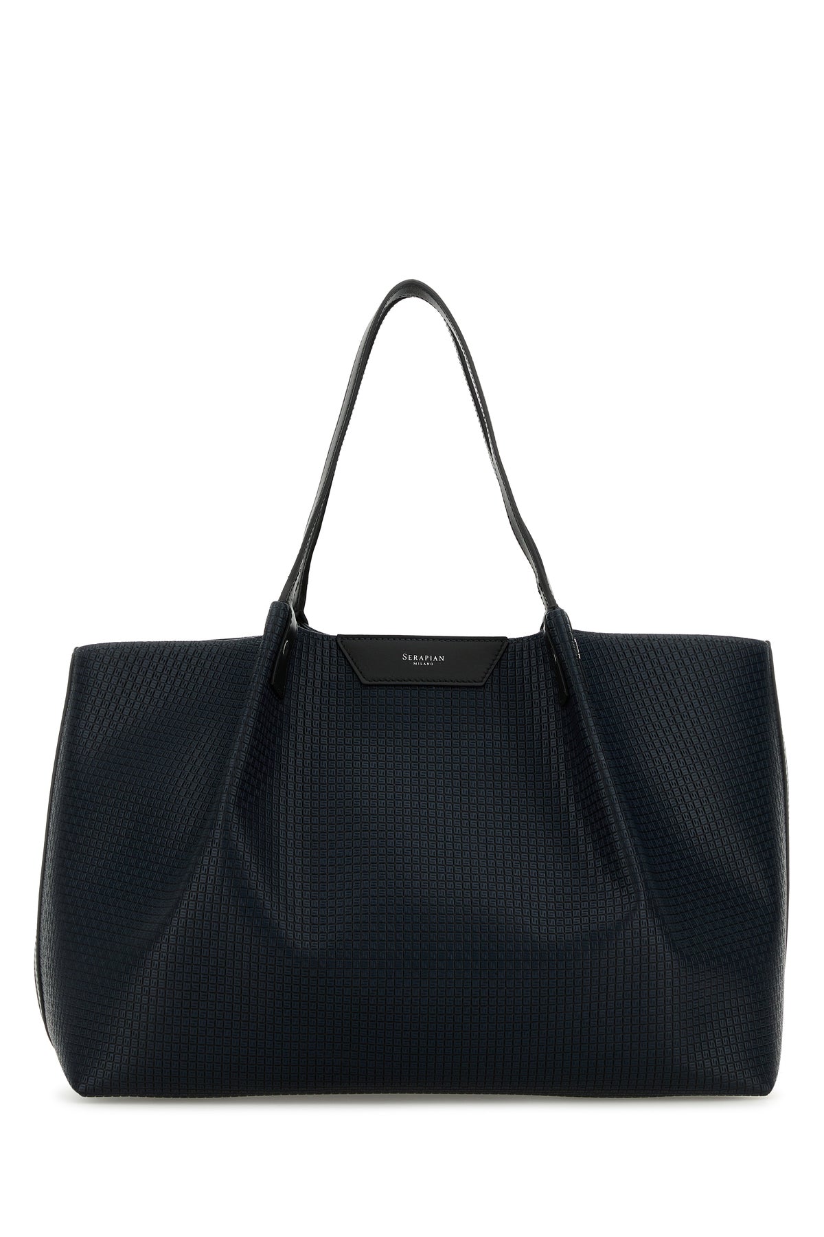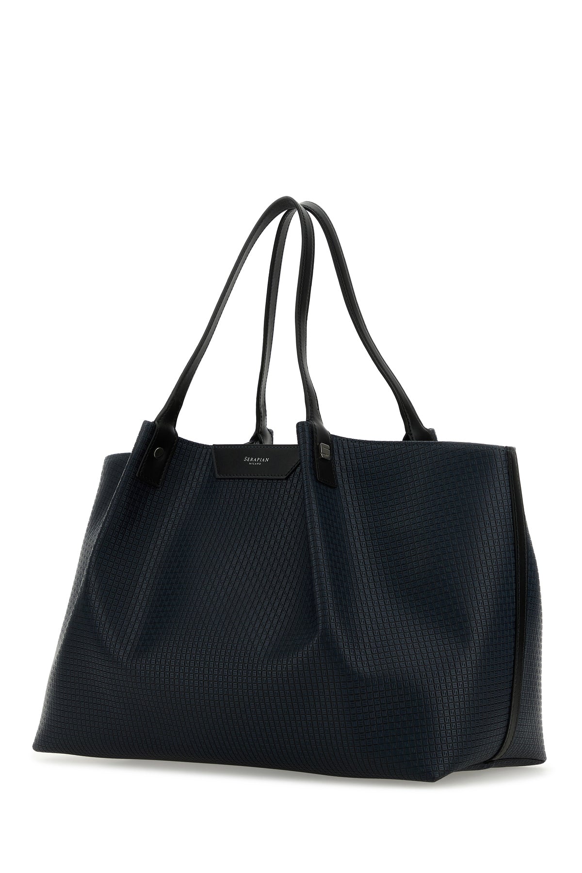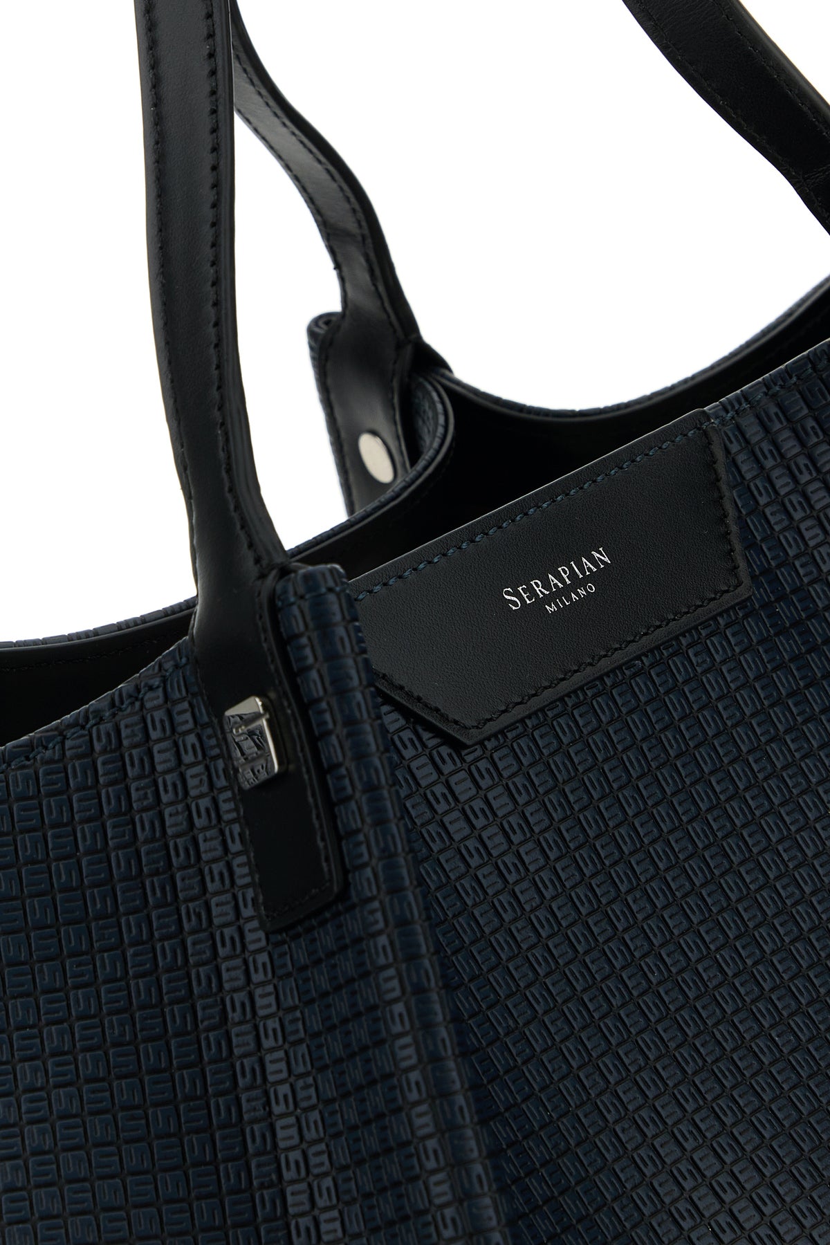 Shopping bag realized in peculiar logoed embossed motif synthetic leather characterized by laminated printed logo at the front.