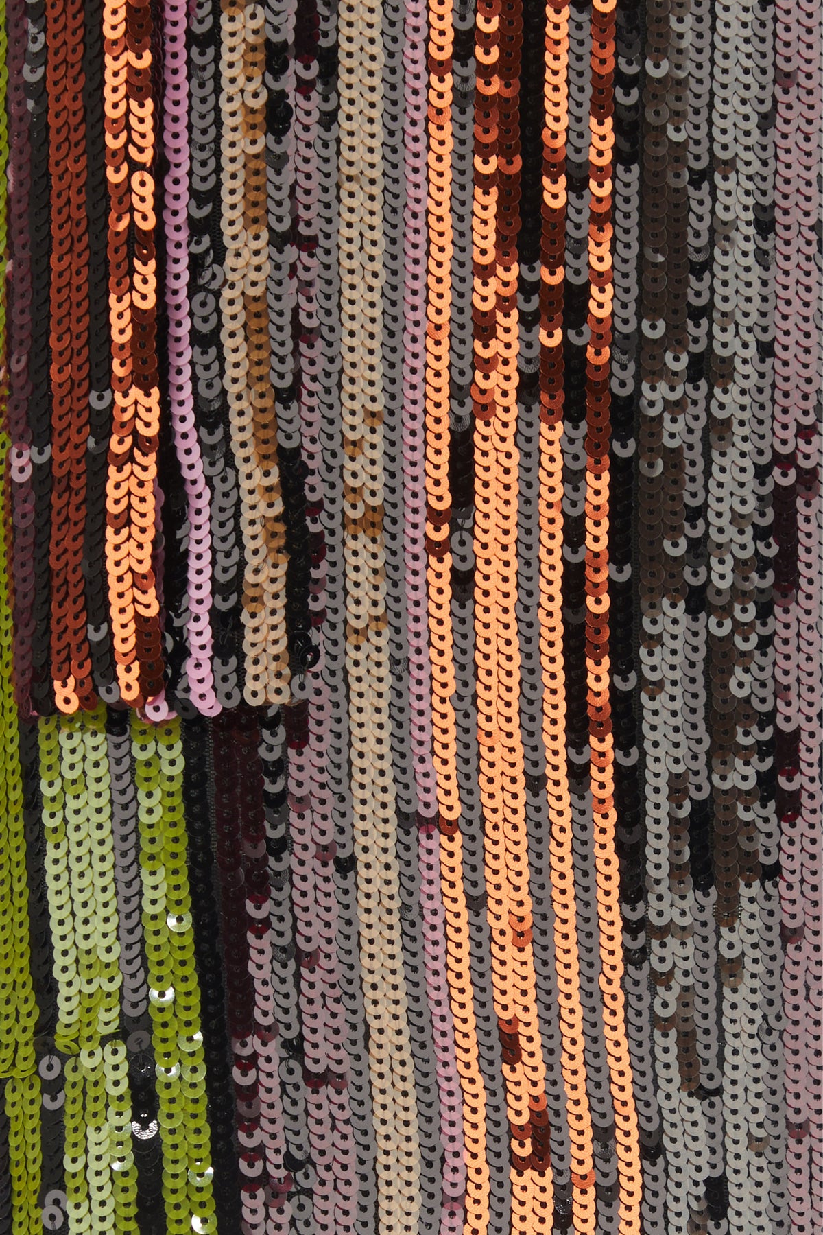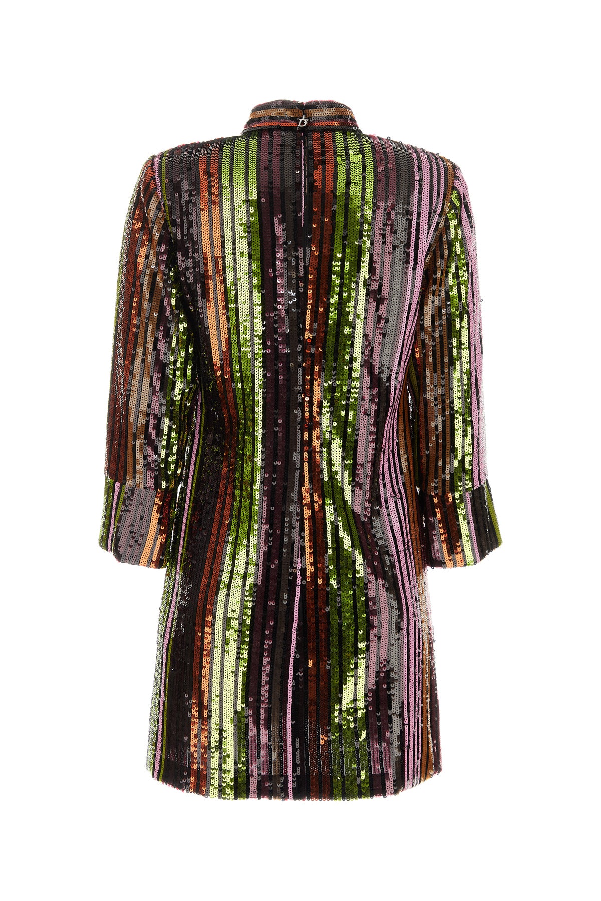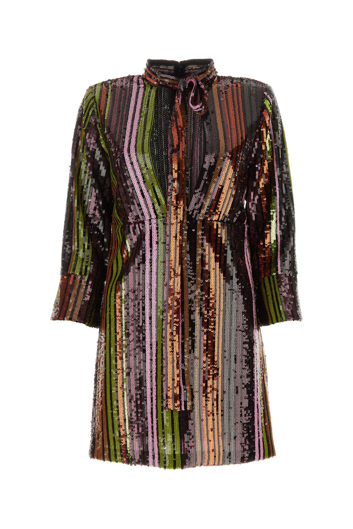 Mini dress realized in sequins characterized by ribbon to tie on the neck.