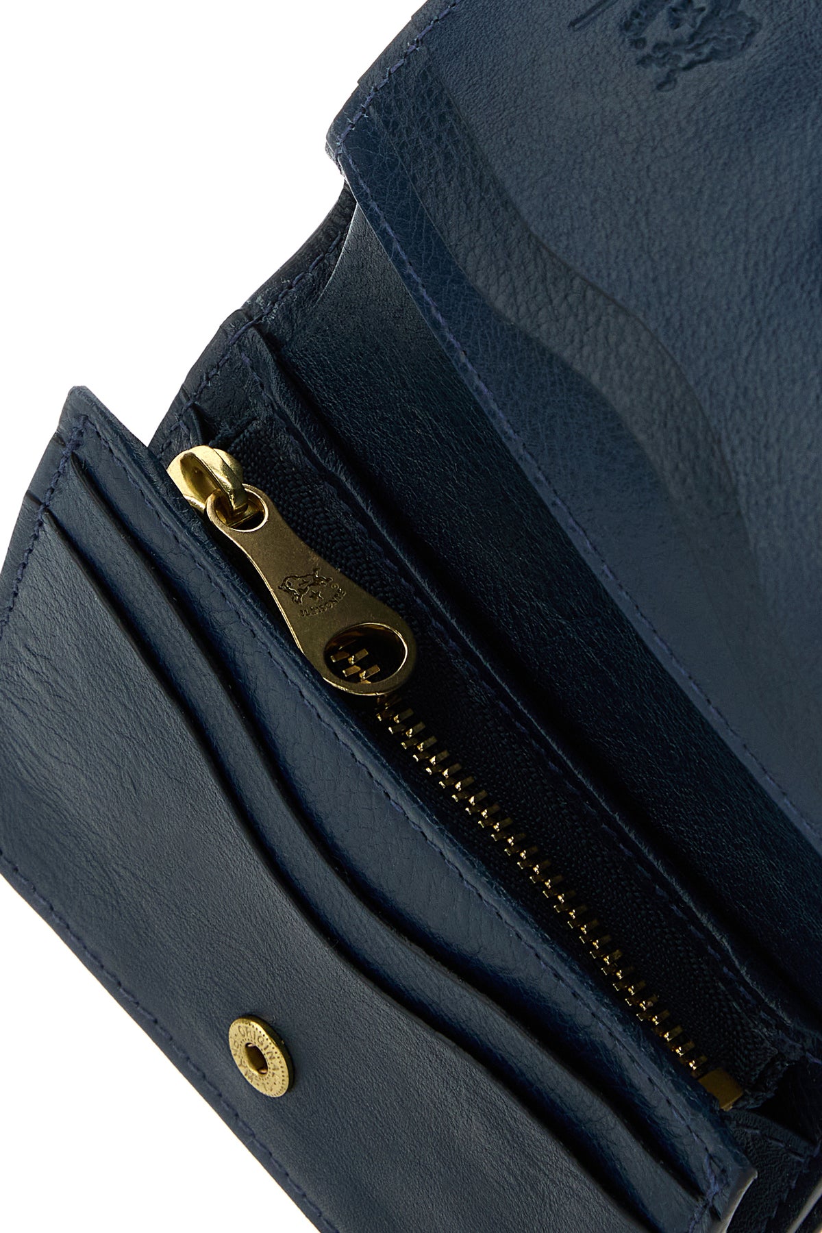 - Interior with a bill compartment, a coin pocket, two slit pockets and four credit card slots