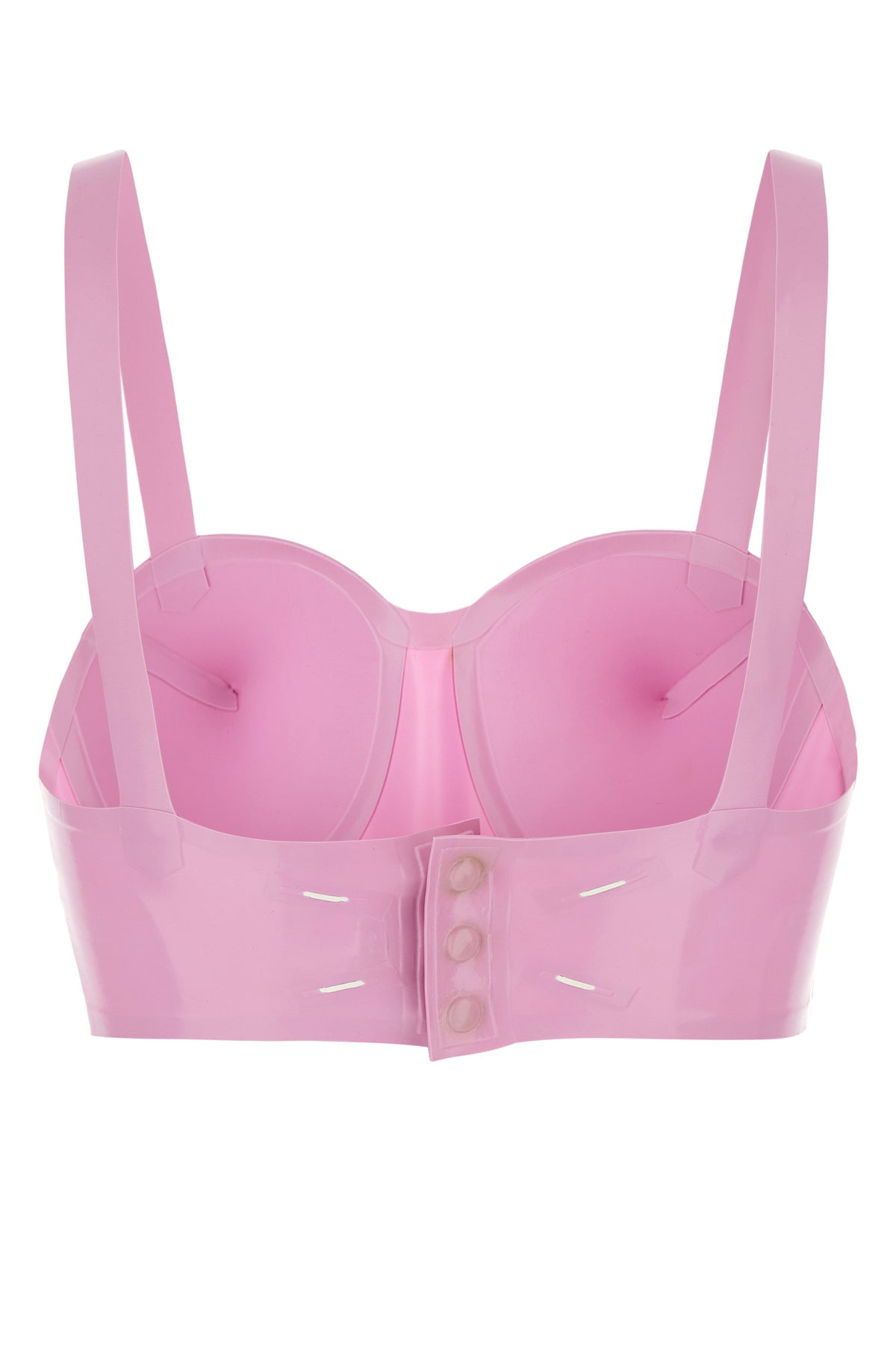 Crop-top realized in rubber characterized by iconic contrasting stitchings at the back.