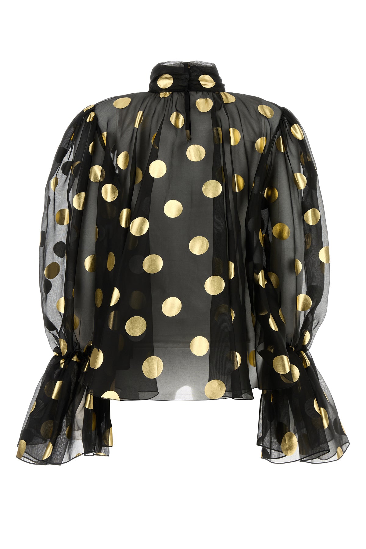 Blouse realized in pure silk organza characterized by laminated polka dot print on the entire surface.