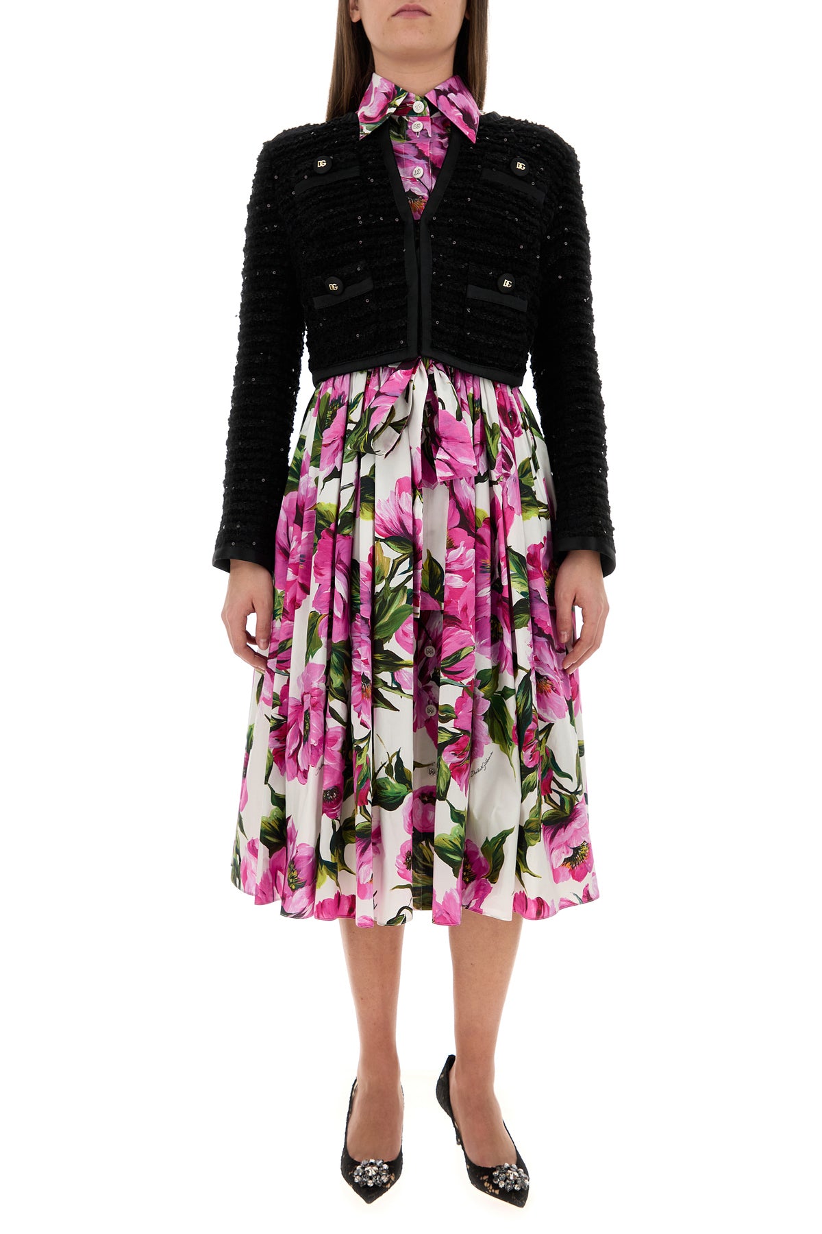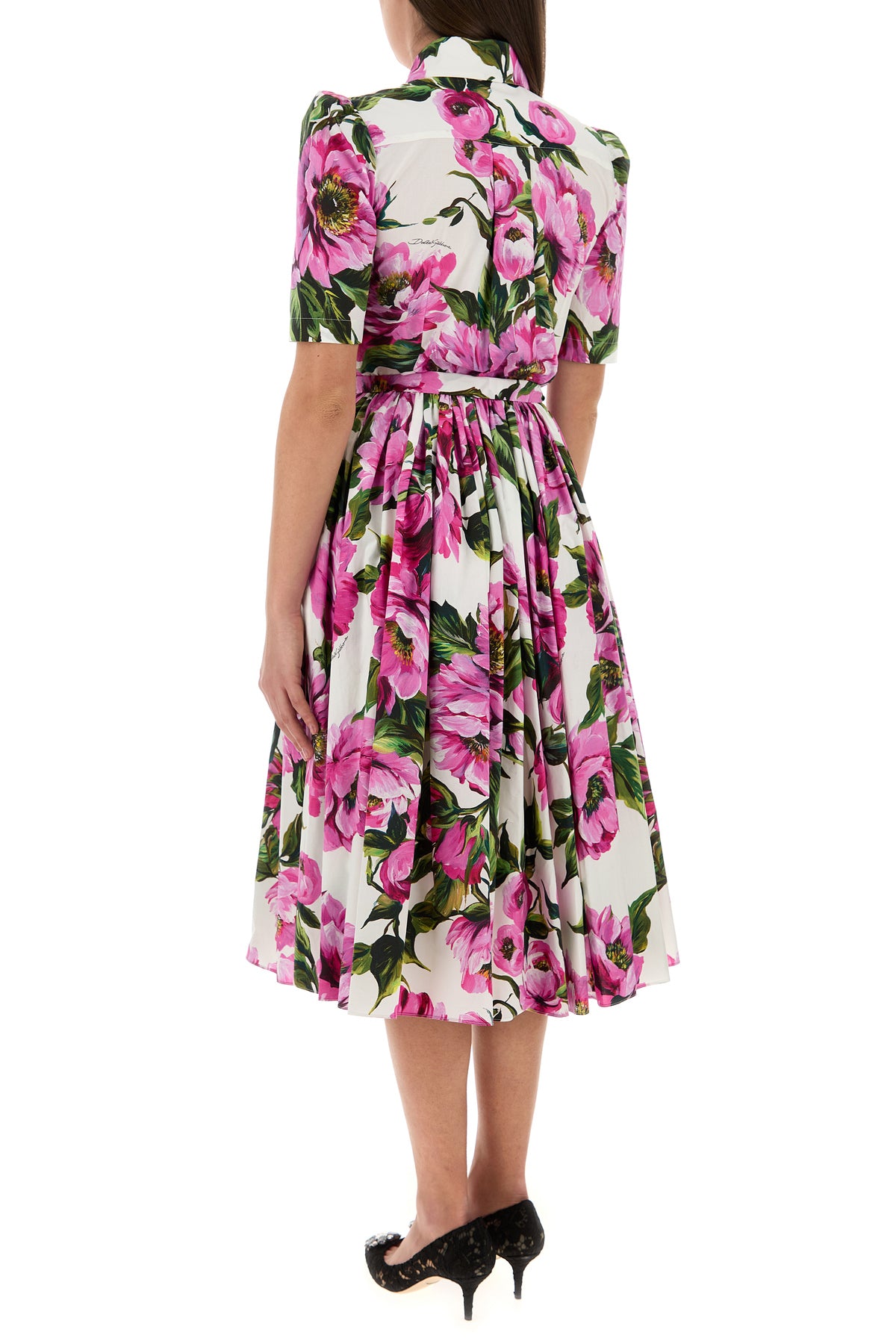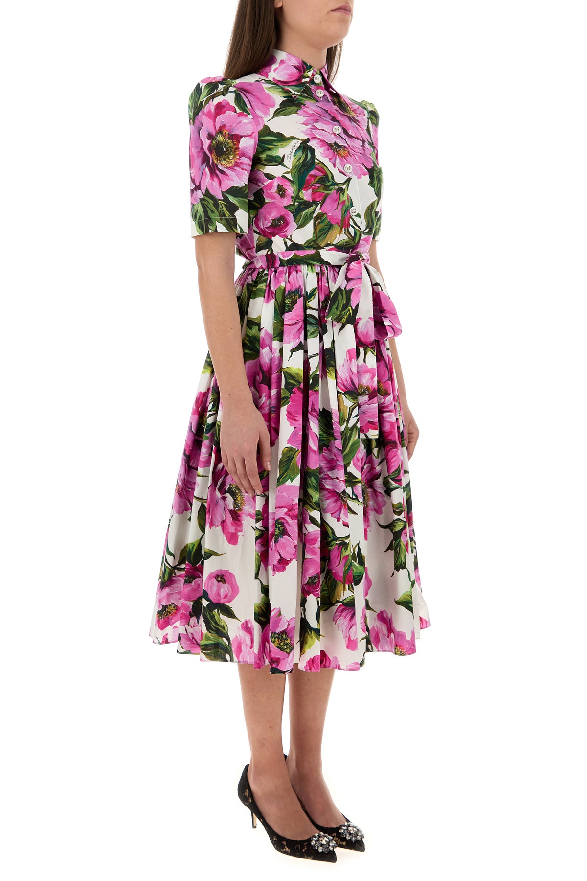 Shirt dress realized in pure cotton poplin characterized by floral print on the entire surface.