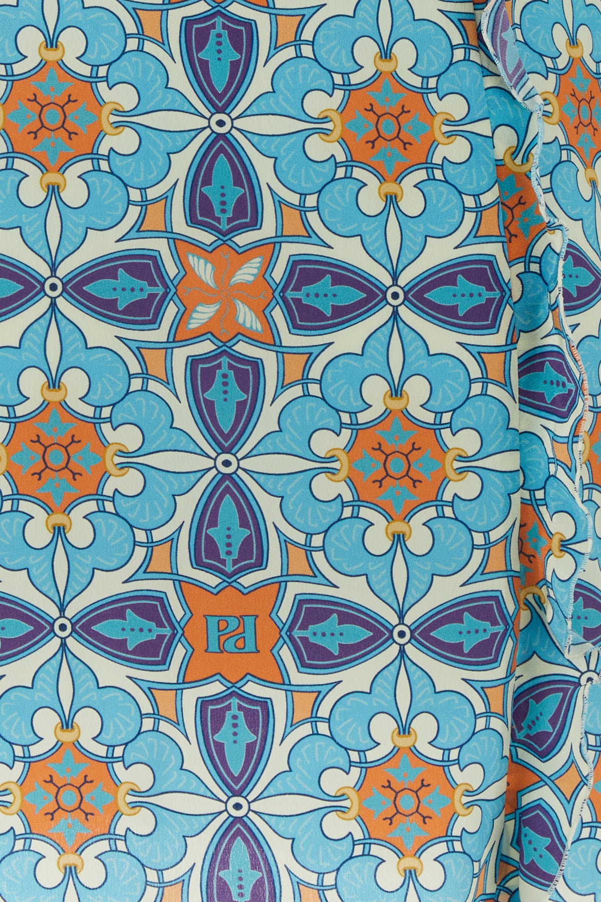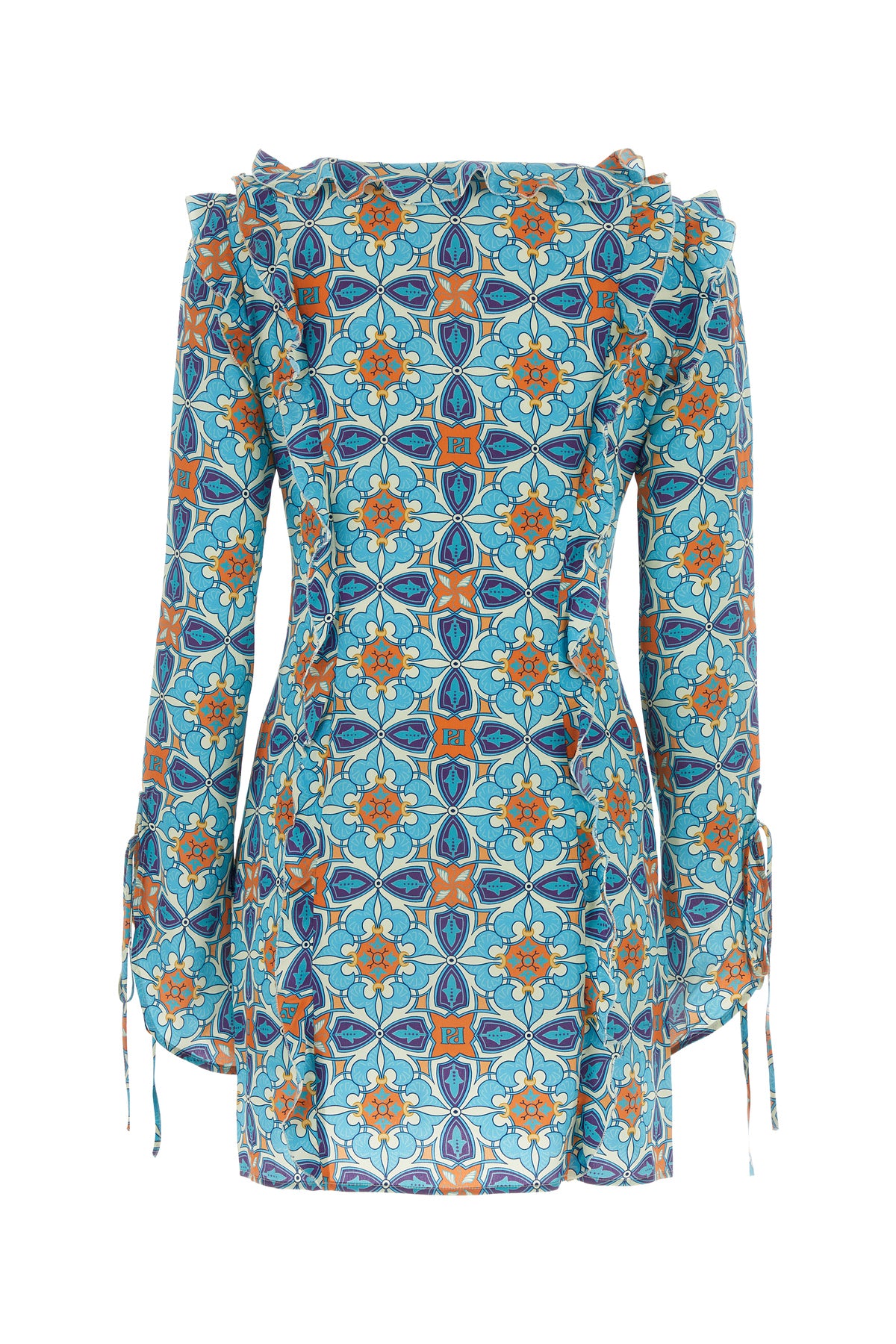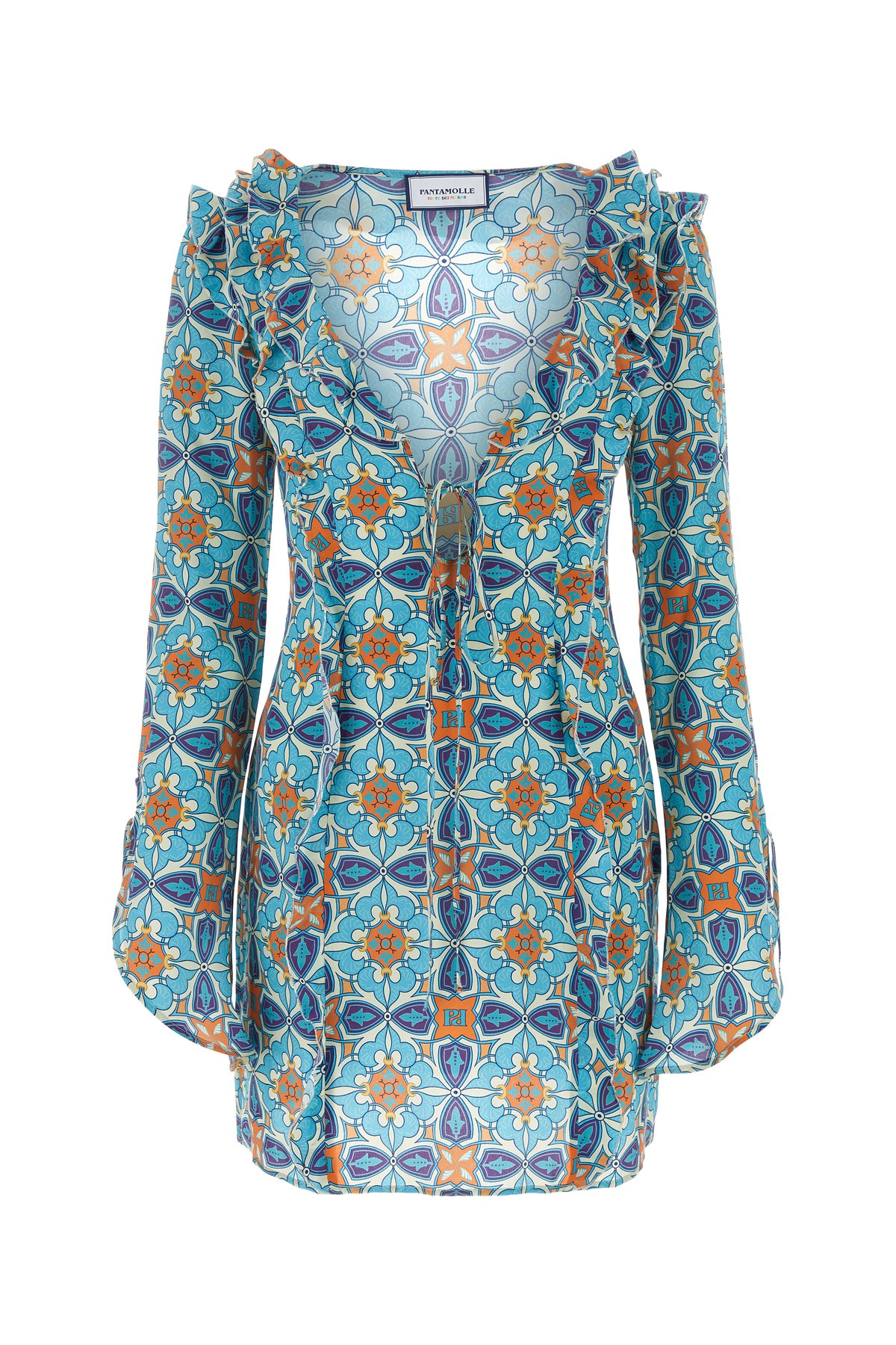 Mini dress realized in pure silk characterized by peculiar print on the entire surface enriched by ruffles at the top.