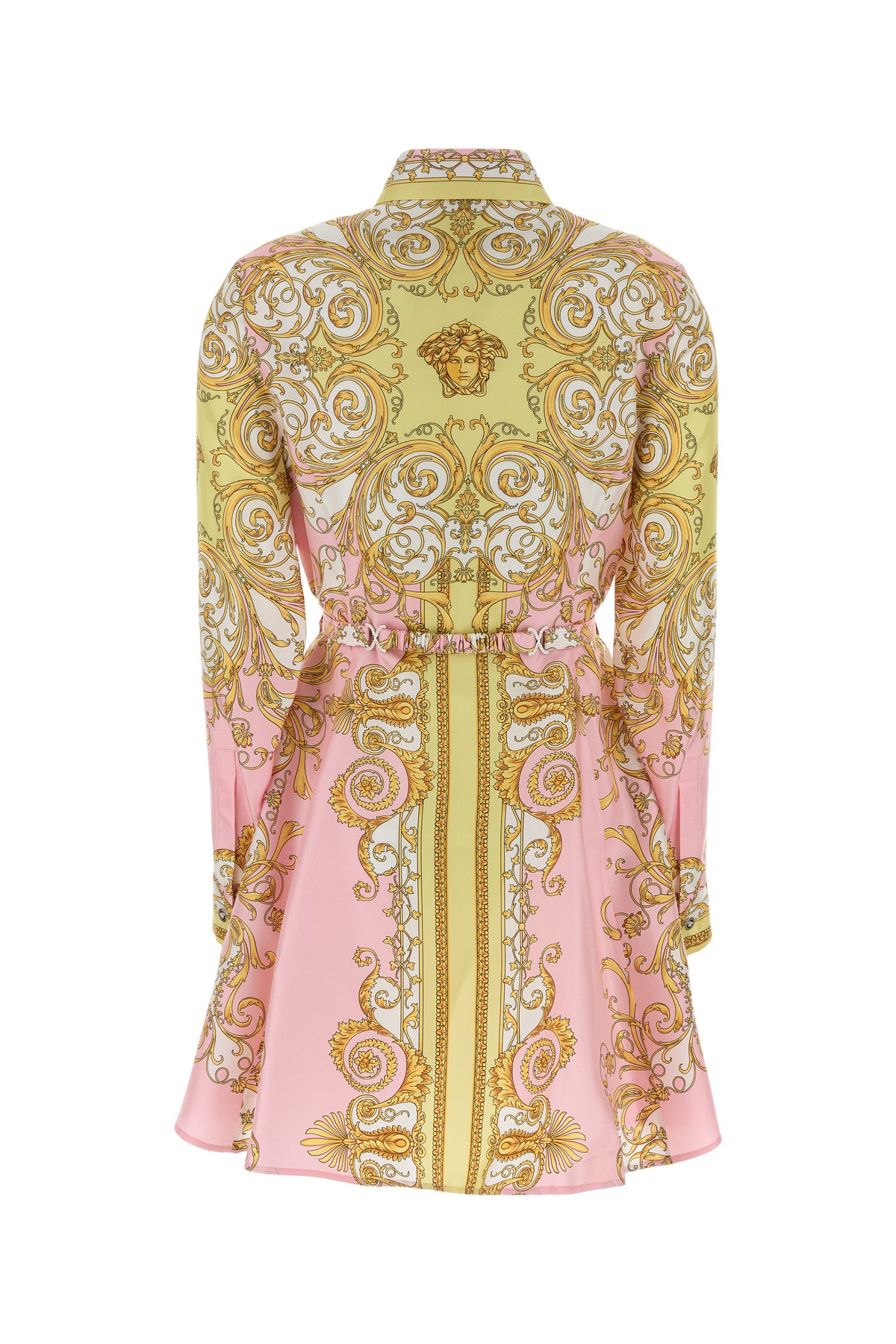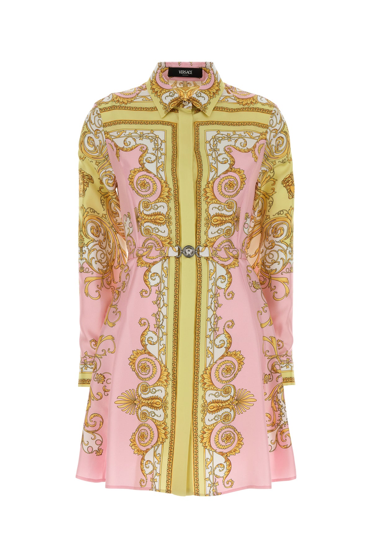 Shirt dress realized in pure silk twill characterized by Barocco print on the entire surface.