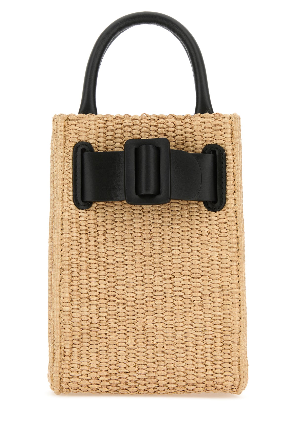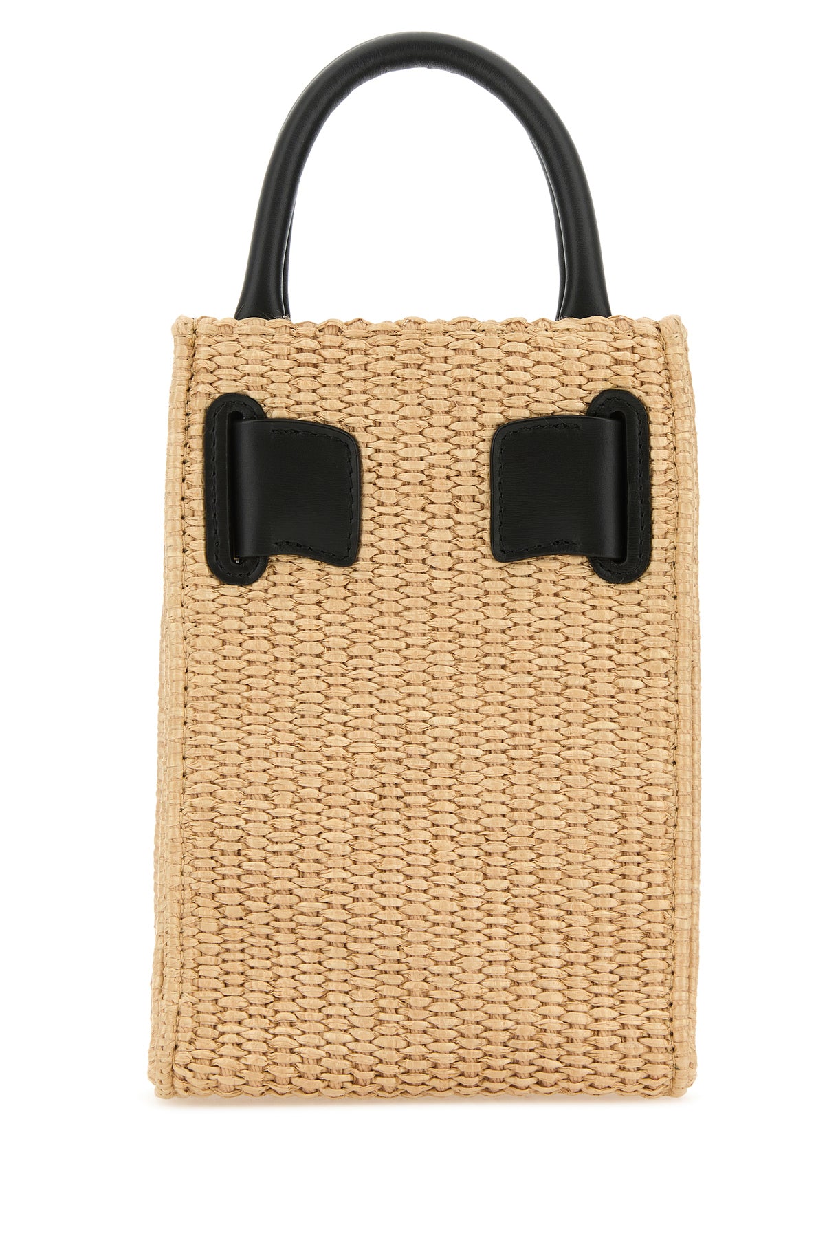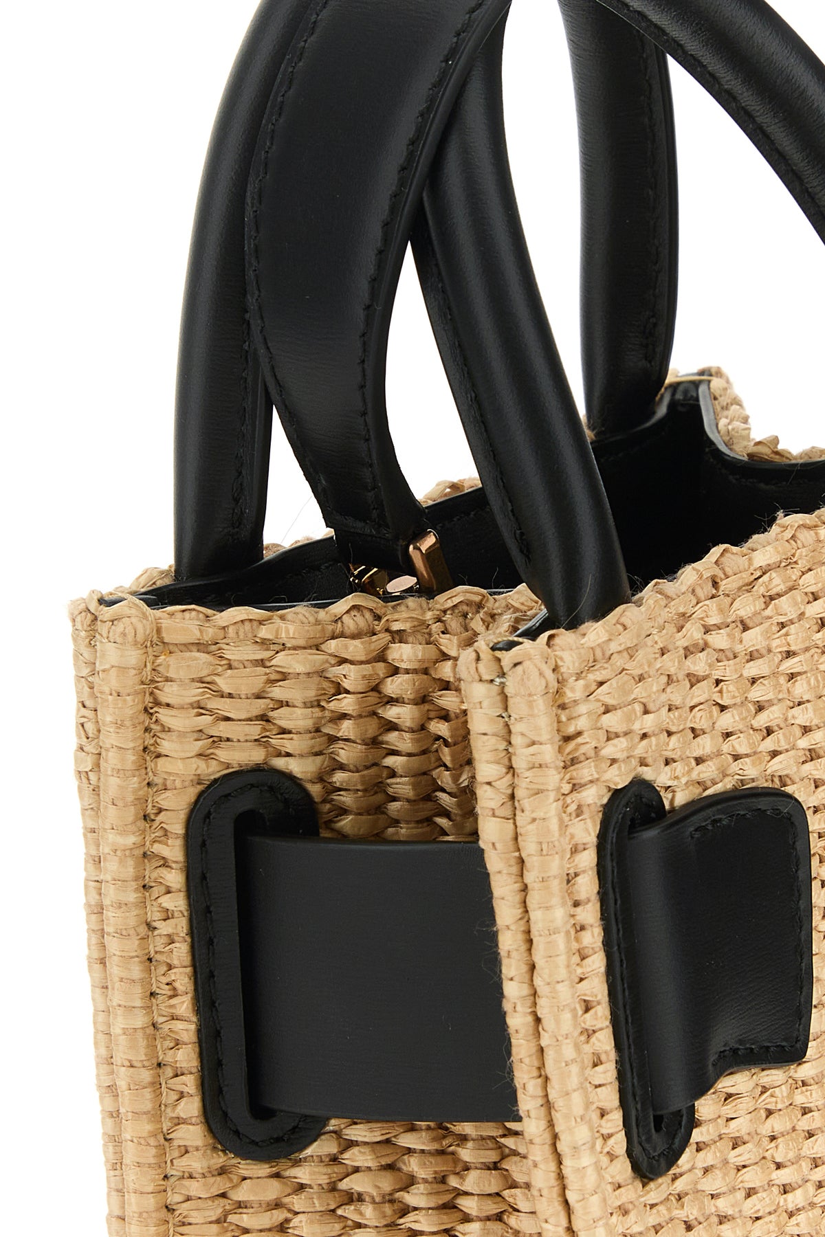 Handbag realized in raffia with leather inserts enriched by decorative strap with buckle.