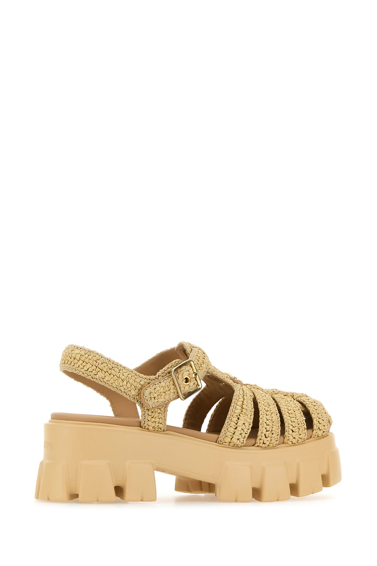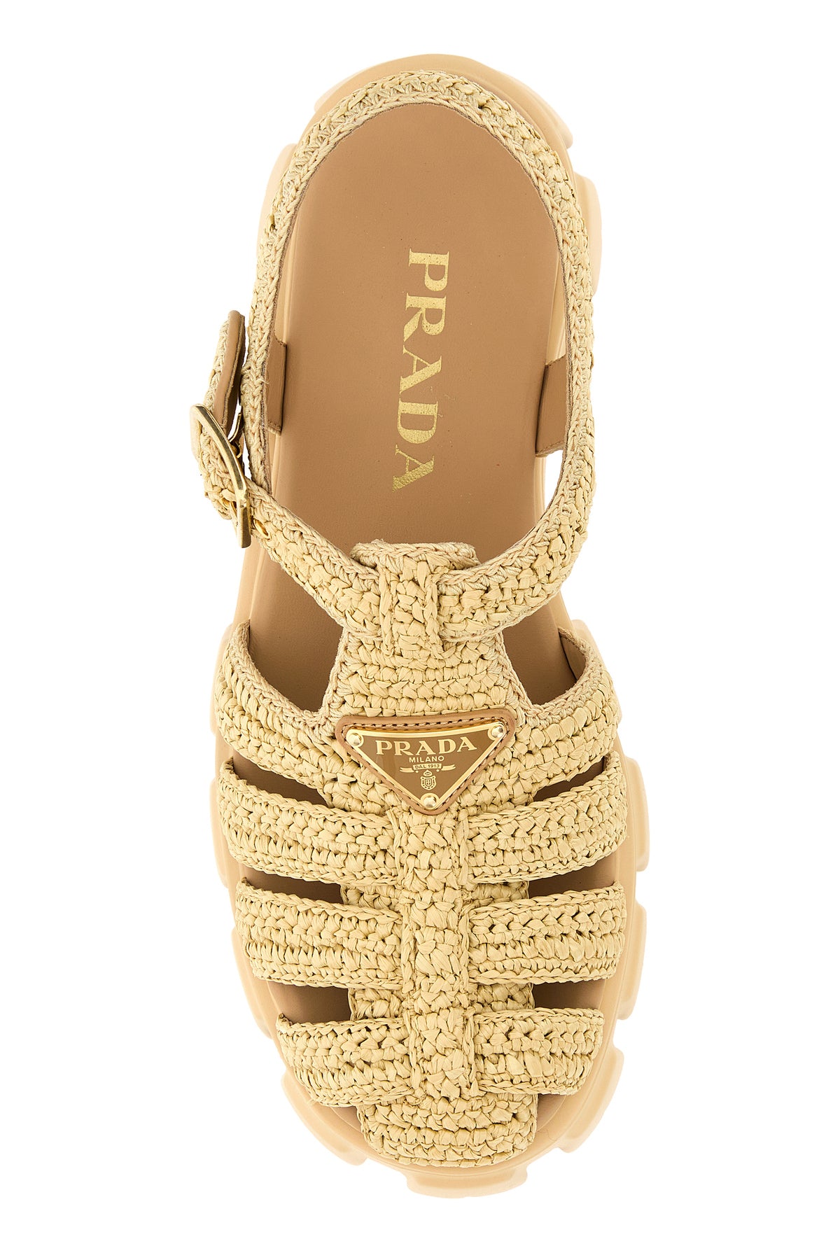 Sandals realized in woven raffia characterized by embossed logo at the back enriched by iconic metal logoed triangle on the instep.