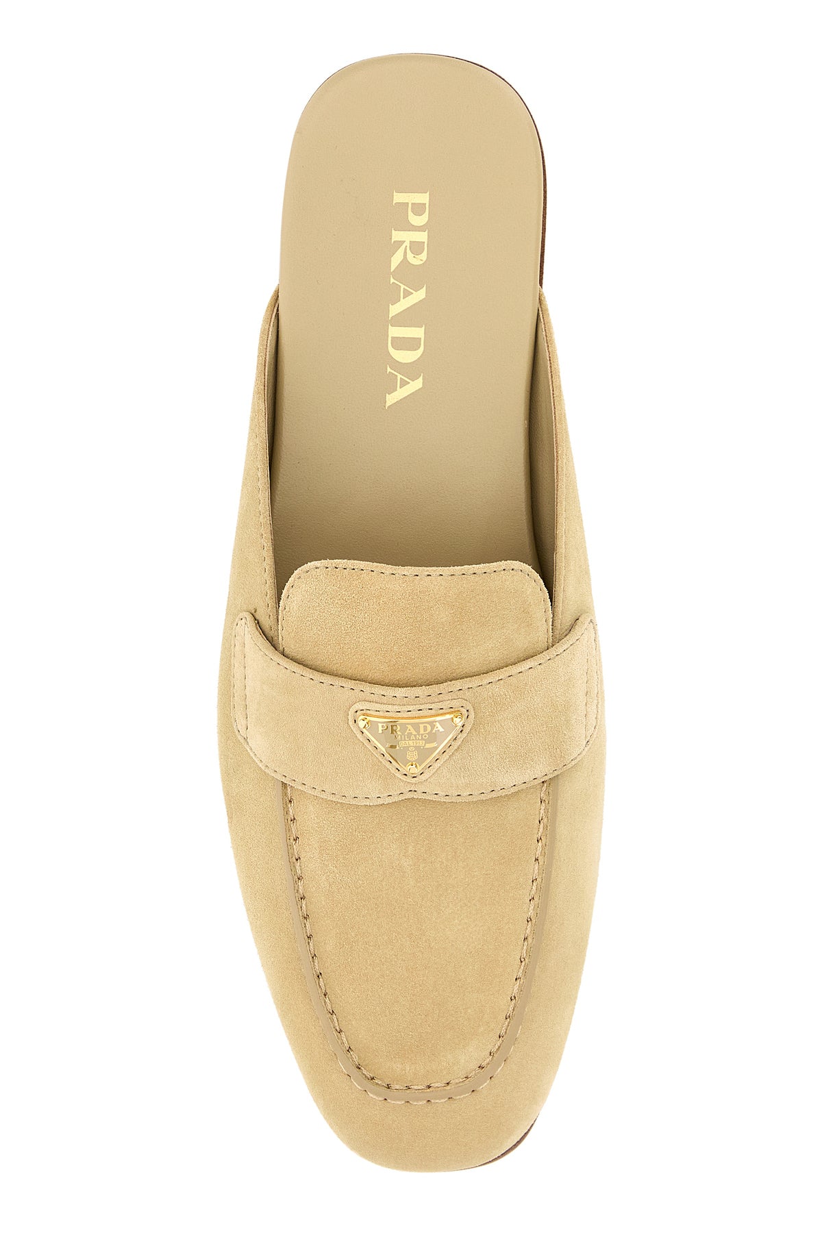 Slippers realized in calf suede enriched by iconic logoed metal triangle on the vamp.