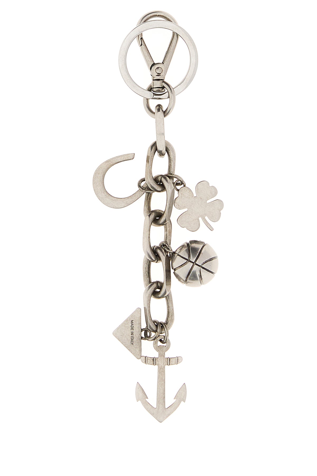 Key ring realized in silver-tone pleated metal.
