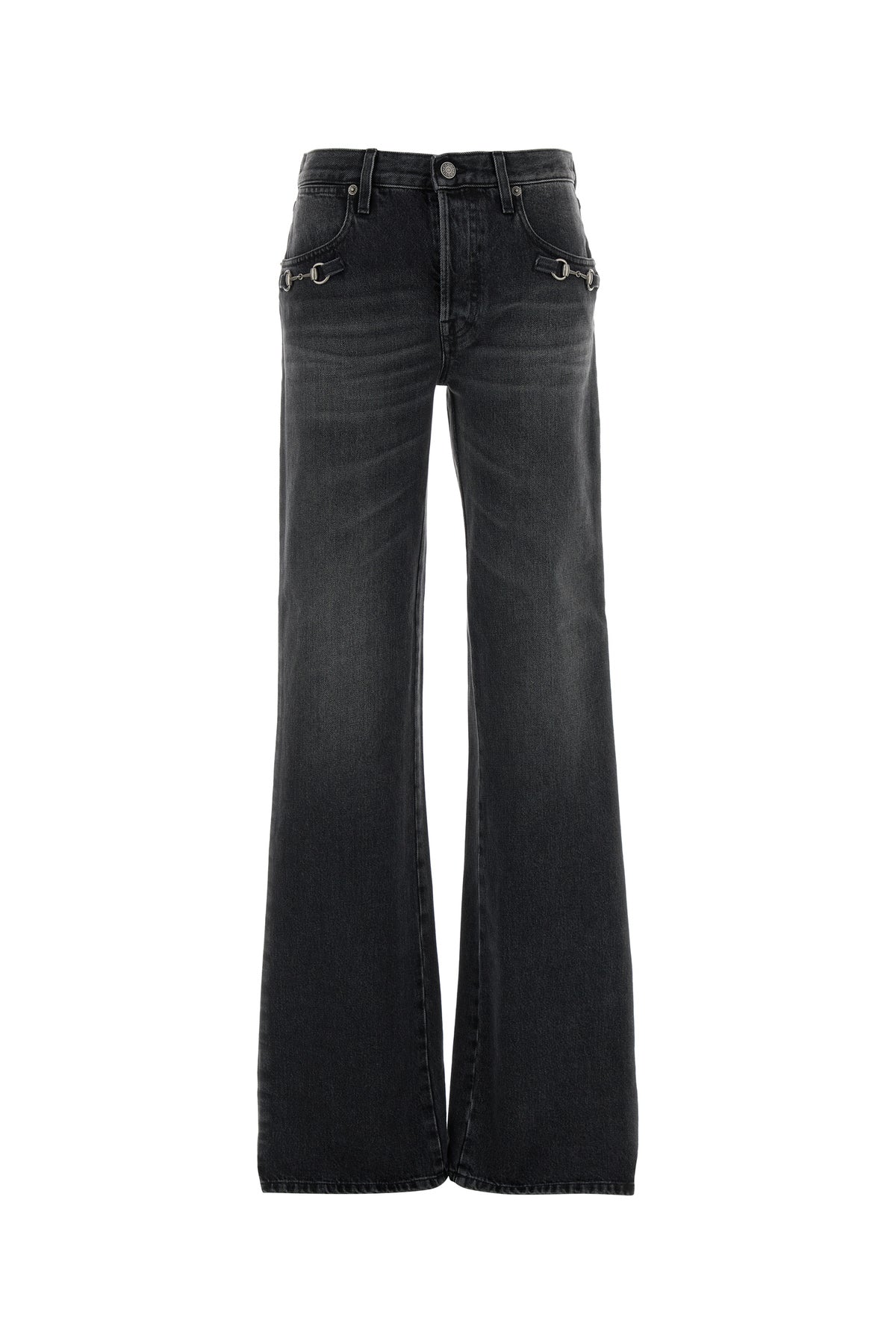 Wide-leg jeans realized in stonewashed pure cotton denim enriched by Horsebit metal details at the front.