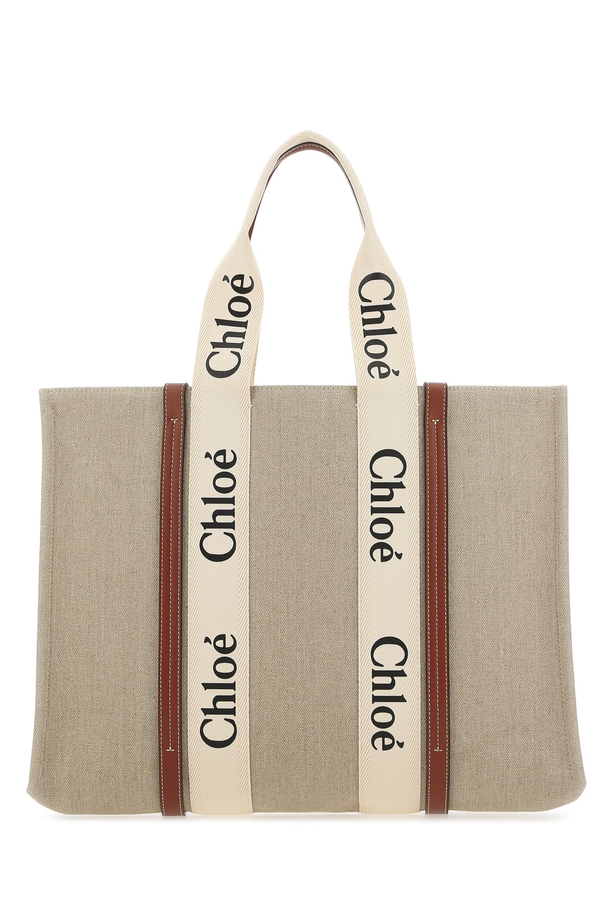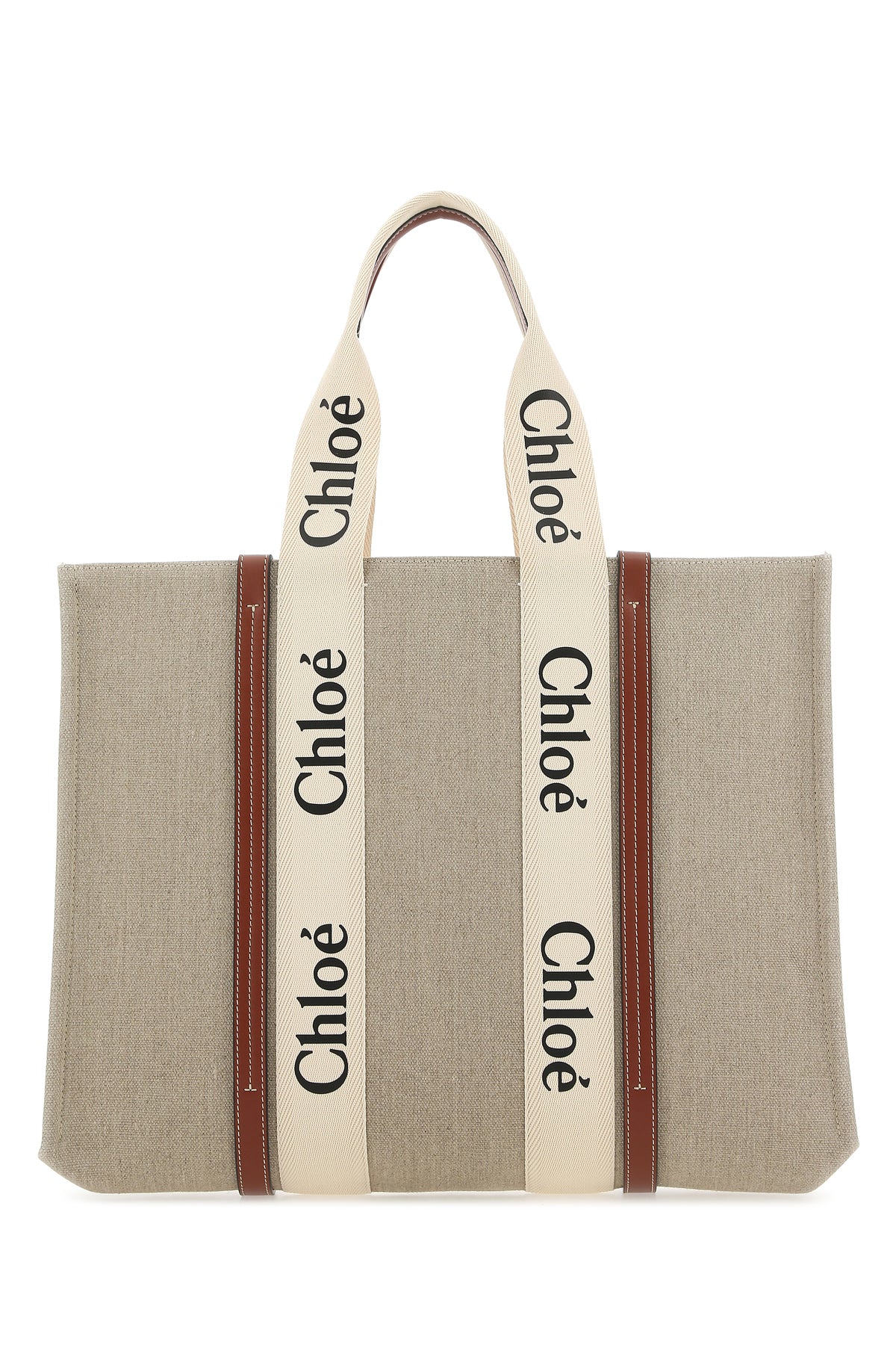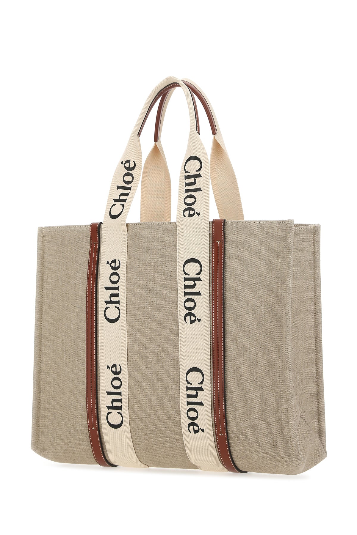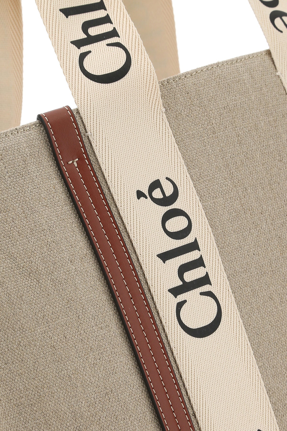 Shopping bag realized in pure cotton canvas with leather inserts enriched by Woody ribbons at the front and at the back.