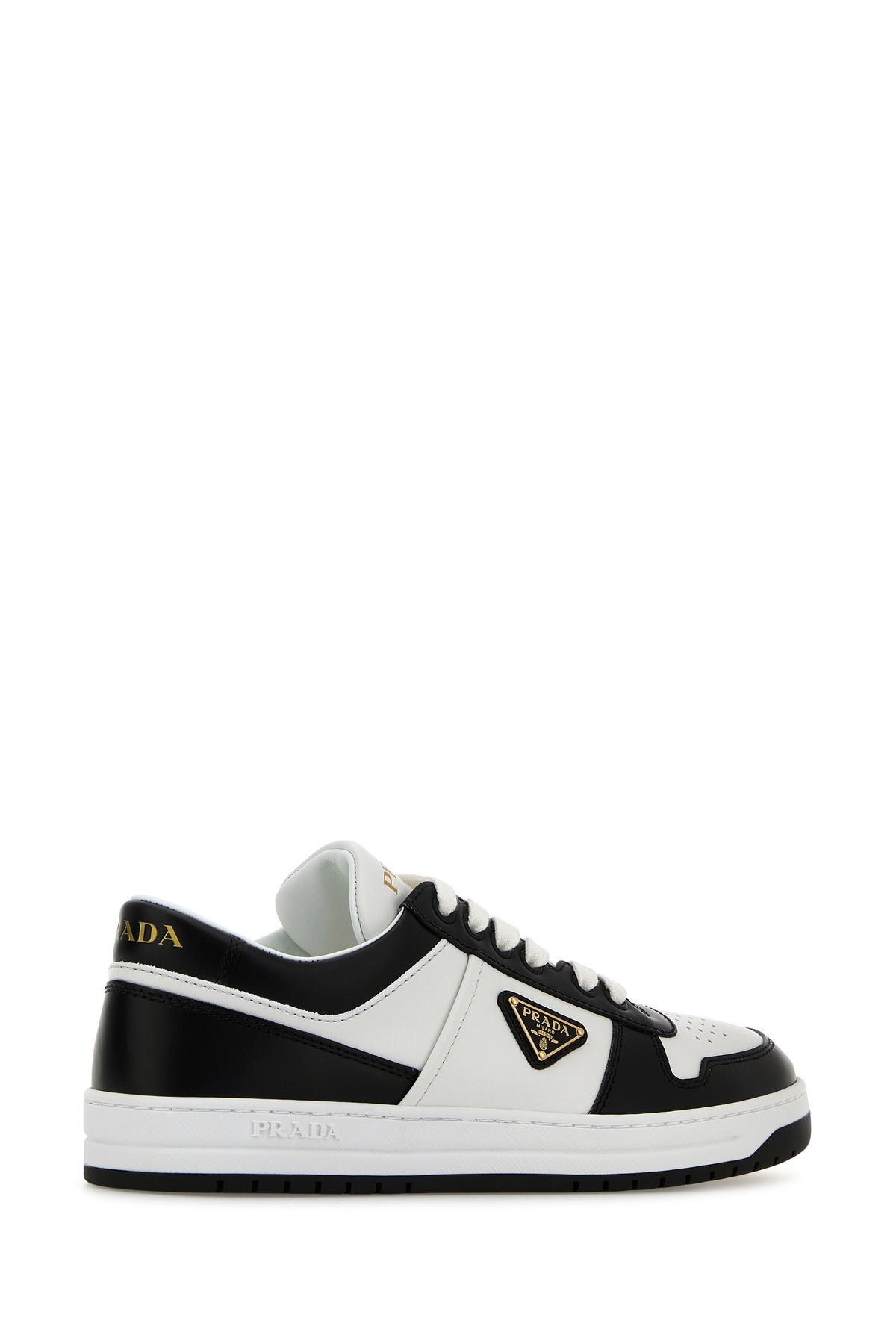 Sneakers realized in smooth calf leather characterized by laminated printed logo on the heel enriched by iconic logoed triangle on the side.