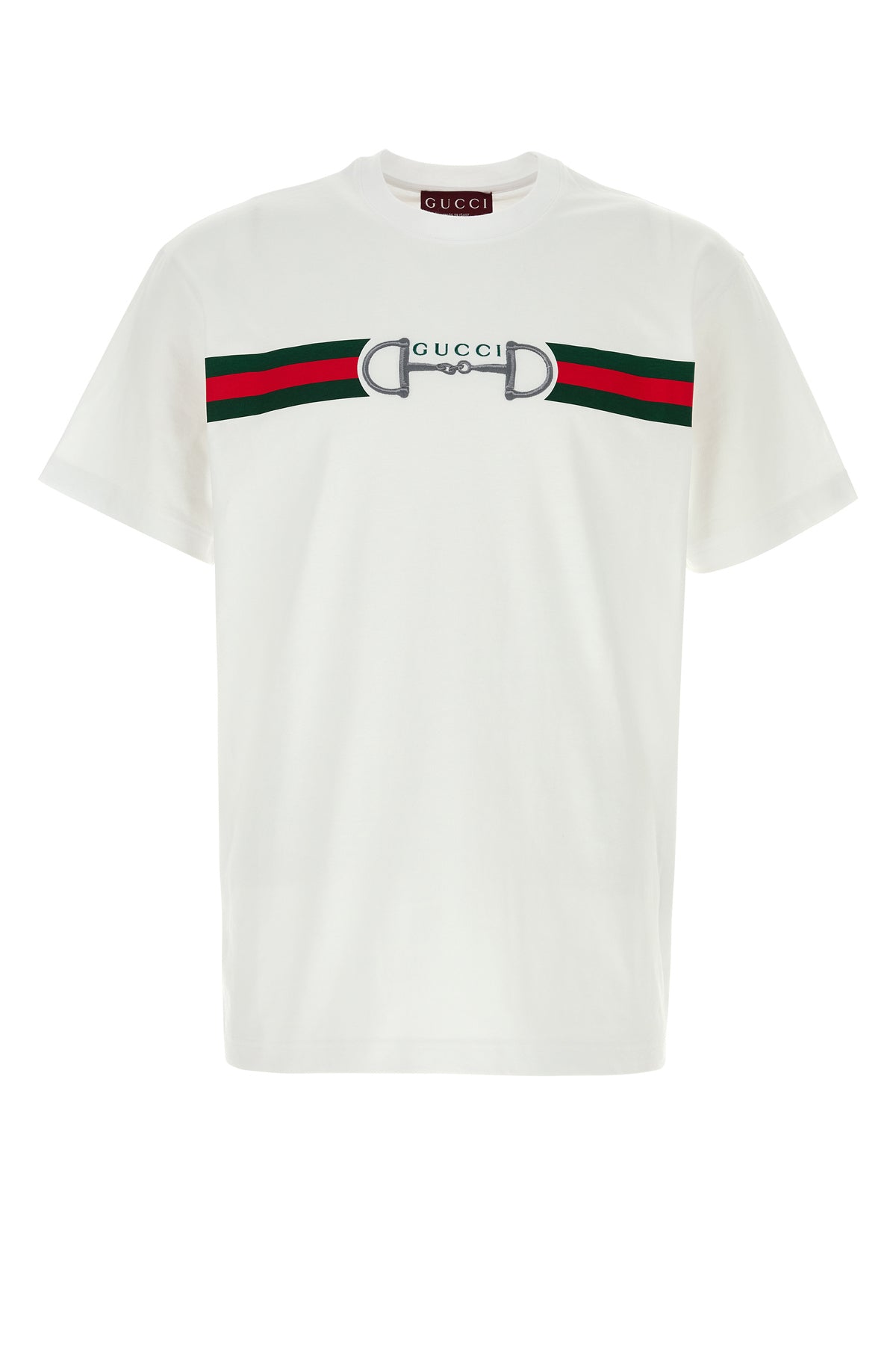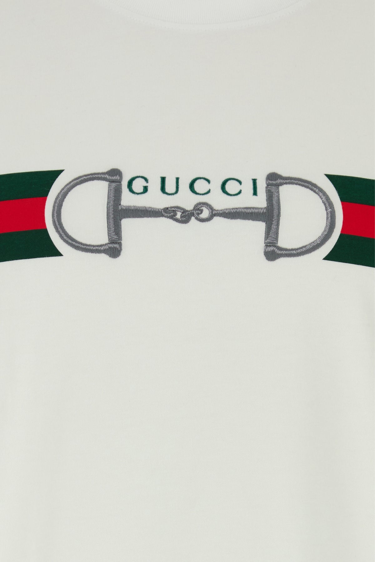 T-shirt realized in pure cotton characterized by Gucci Horsebit embroidery and Web print on the chest.