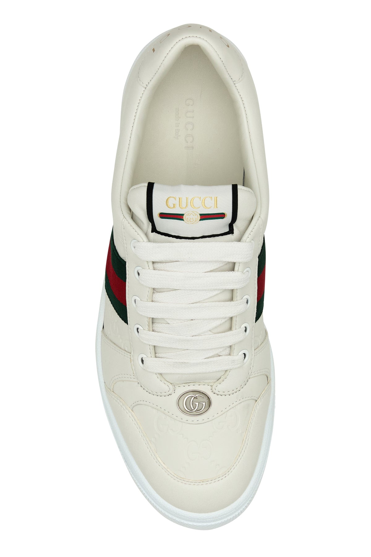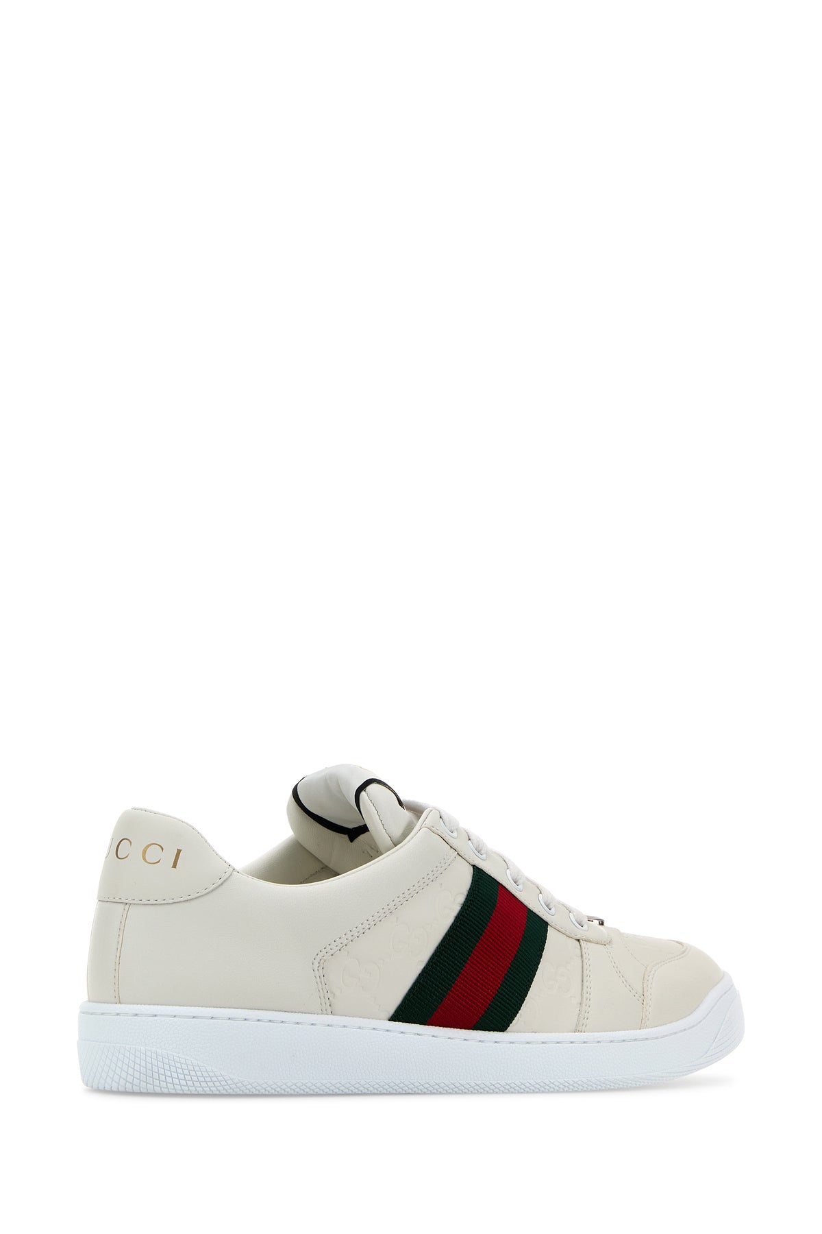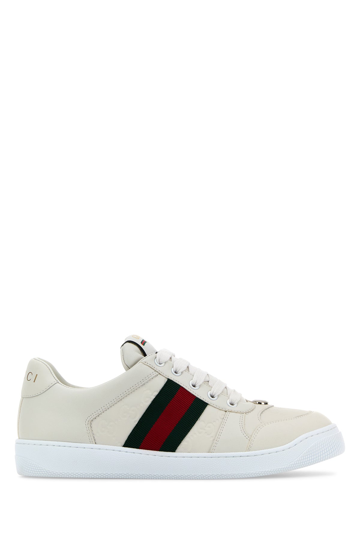 Sneakers realized in smooth leather and GG motif embossed leather characterized by contrasting printed logo at the back enriched by metal logoed detail at the front and Nastro Web on the sides.