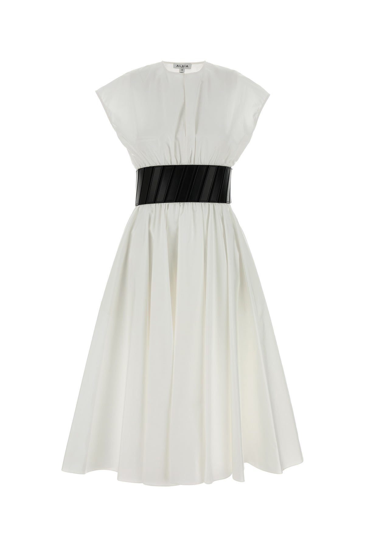 Dress realized in pure cotton poplin with contrasting leather inserts at the waist.