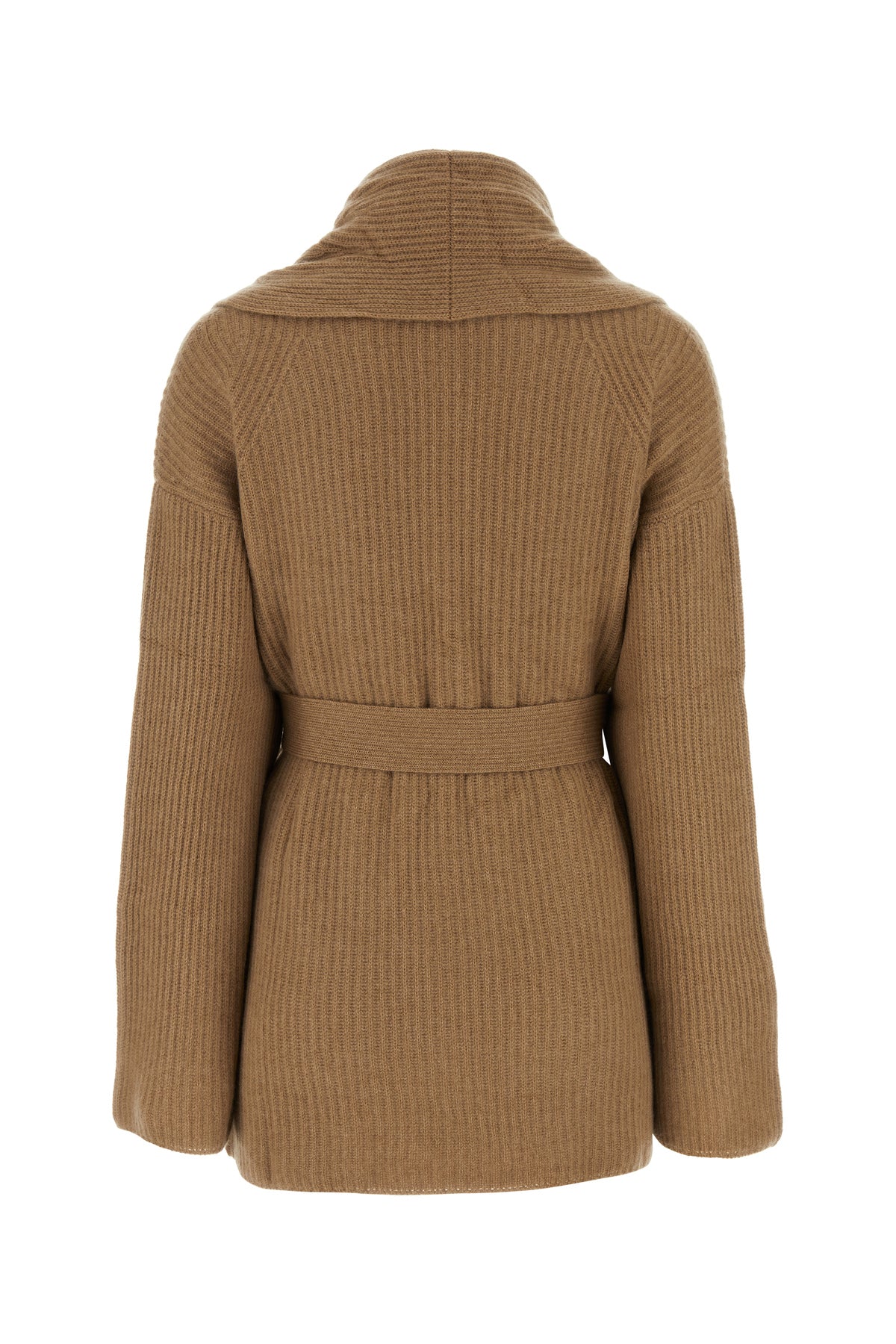 Cardigan realized in pure organic cashmere enriched by detachable tonal fabric belt.