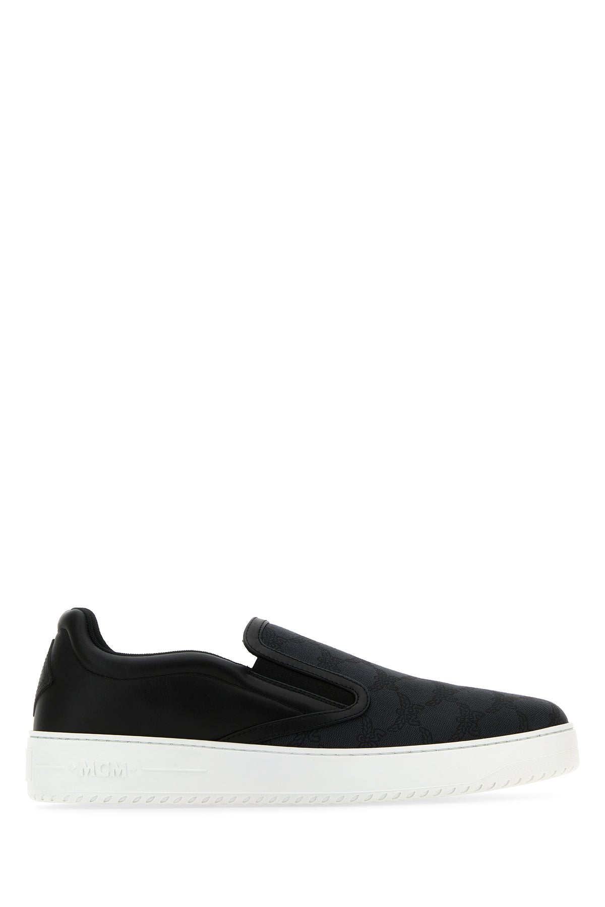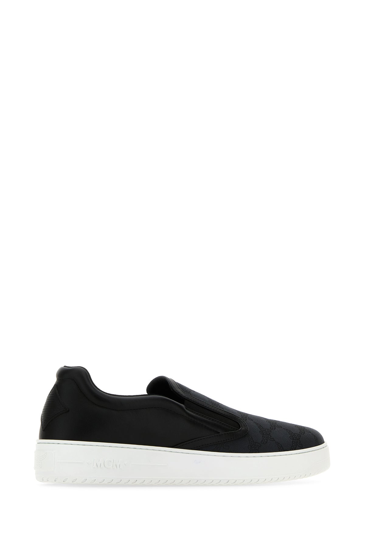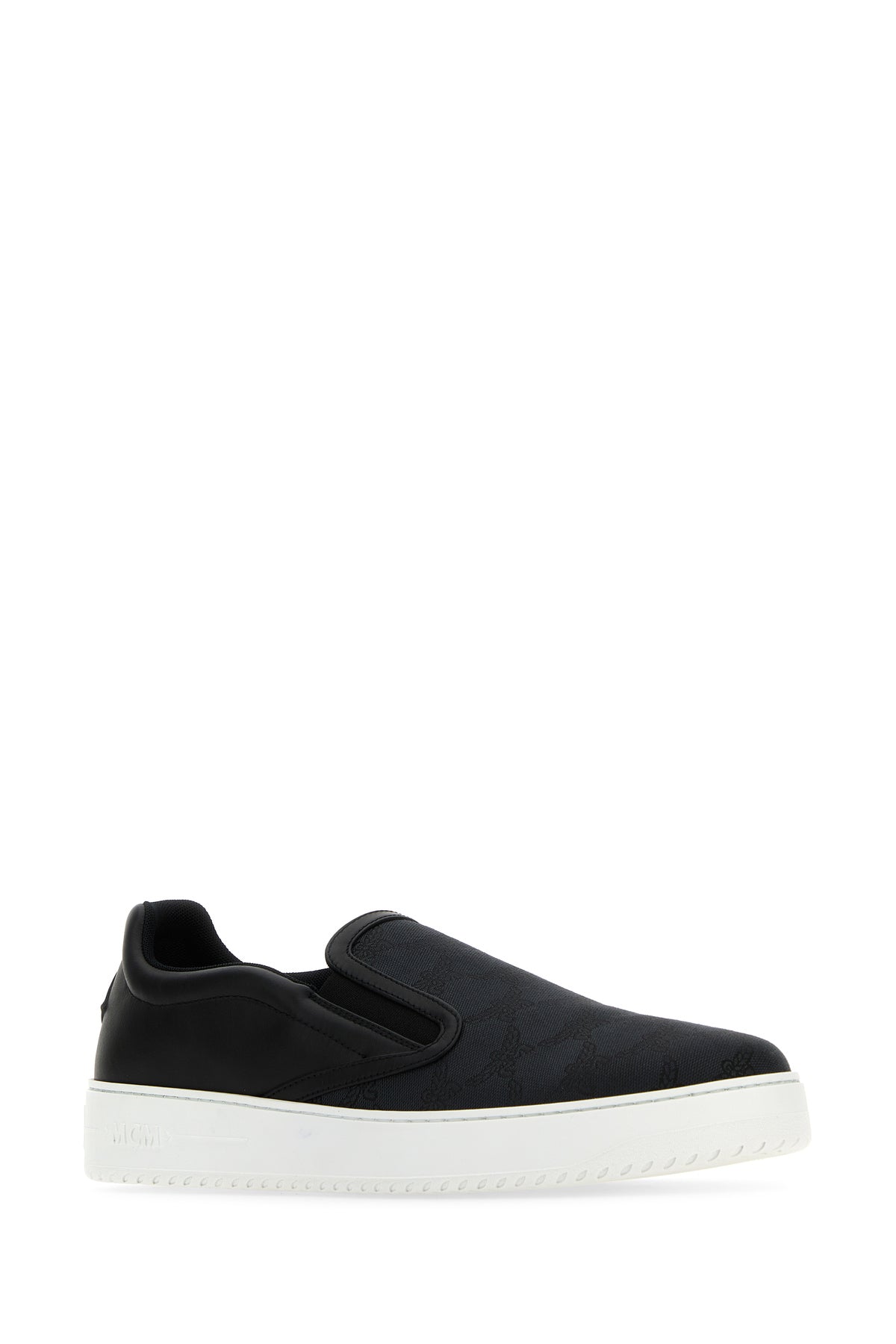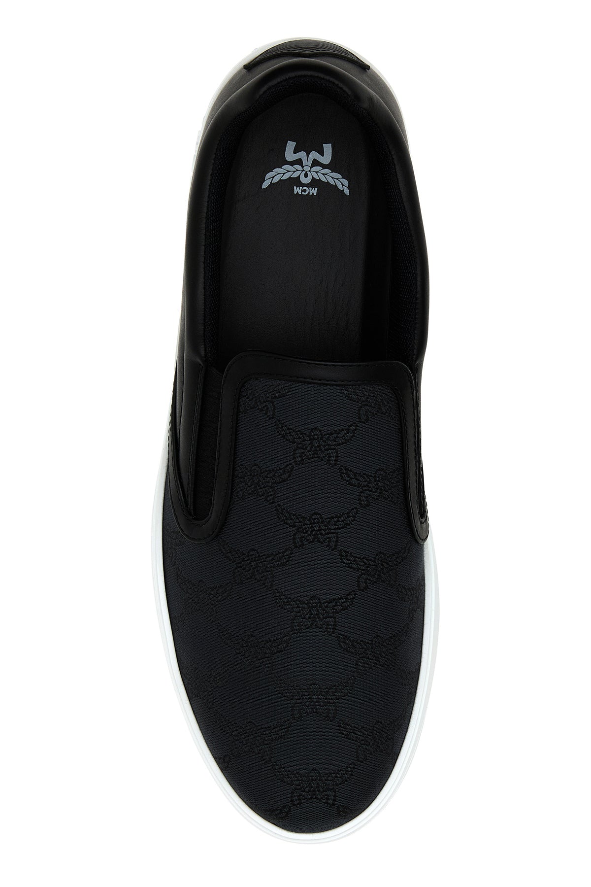 Slip ons realized in canvas with smooth leather insert at the back characterized by tonal Lauretos Monogram embroidery at the front and embossed MCM Logo at the back.