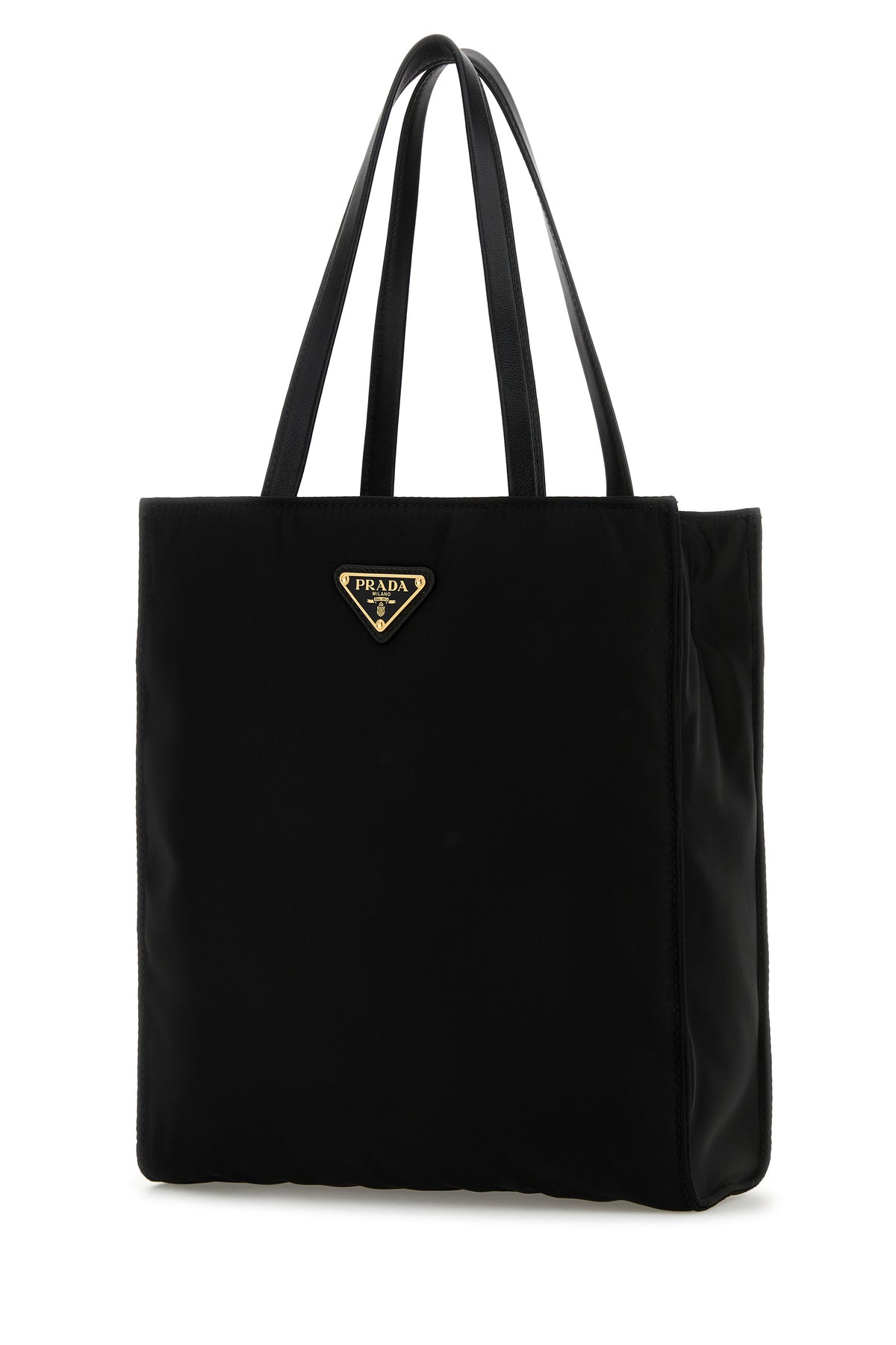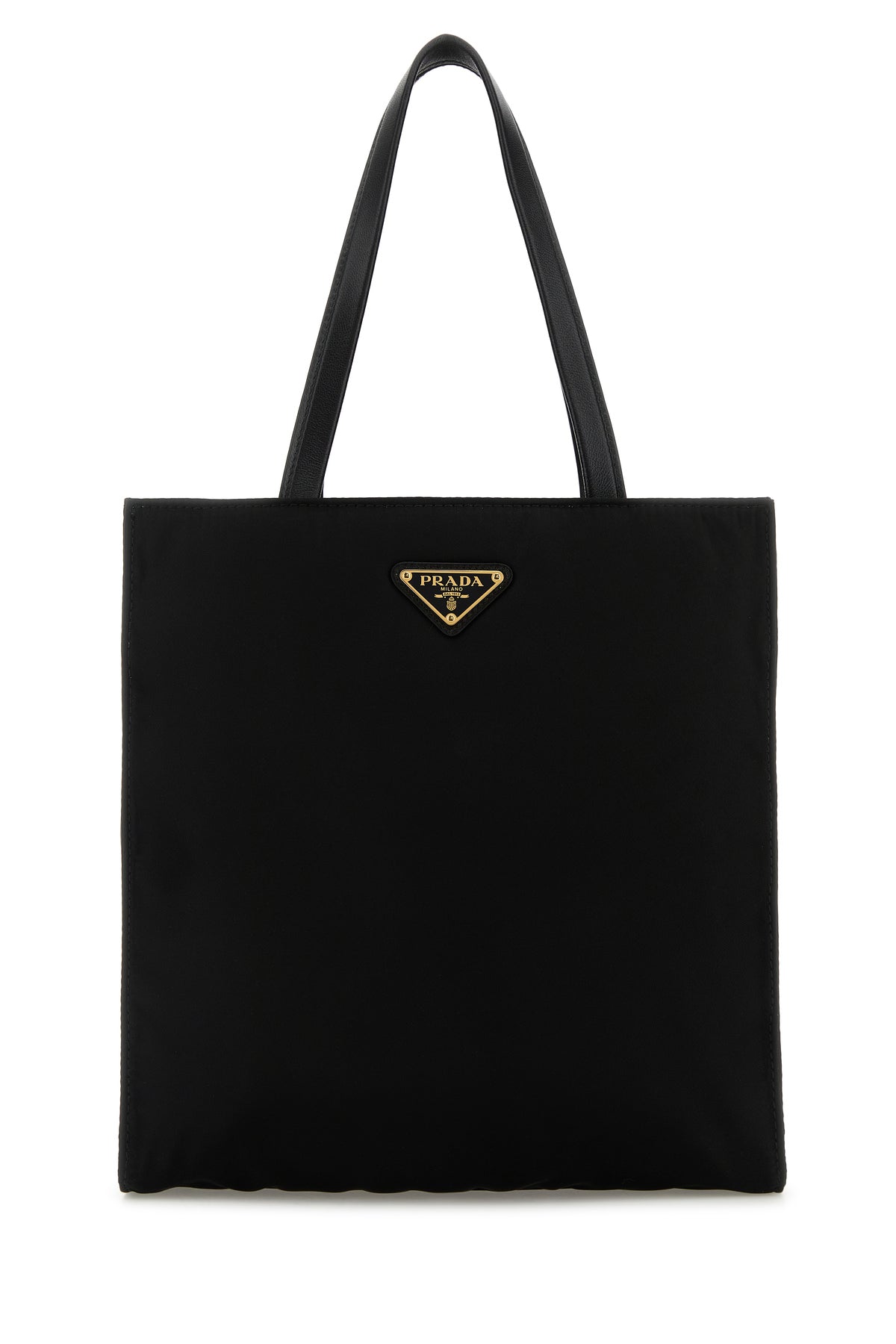 Shopping bag realized in canvas enriched by iconic logoed metal triangle at the front.