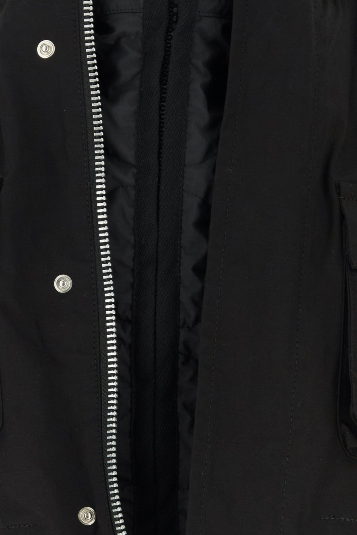 - Concealed zip and snap buttons closure