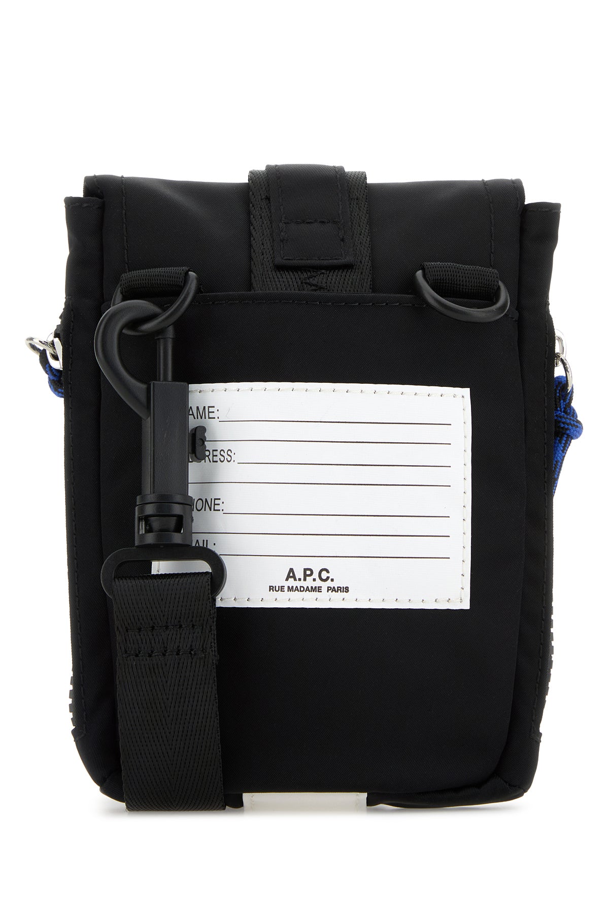 Crossbody bag realized in fabric characterized by contrasting printed logo at the front enriched by contrasting logoed label at the front and at the back.