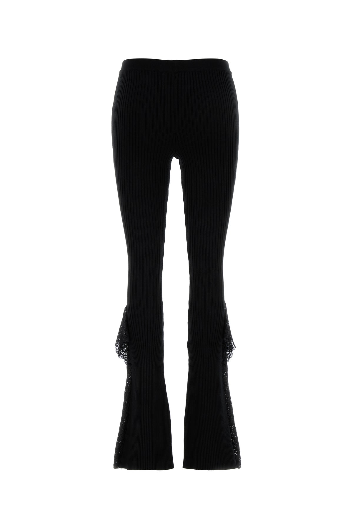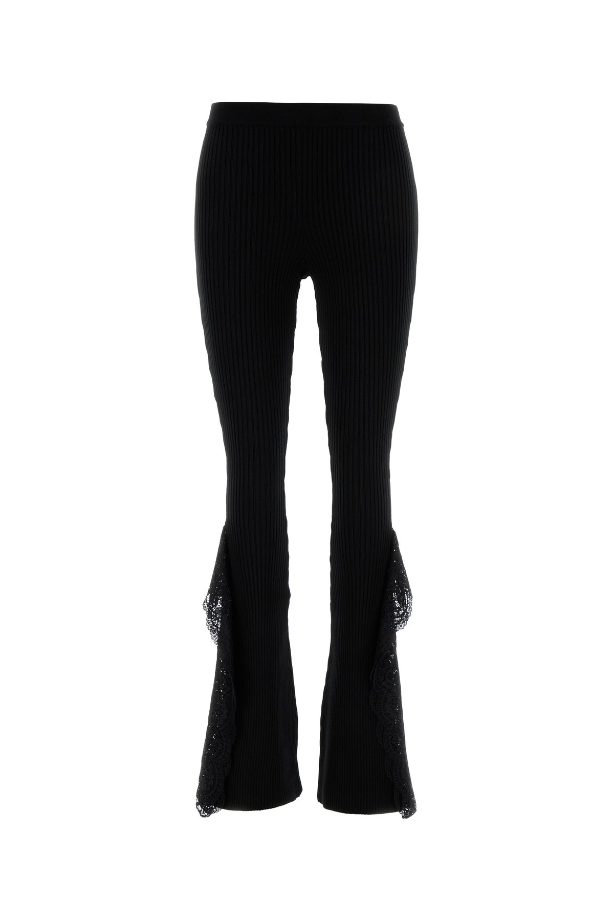 Flared leg pant realized in ribbed knit enriched by tonal lace flounces on the hemline.