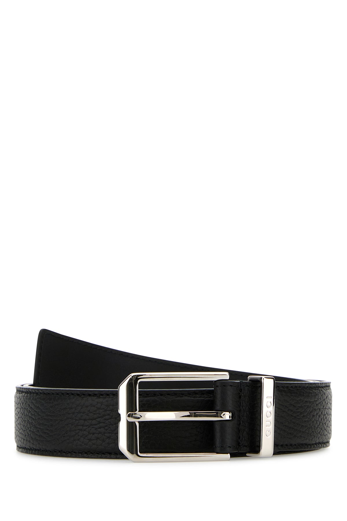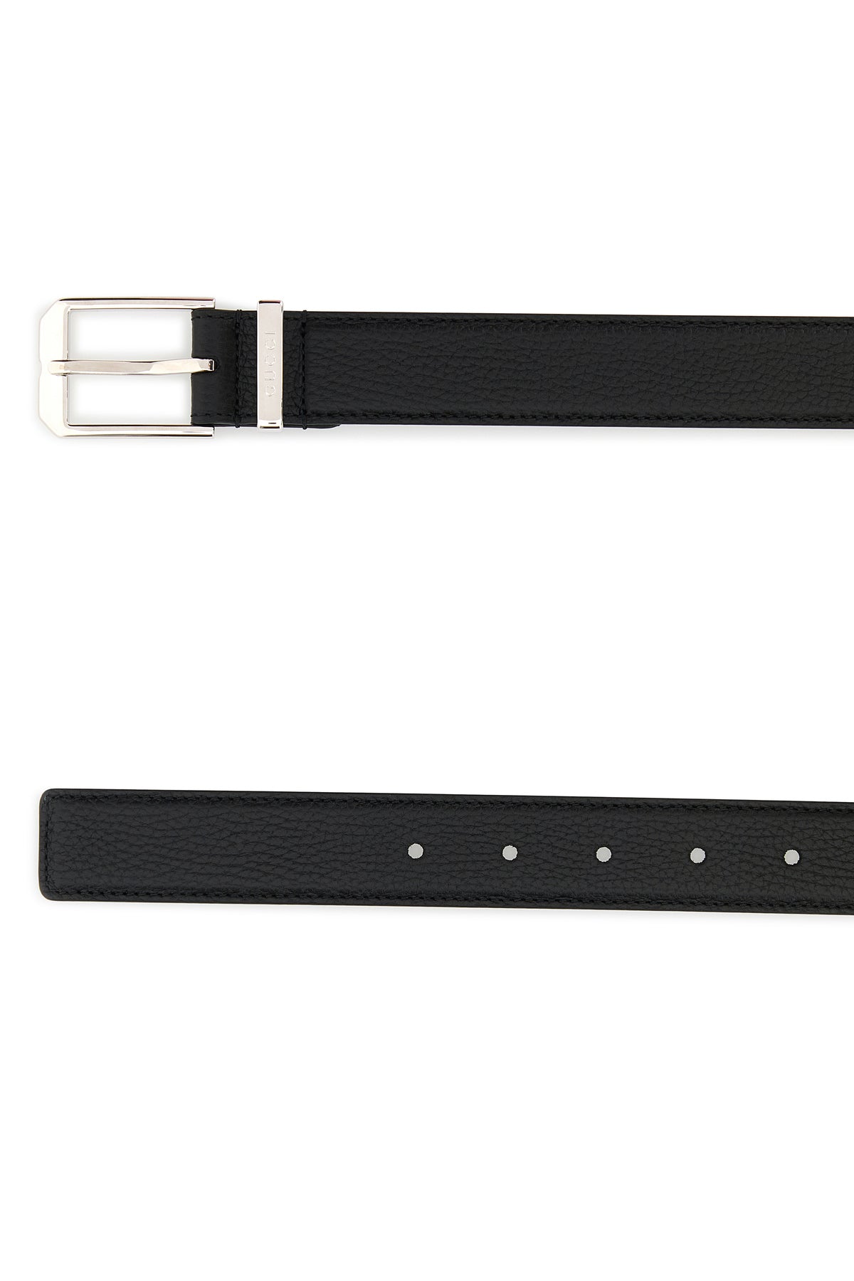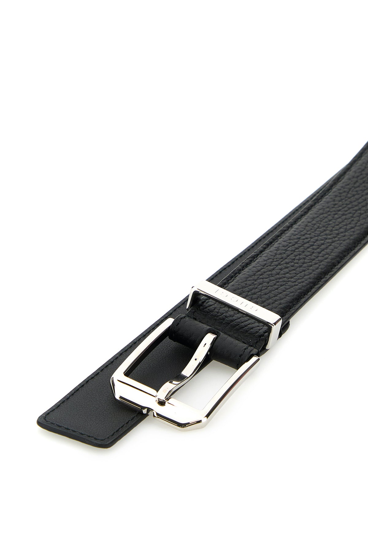 Belt realized in pebble leather characterized by embossed logo on the metal buckle.