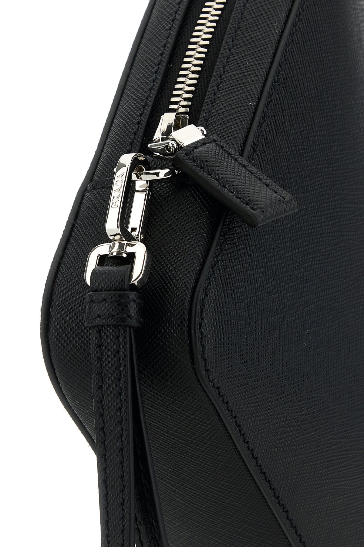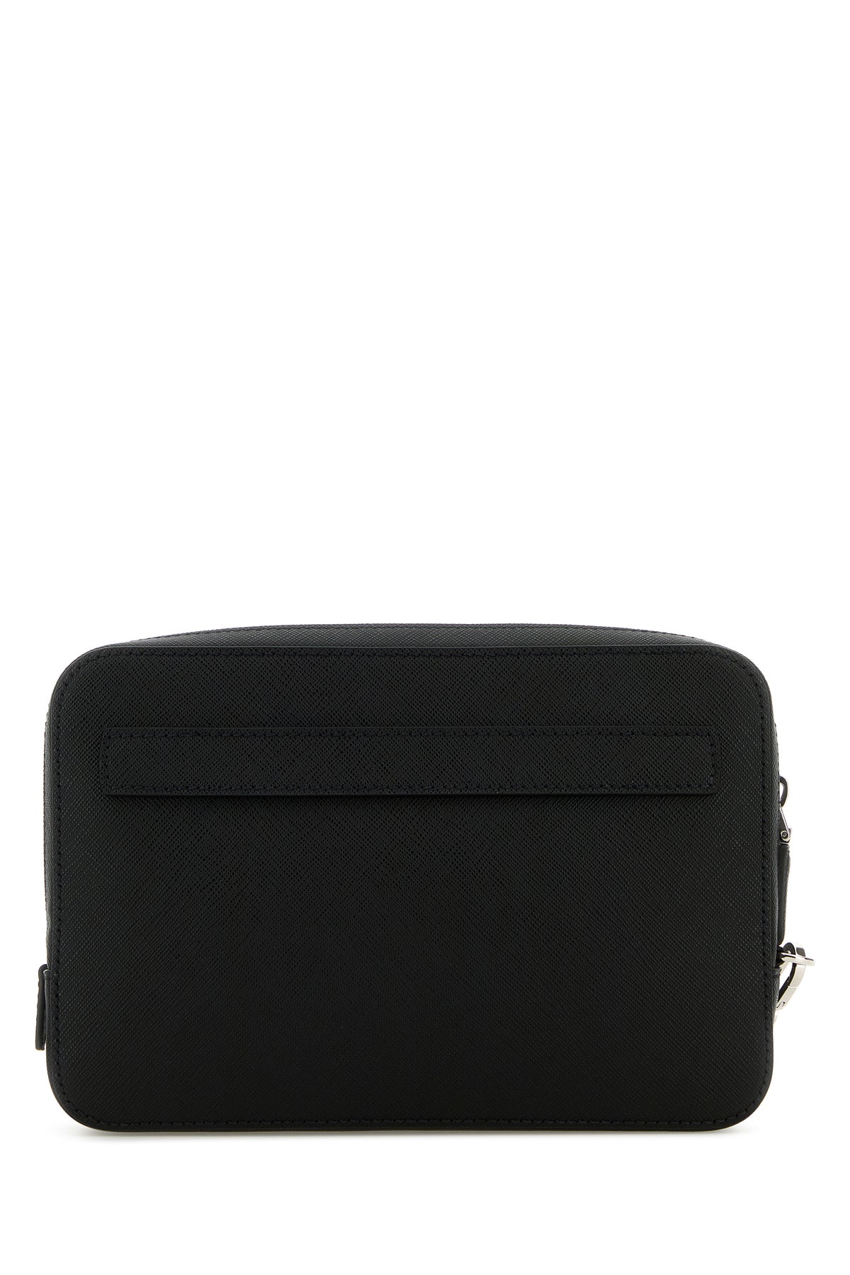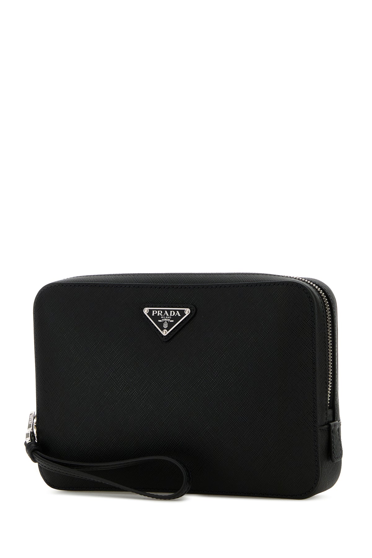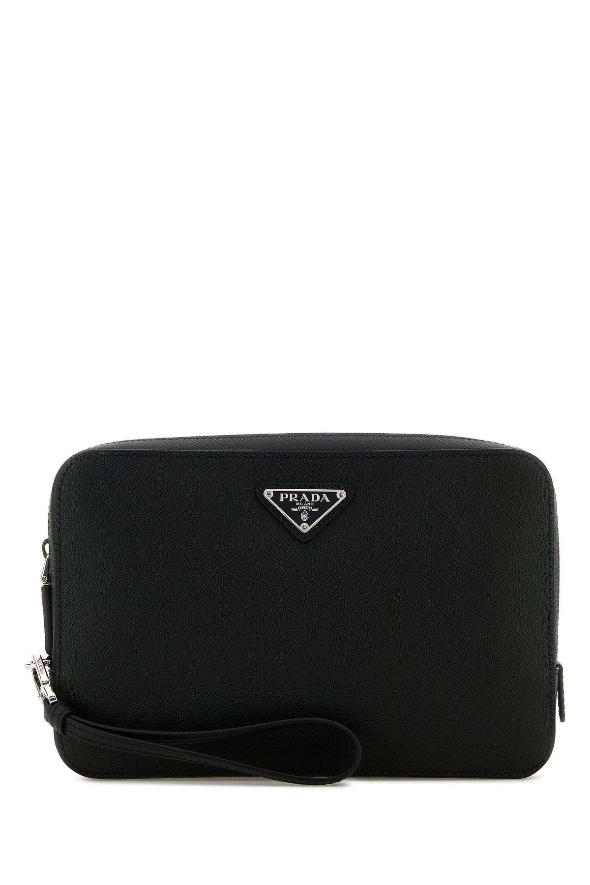 Clutch realized in Saffiano leather enriched by iconic metal logoed triangle at the front.