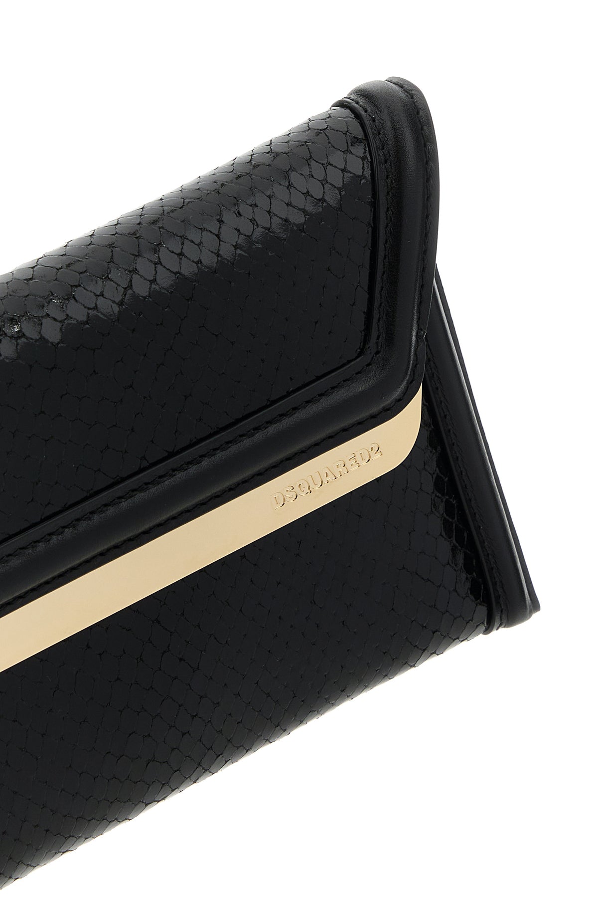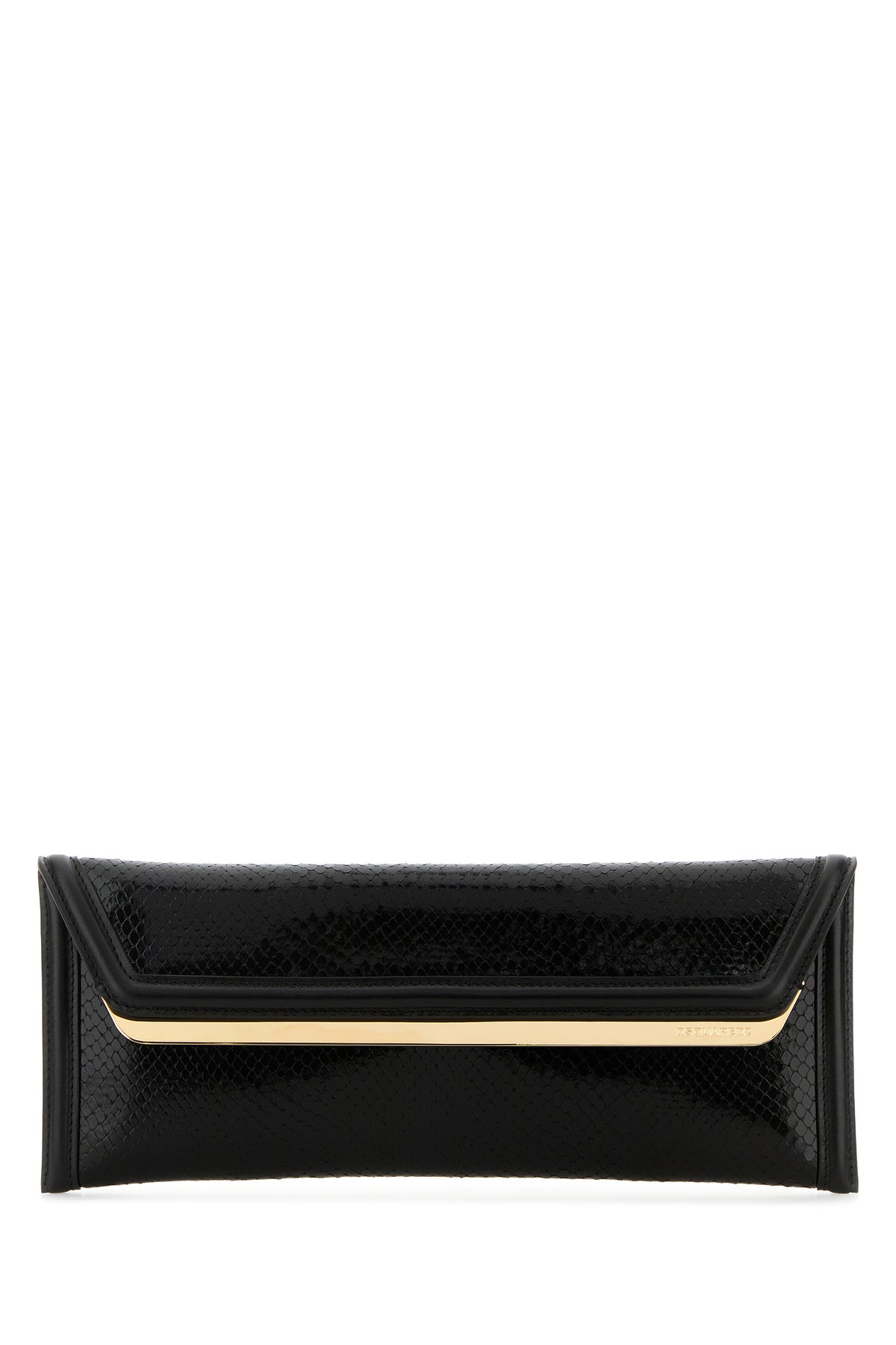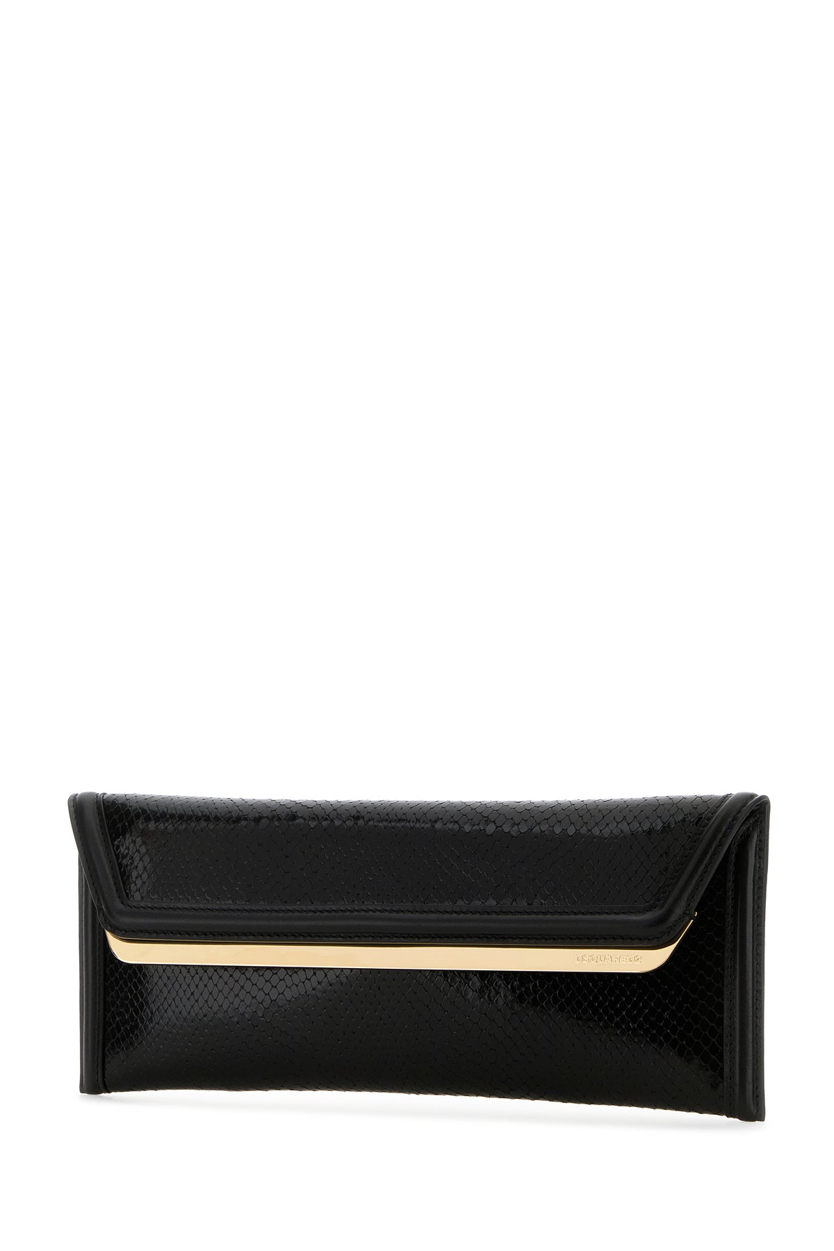 Clutch realized in reptile motif embossed calf leather enriched by logoed metal plate at the front.
