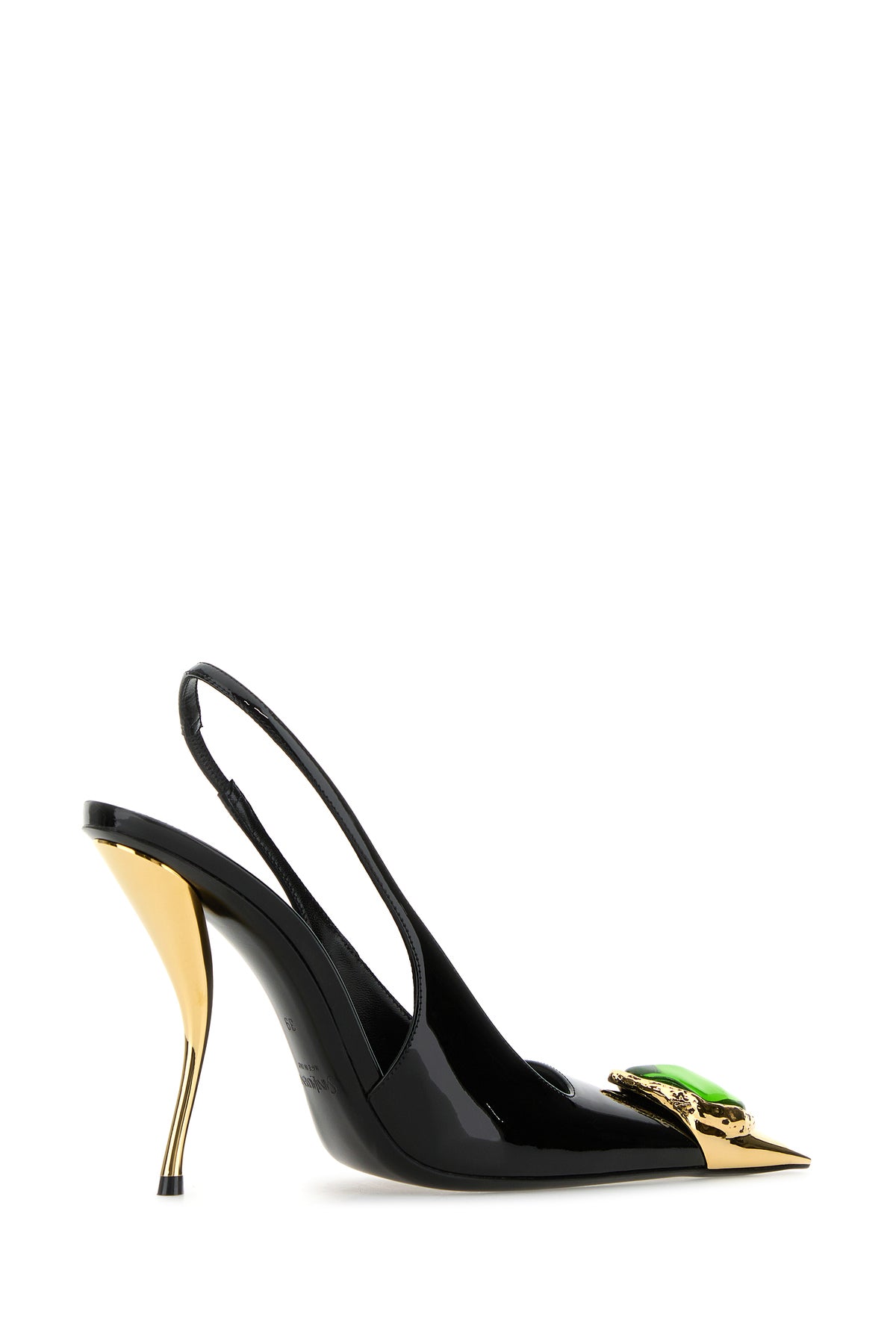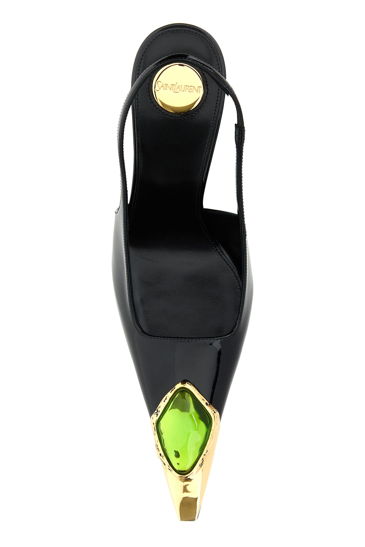 Slingback realized in patent calf leather enriched by jewel embellishment on the pointed-cut toe.