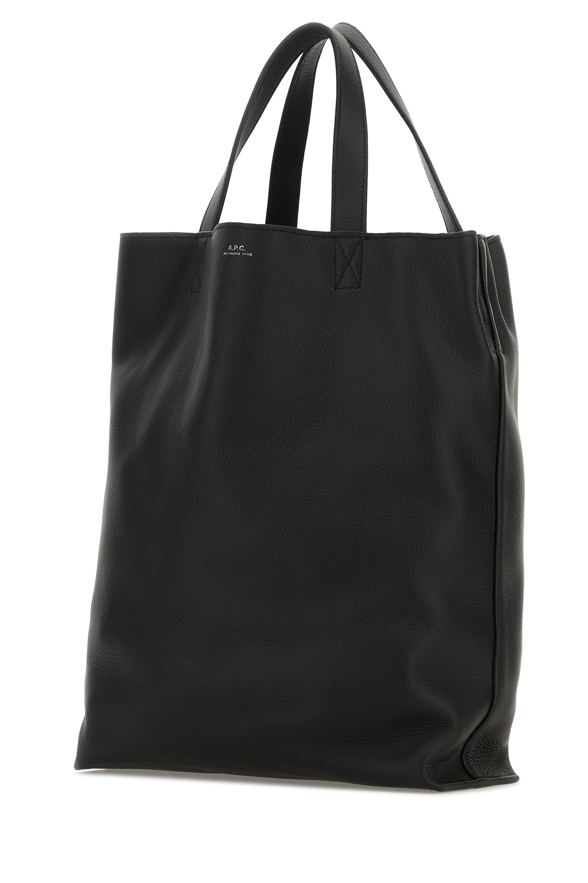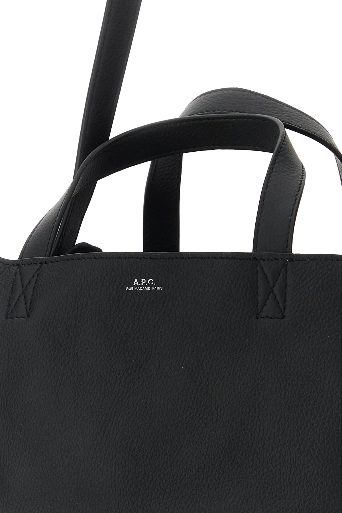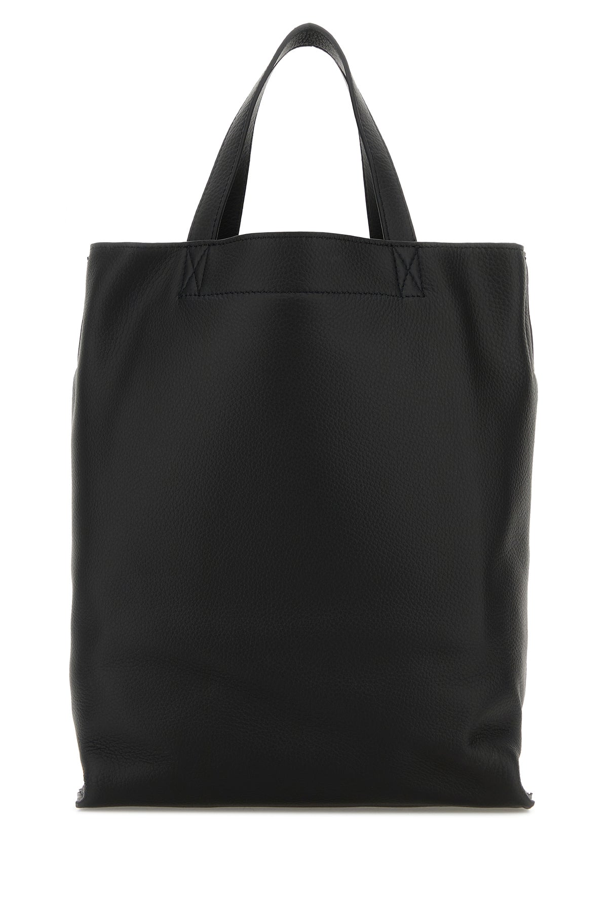 Shopping bag realized in pebble leather characterized by laminated printed logo at the front.