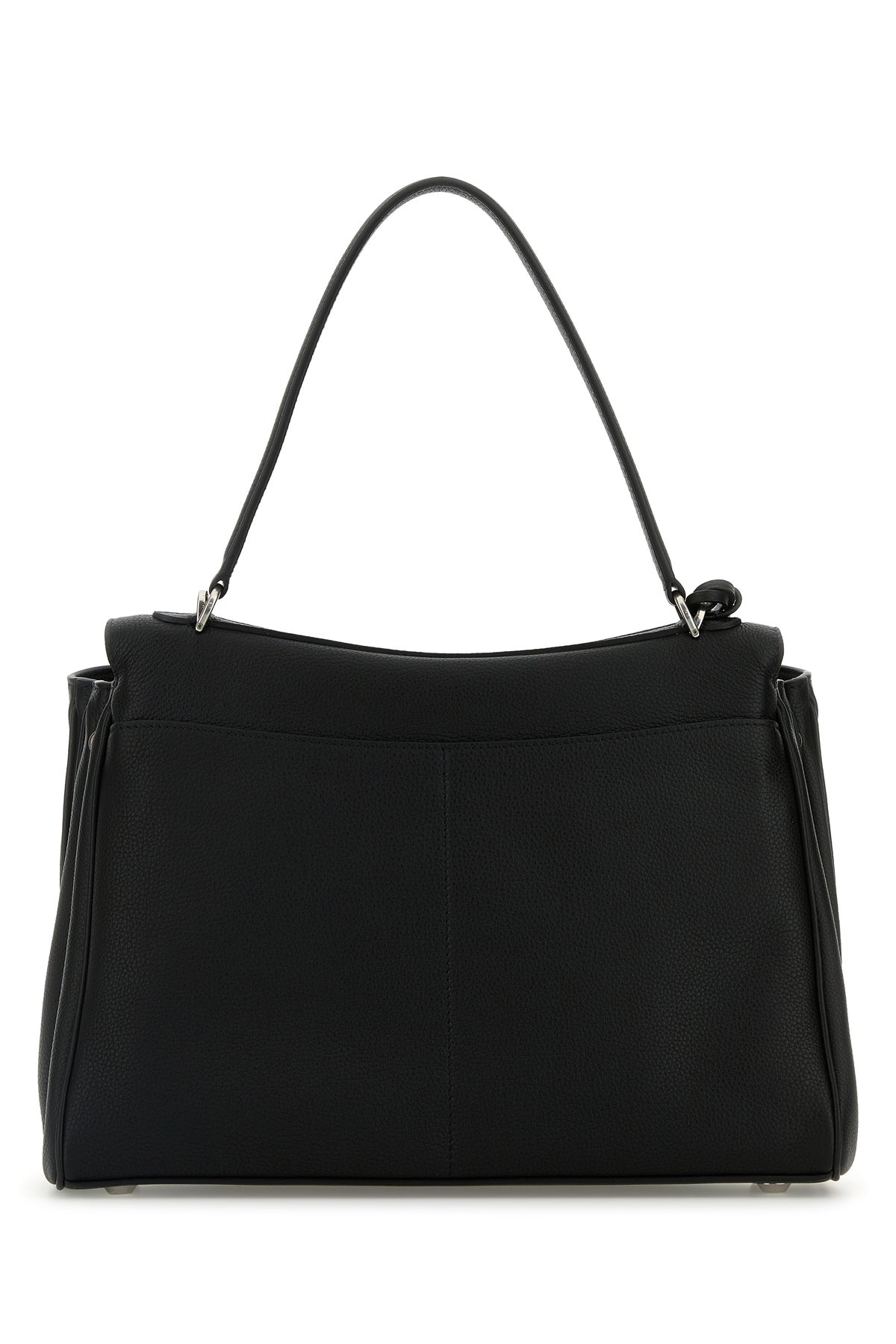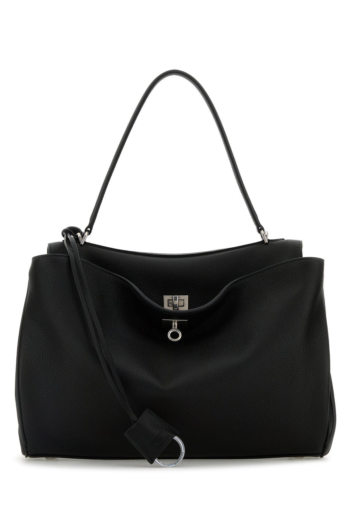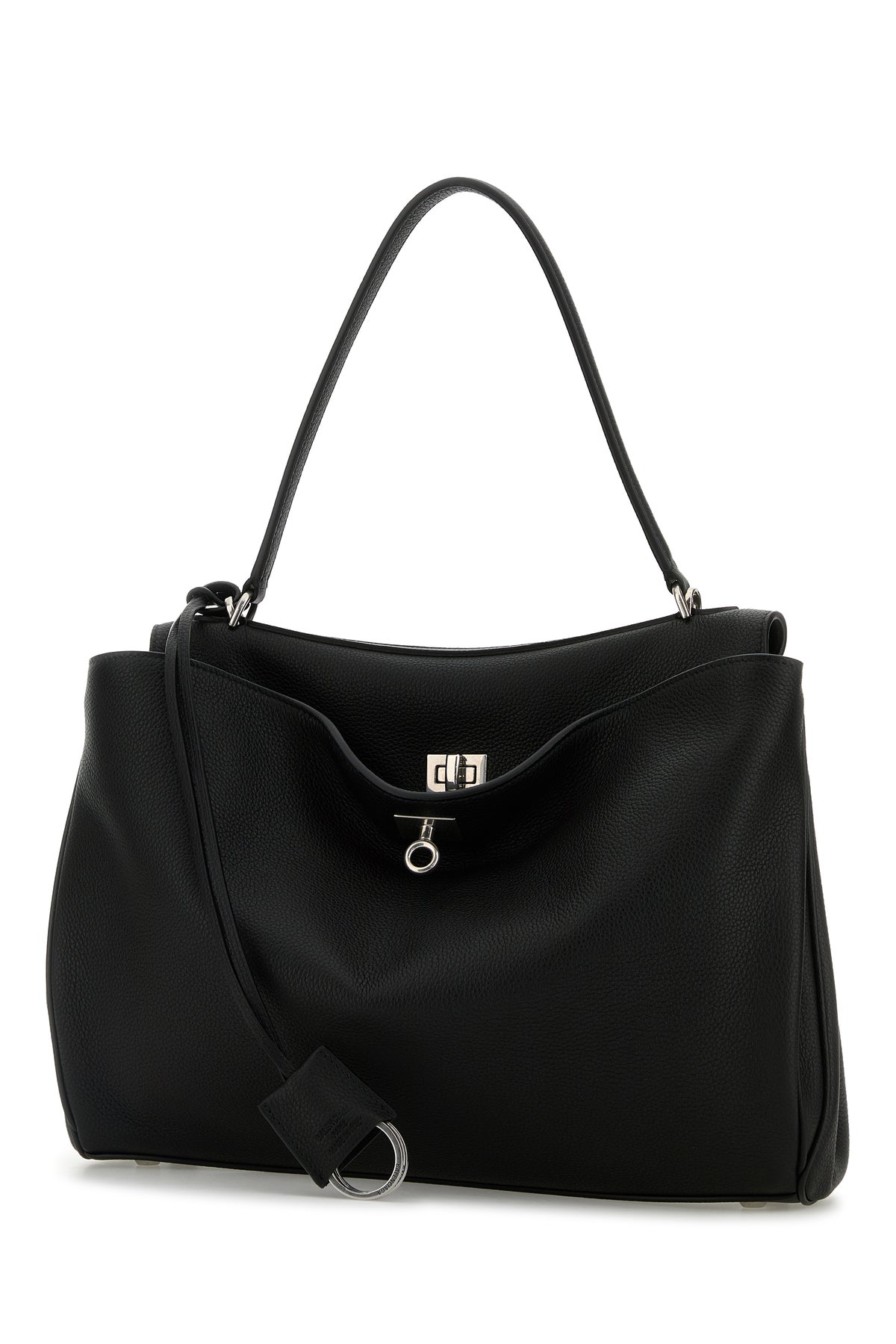 Handbag realized in pebble calf leather enriched by detachable tonal leather accessory with metal rings.