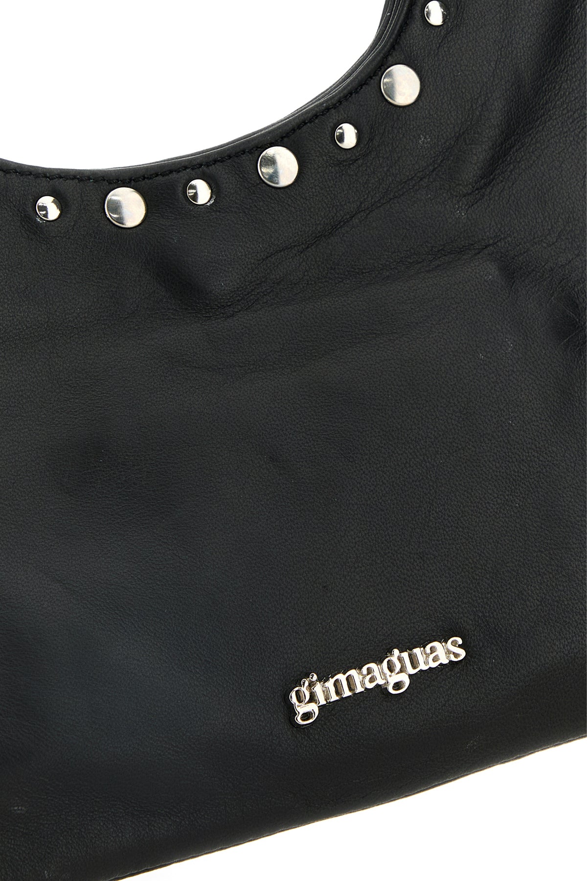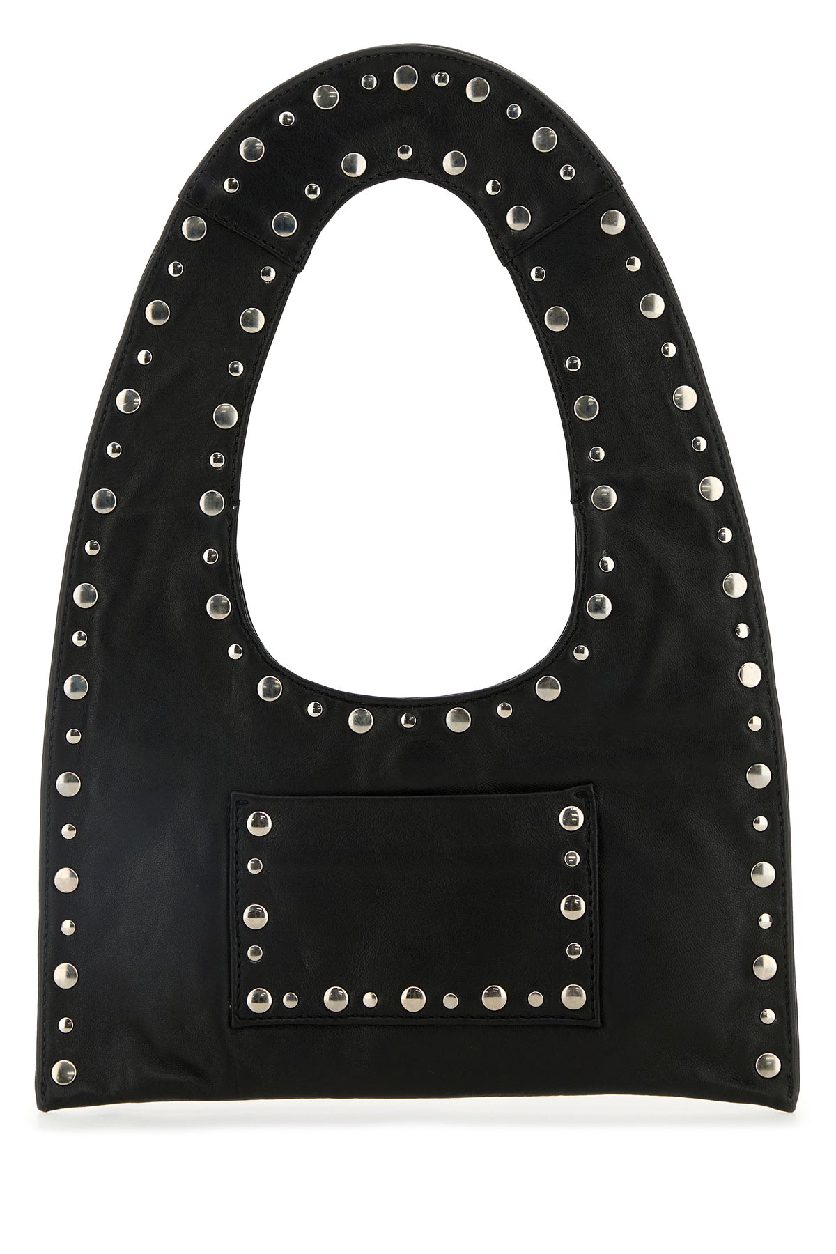 Handbag realized in smooth leather enriched by metal lettering logo at the front and metal studs at the front and at the back.