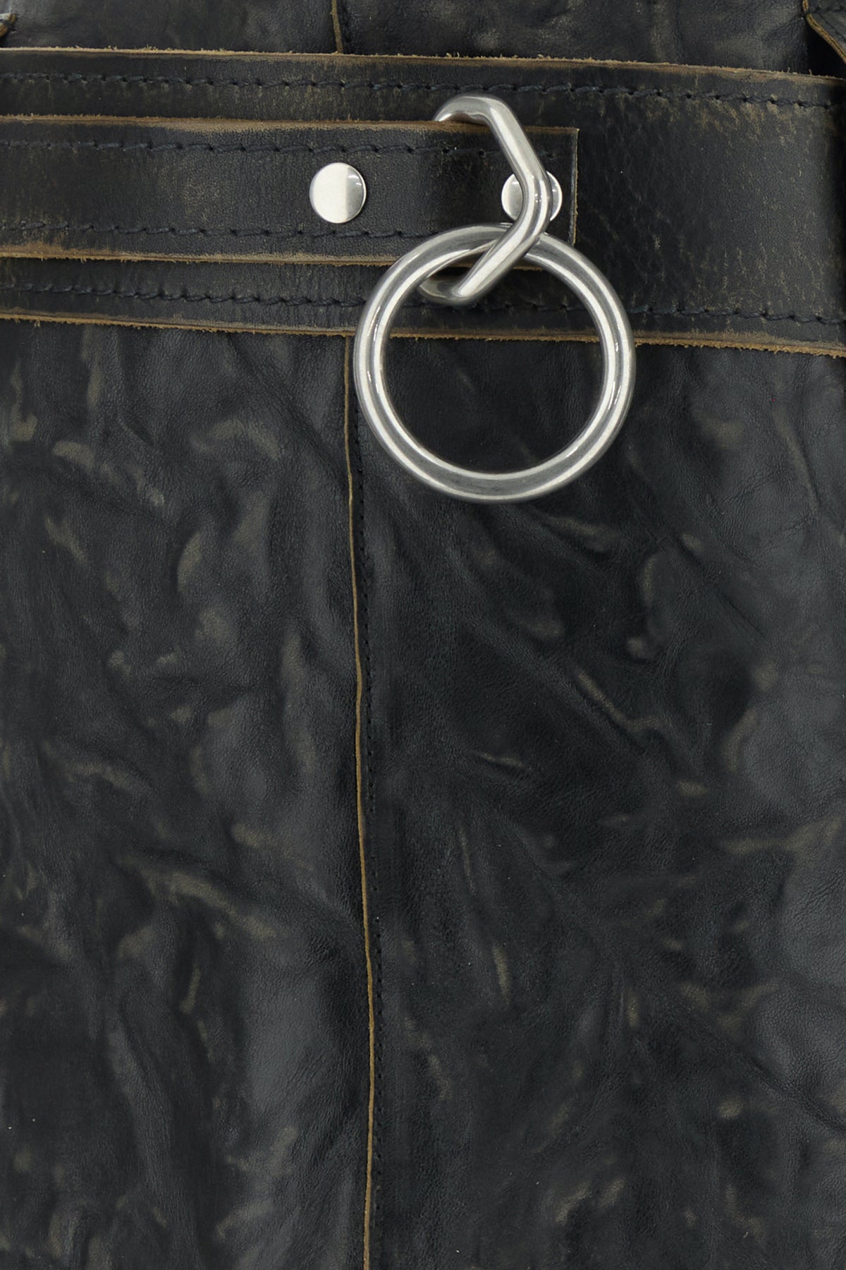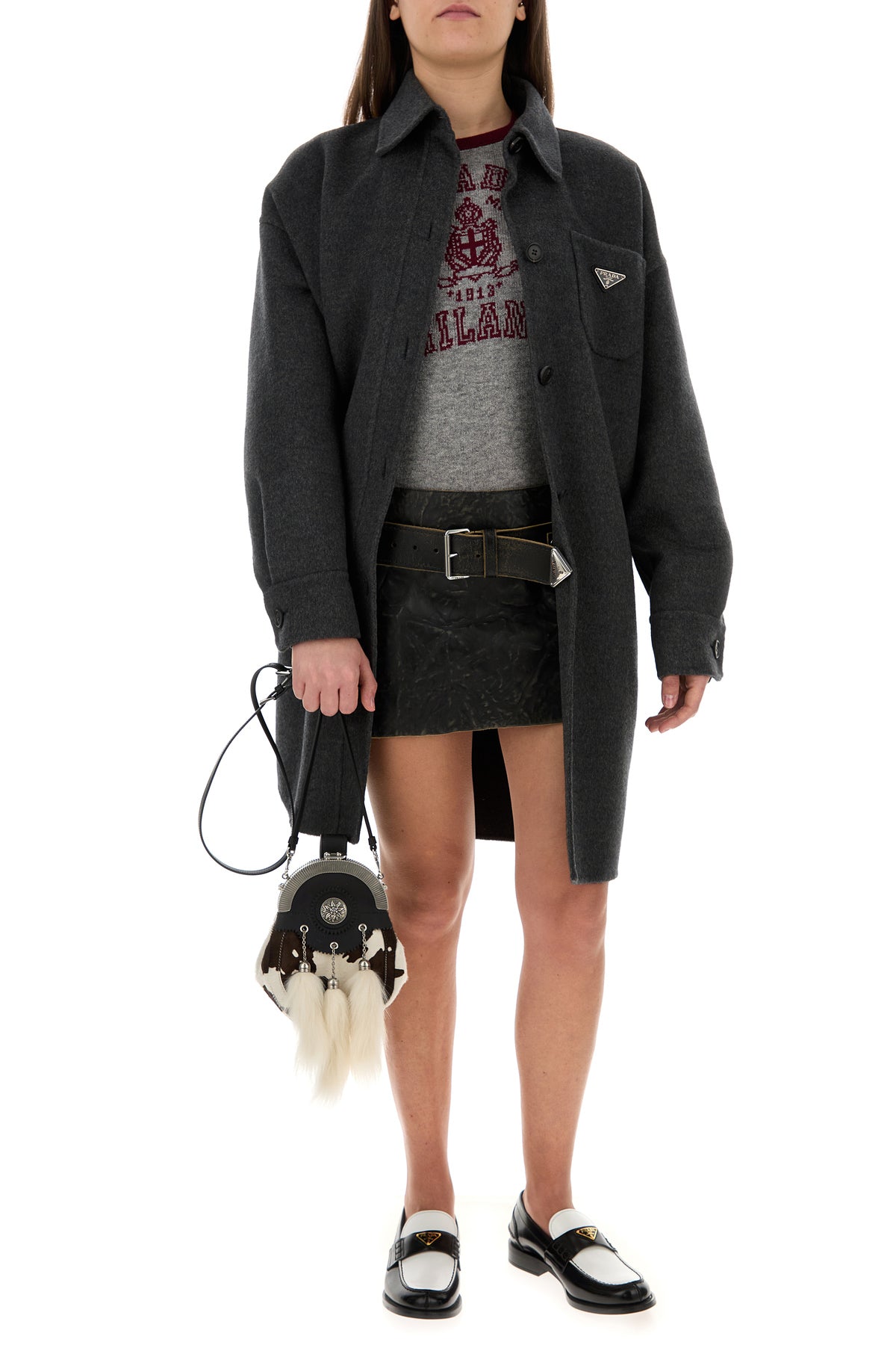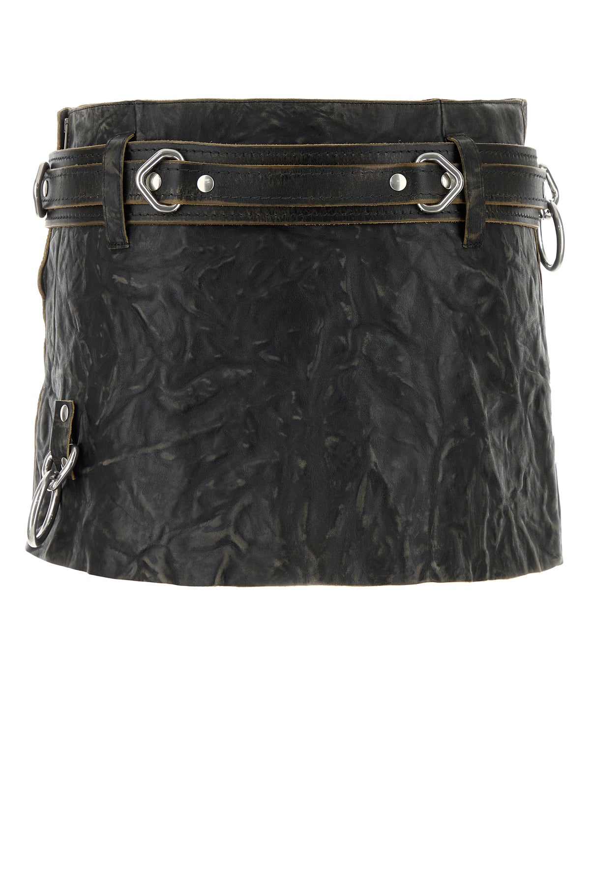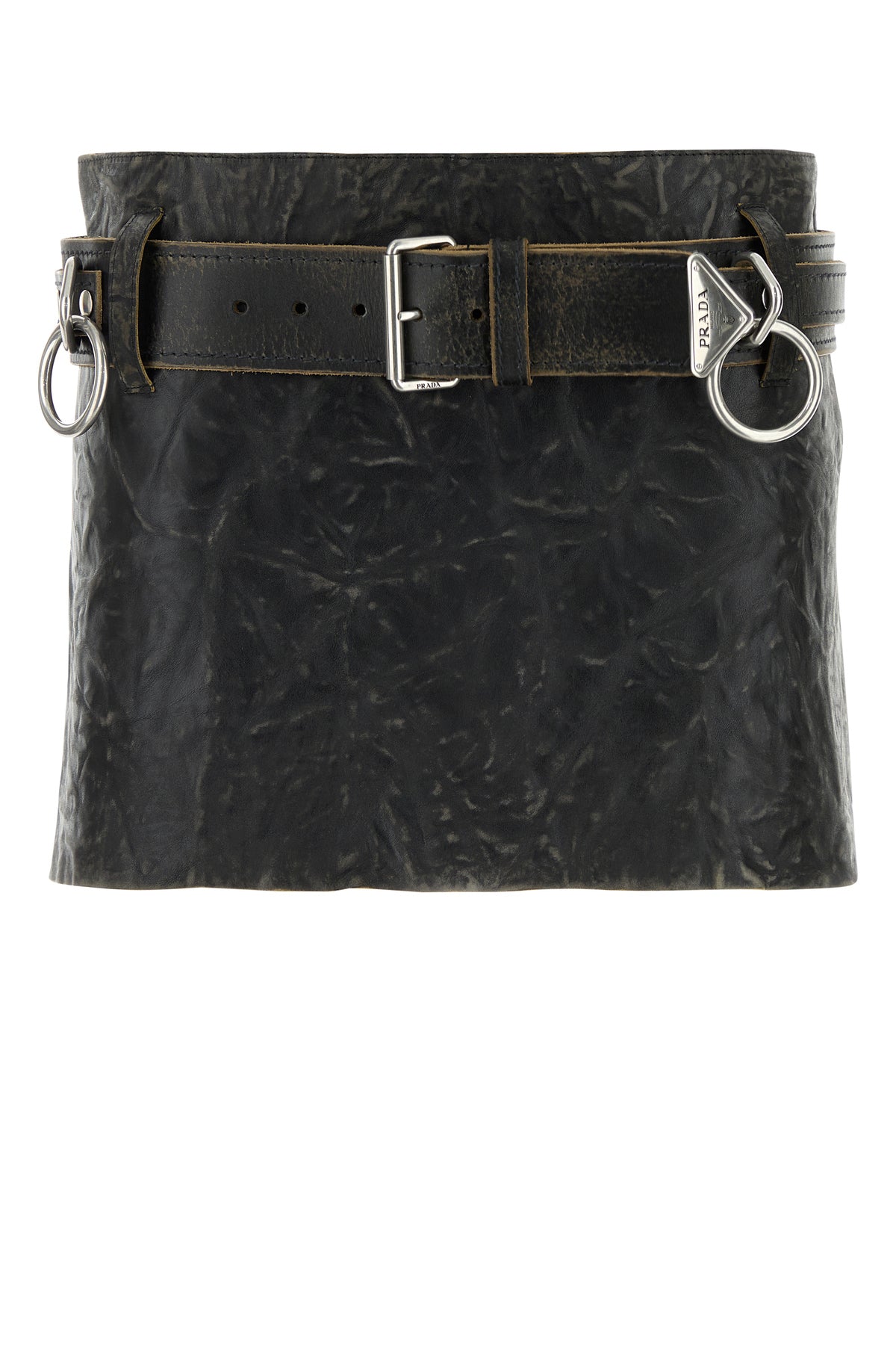 Mini skirt realized in vintage-effect calf leather enriched by detachable tonal leather belt with metal rings and iconic logoed triangle.