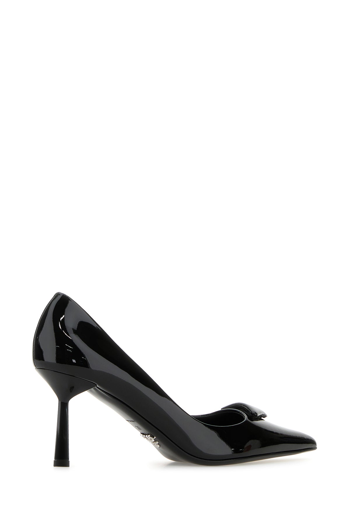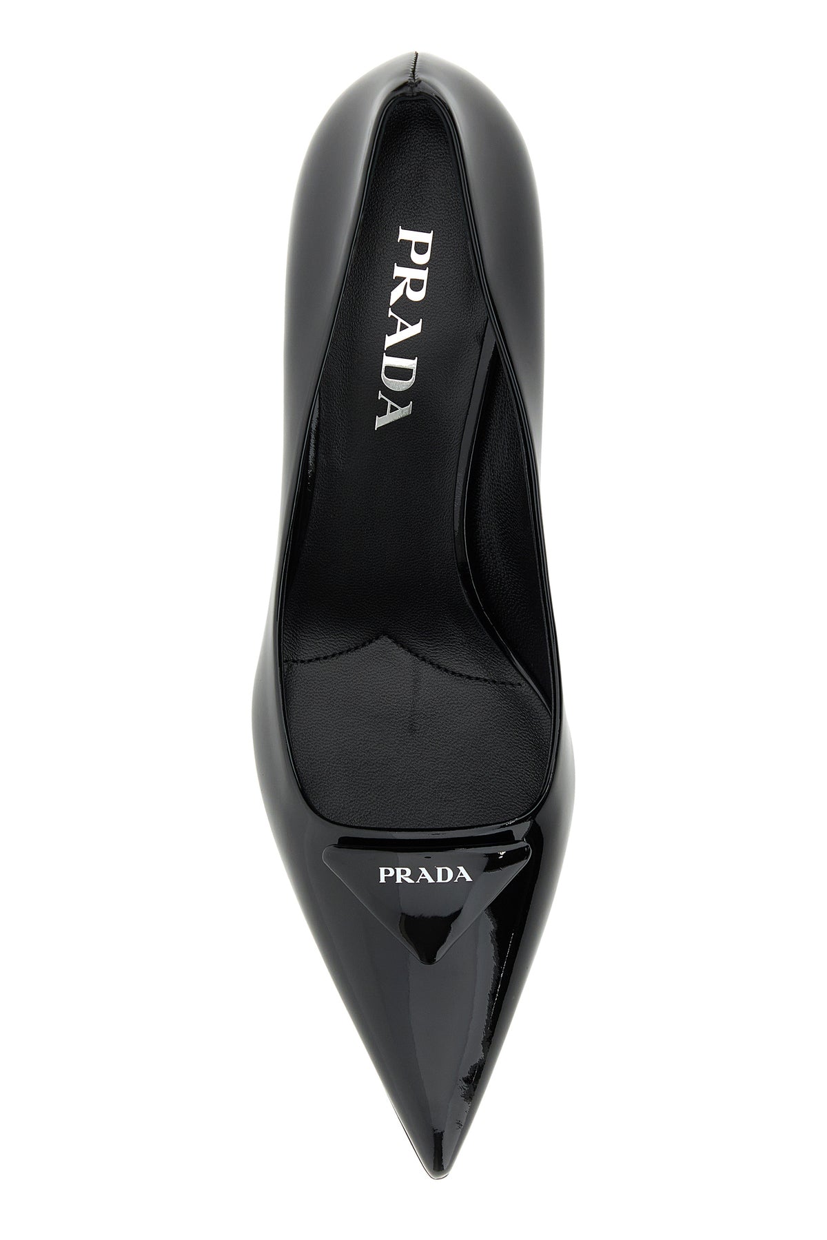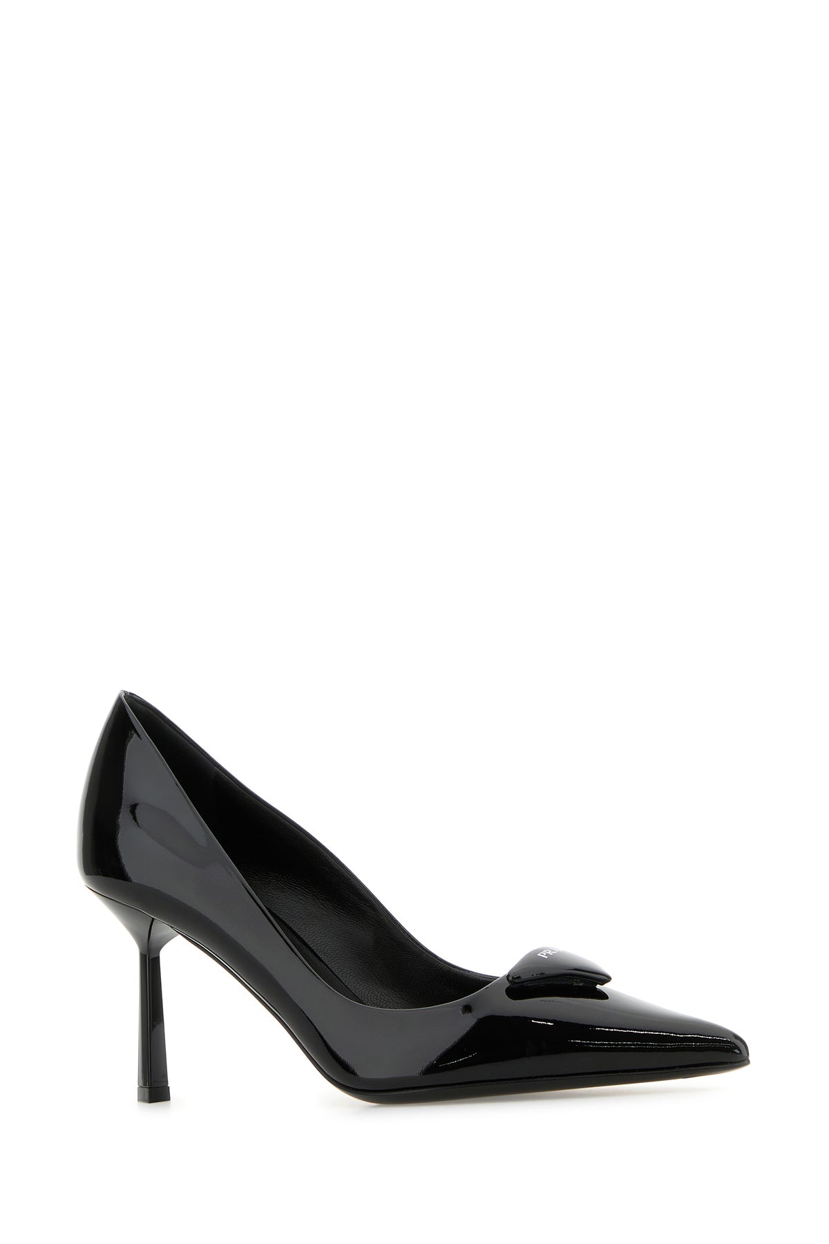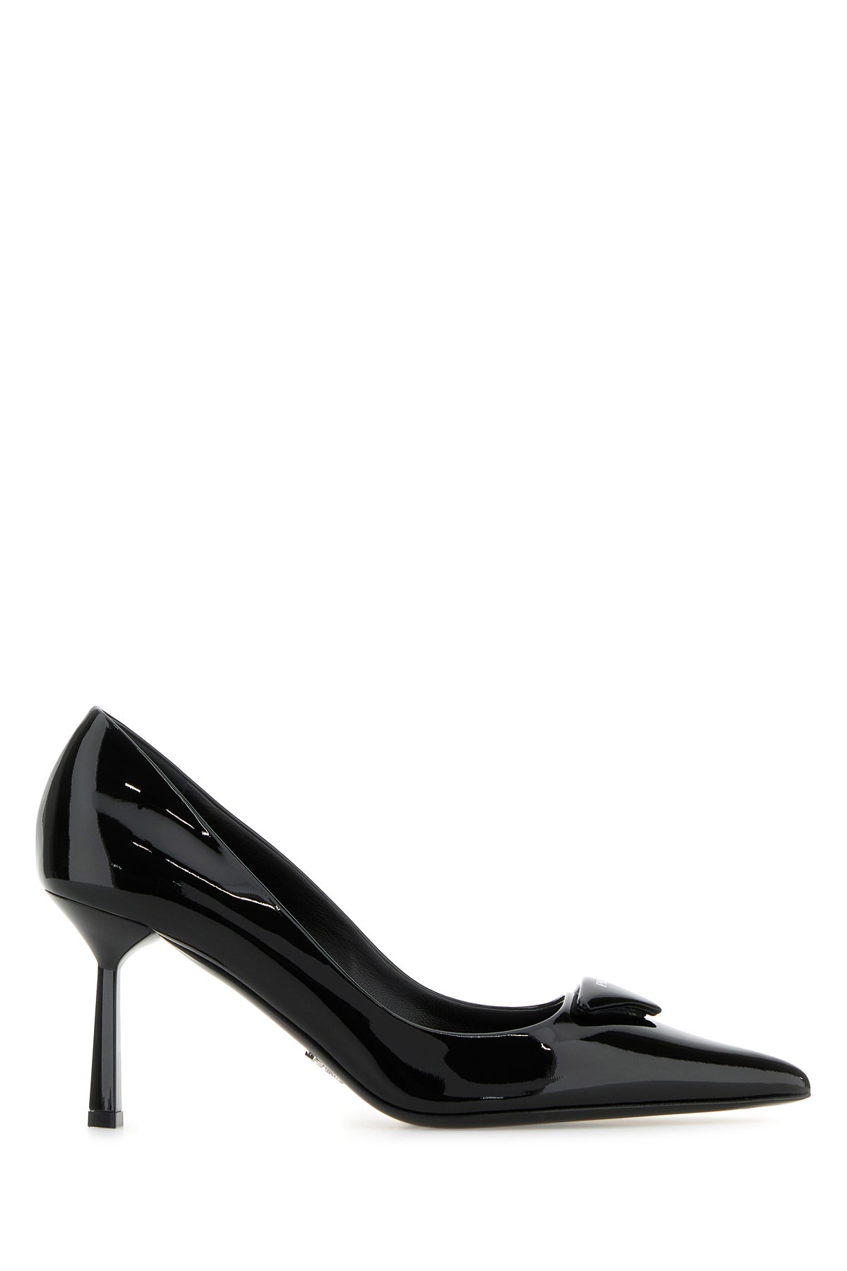Pumps realized in patent leather enriched by iconic logoed triangle on the instep.