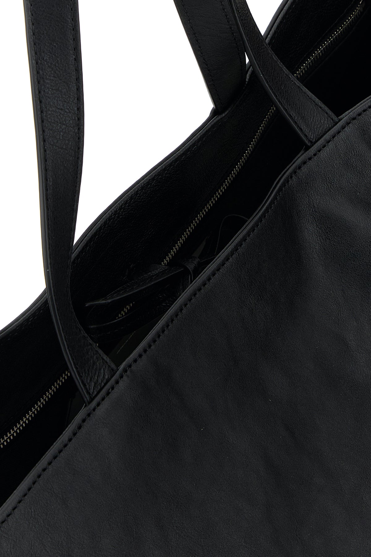 Shopping bag realized in leather characterized by logo in relief at the front.