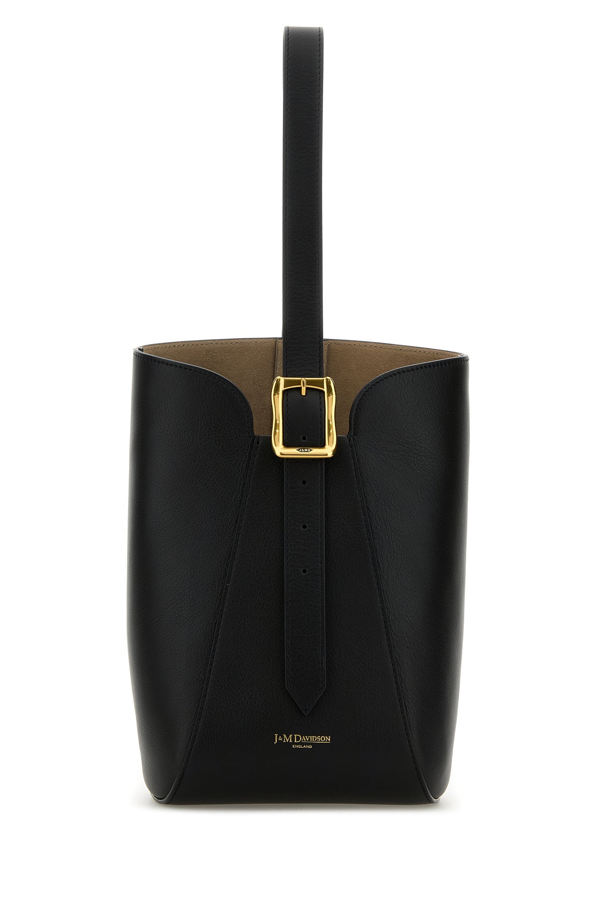 Bucket bag realized in smooth calf leather characterized by contrasting printed logo at the front.