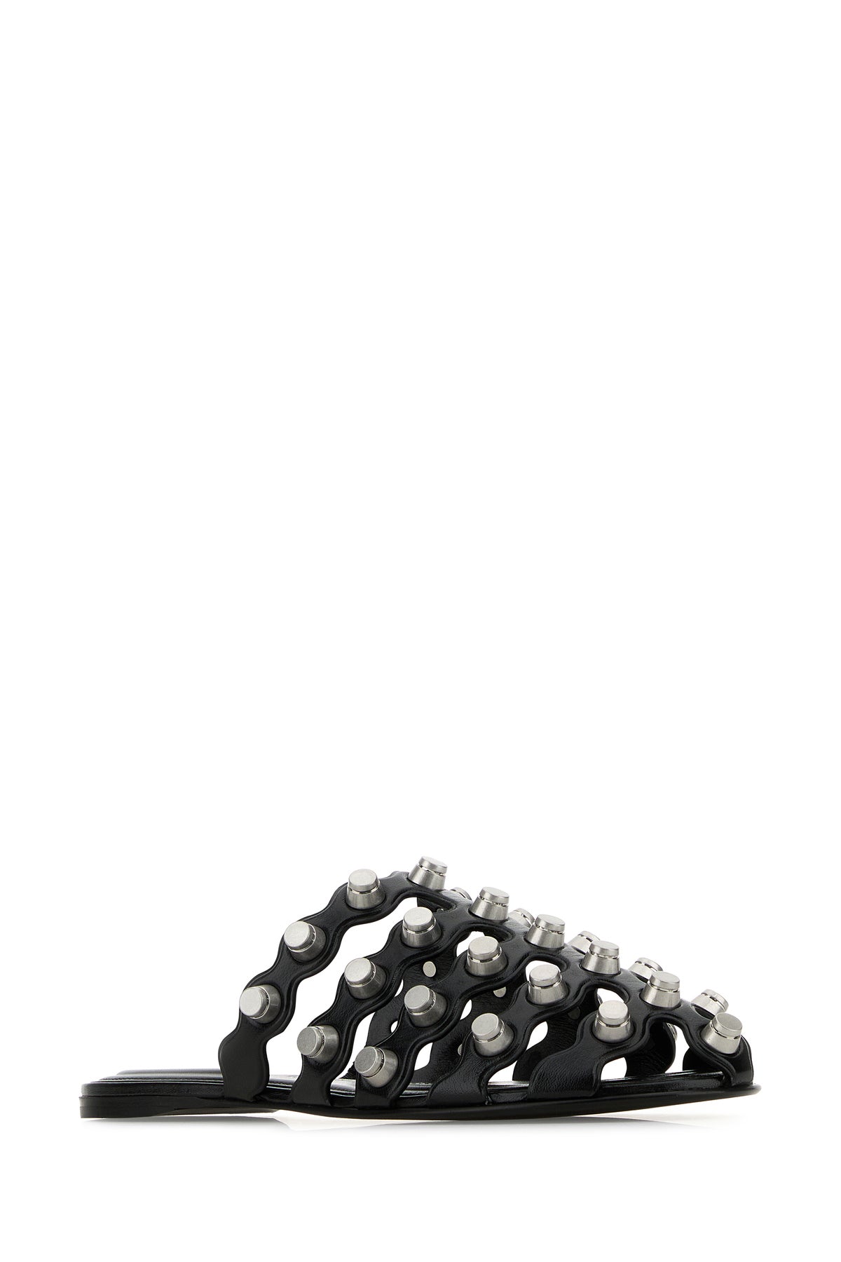 Slippers realized in polished-finish smooth leather characterized by peculiar cut-out details on the entire surface enriched by peculiar metal details on the entire surface.