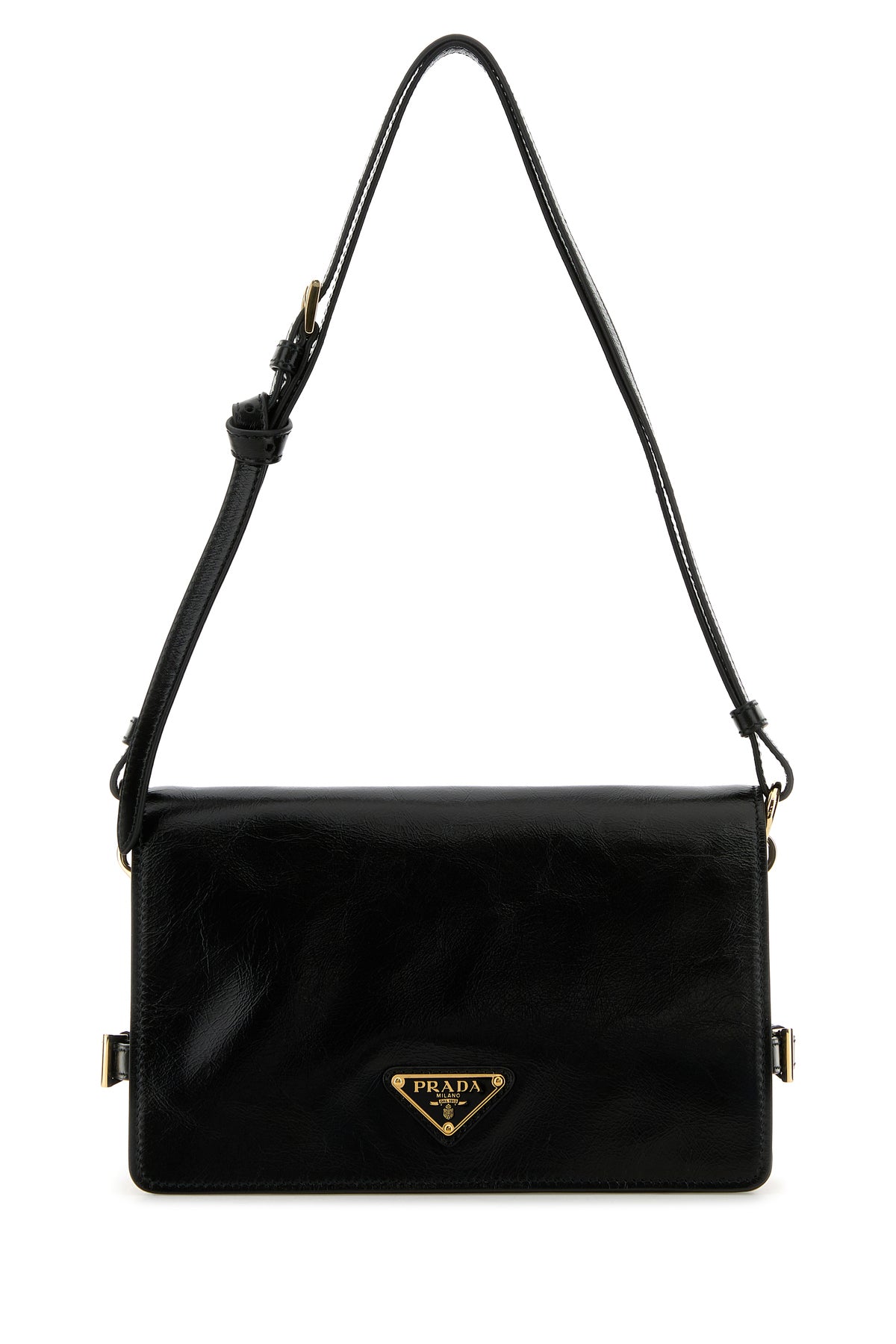 Shoulder bag realized in pebble leather enriched by iconic logoed metal triangle at the front.
