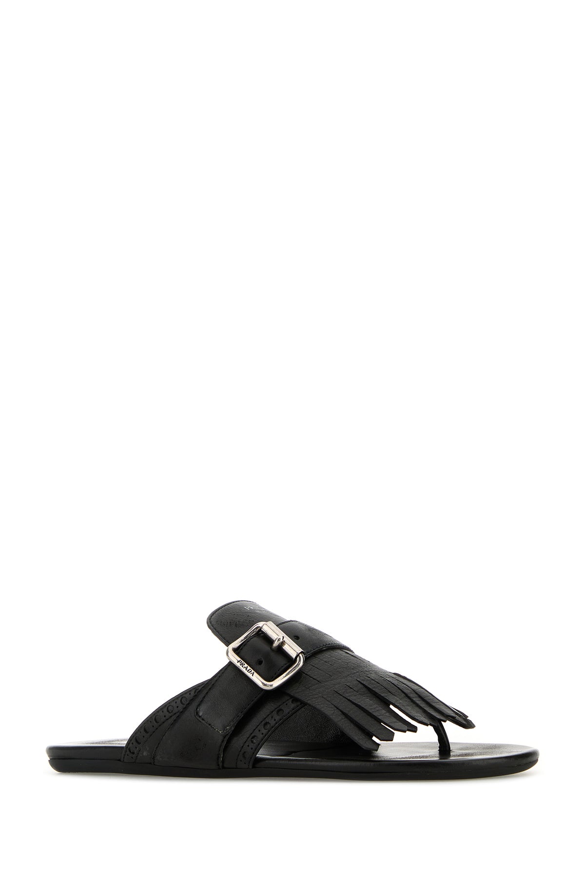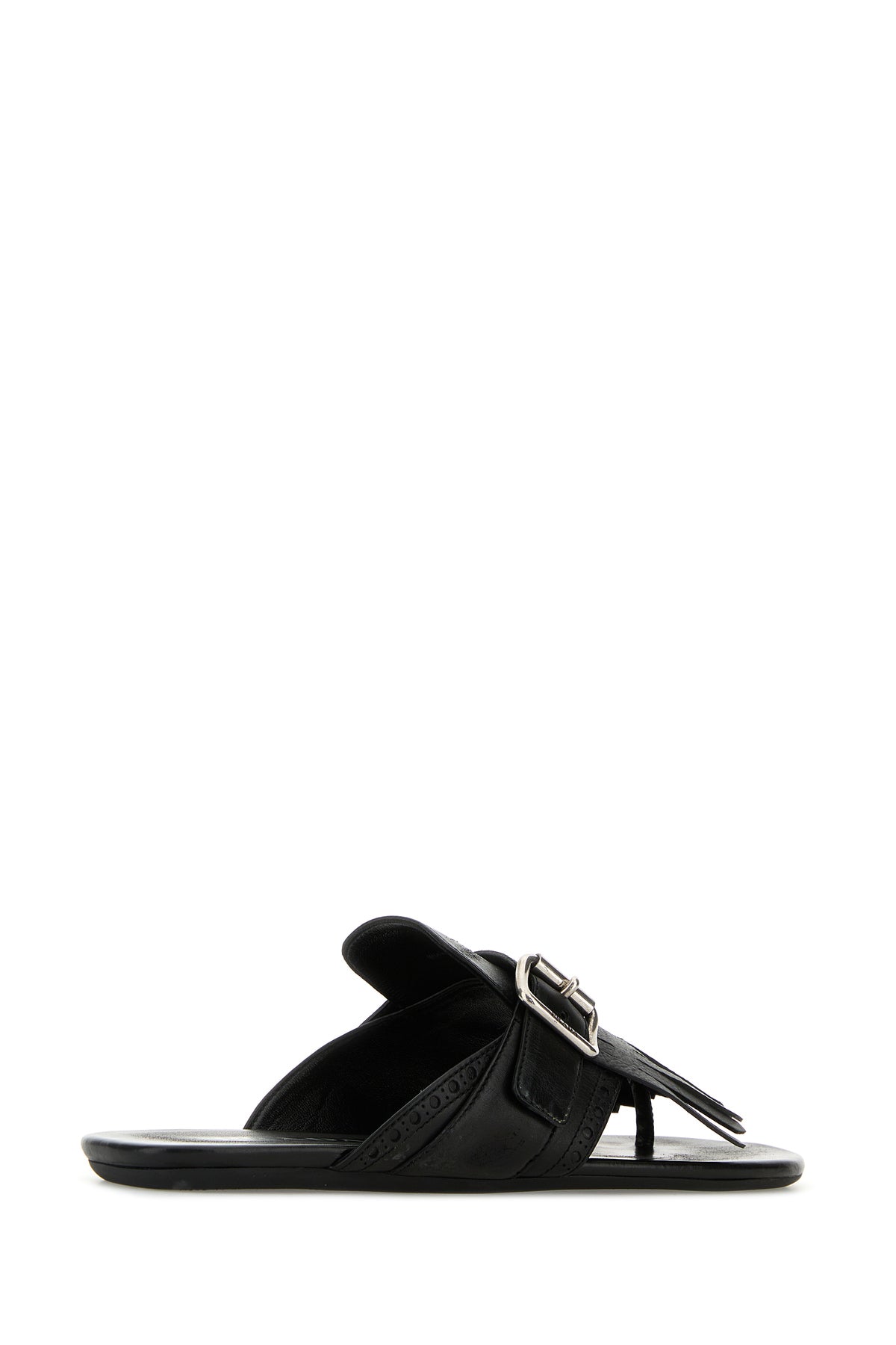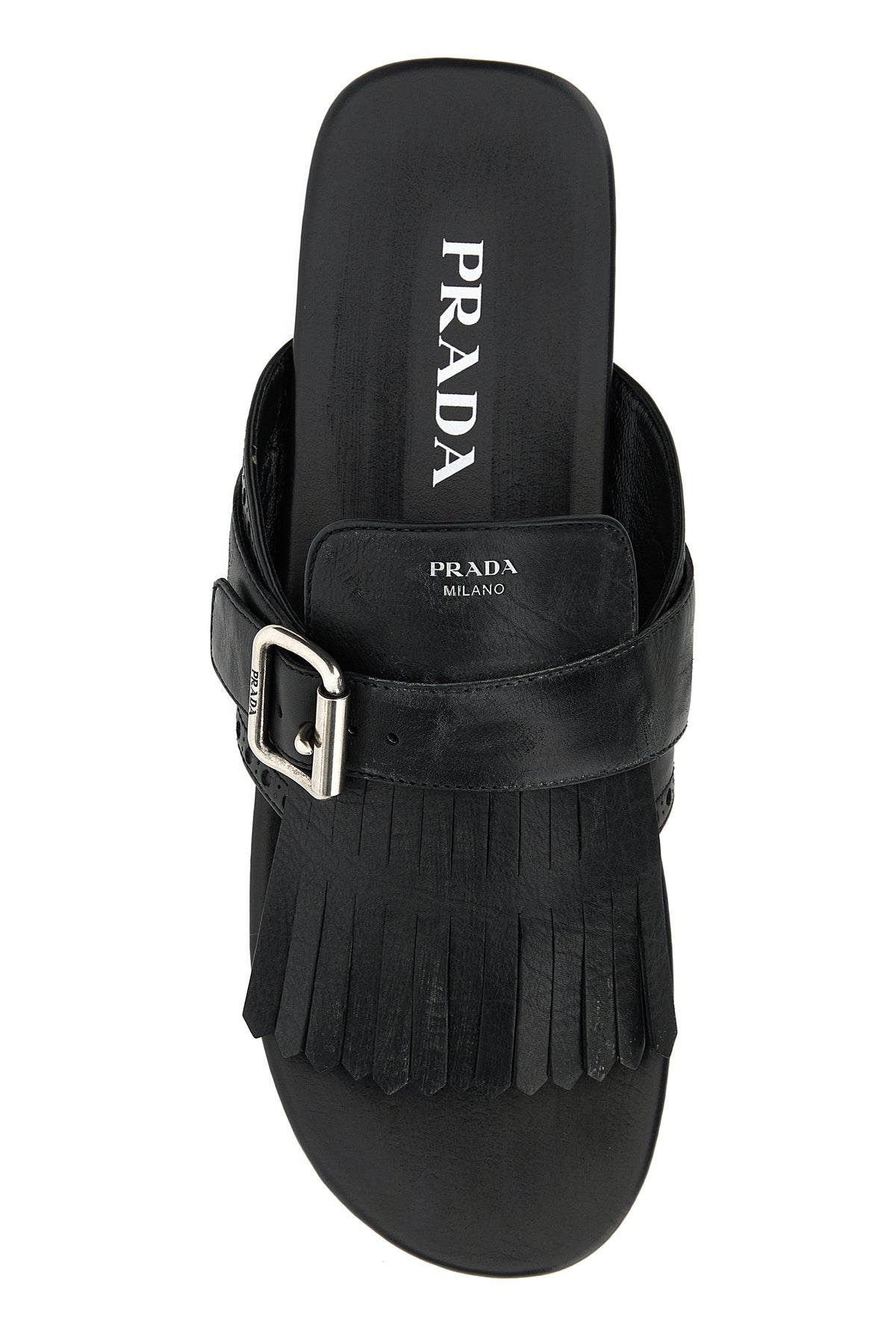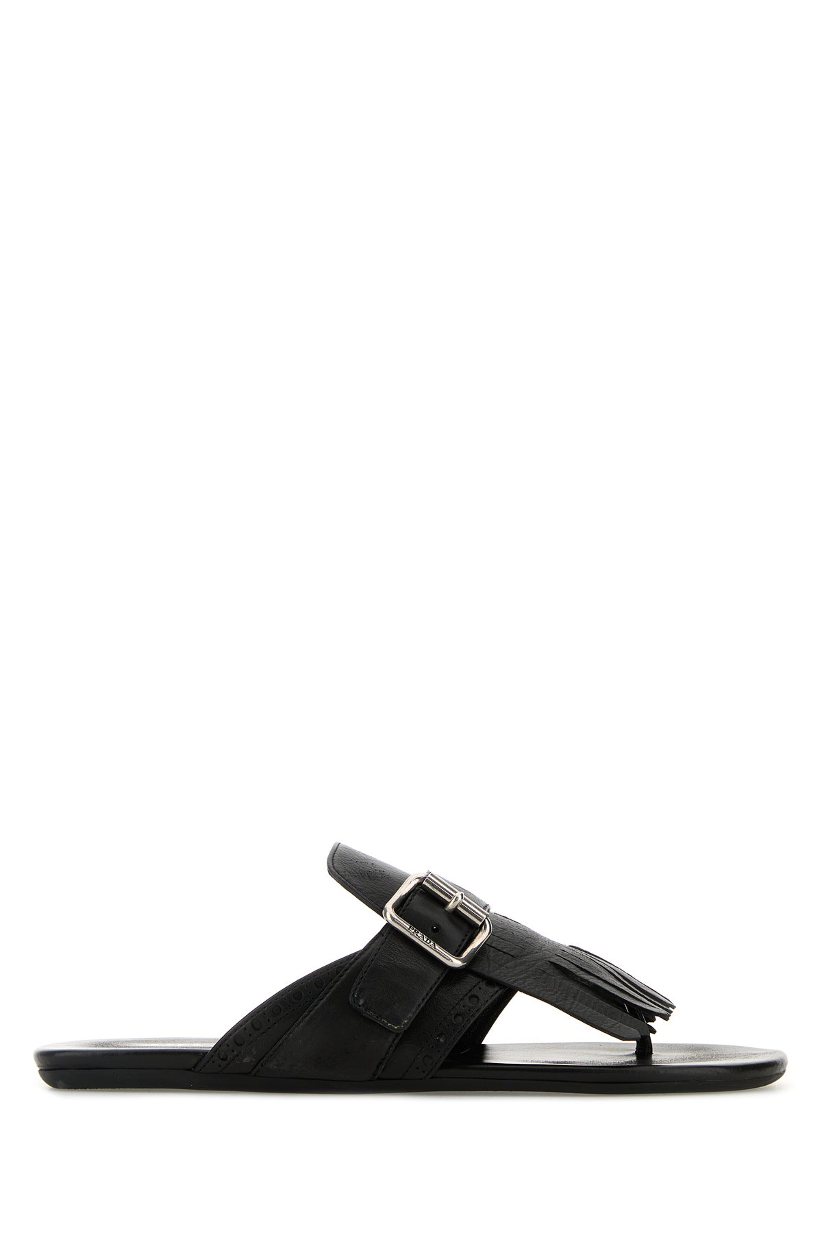 Thong slippers realized in vintage-effect calf leather characterized by printed logo on the instep enriched by strap with metal buckle and fringes at the front.