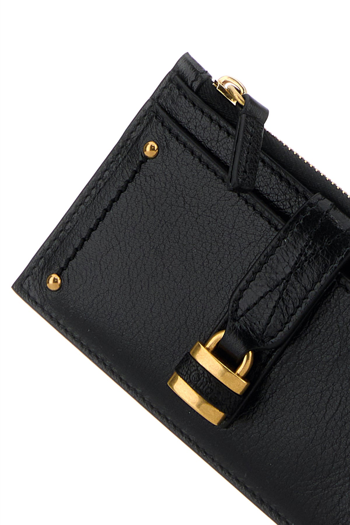 Coin purse realized in pebble leather characterized by embossed logo at the back enriched by Gold padlock and metal studs at the front.