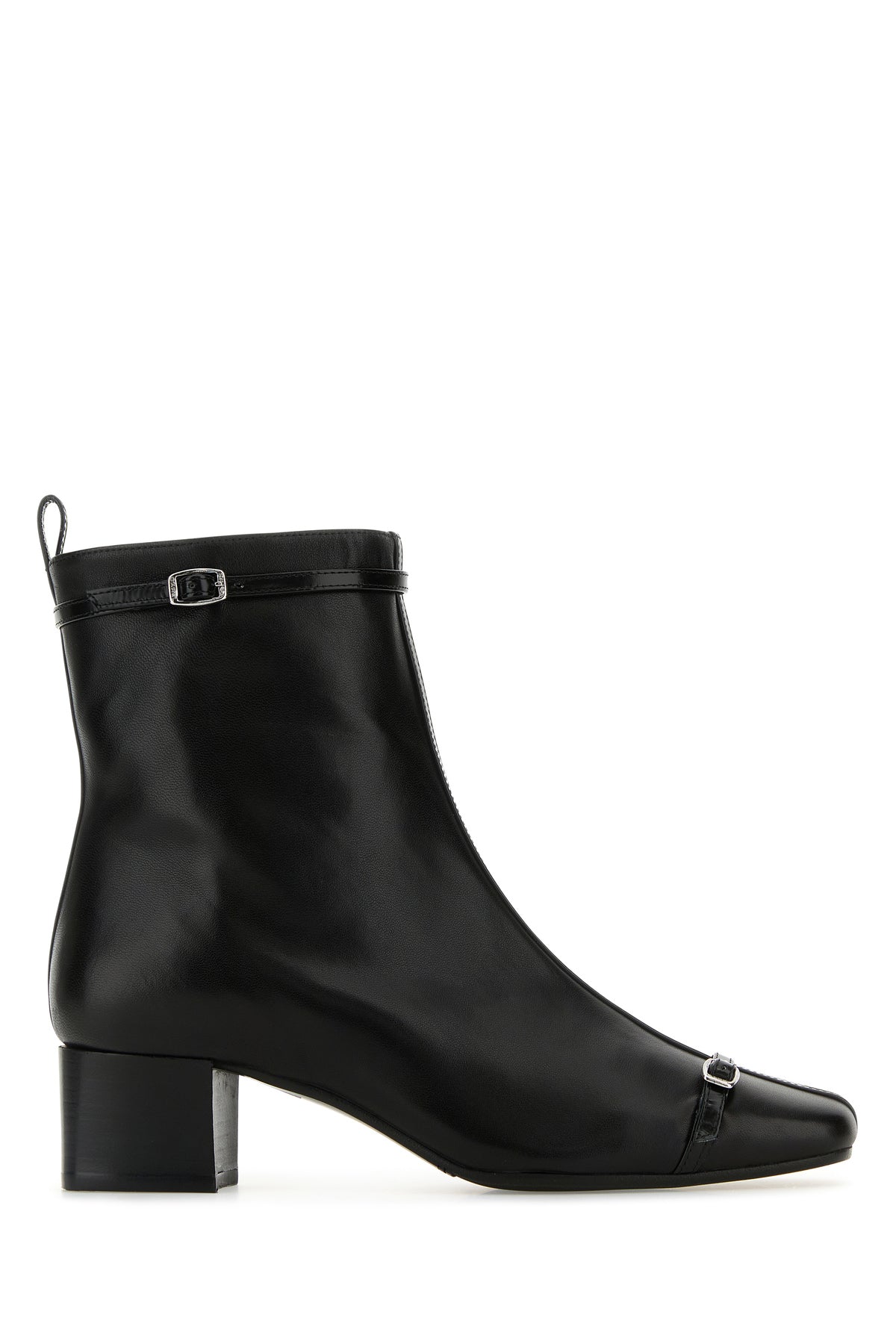 Ankle boots realized in pebble leather enriched by adjustable straps on the instep and on the ankle.