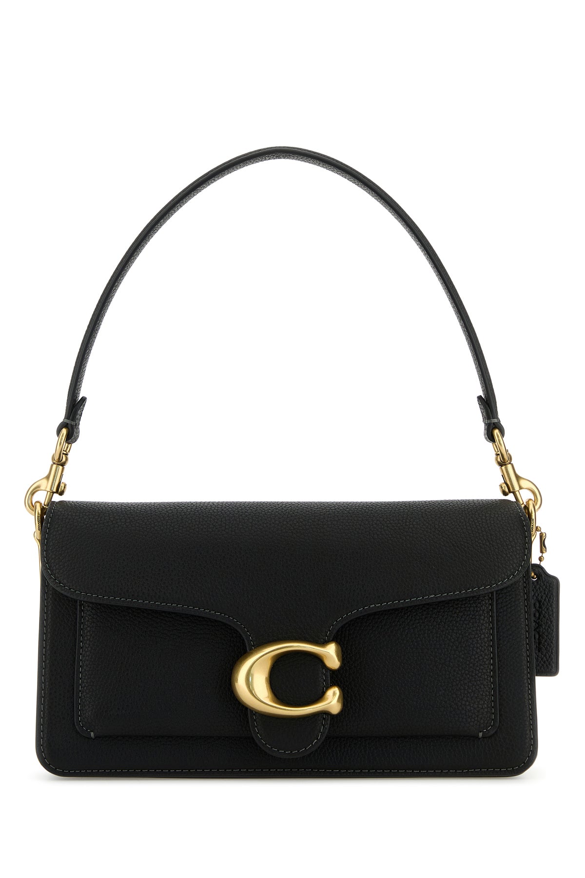 Handbag realized in pebble leather enriched by logoed metal detail at the front.