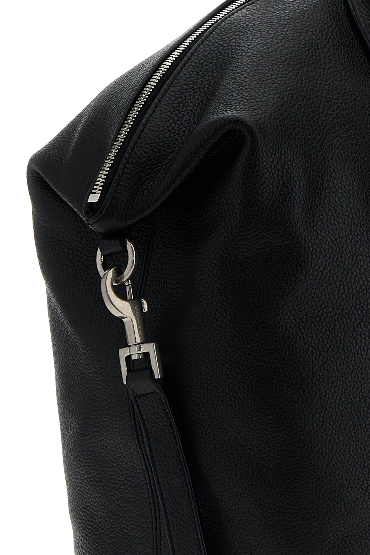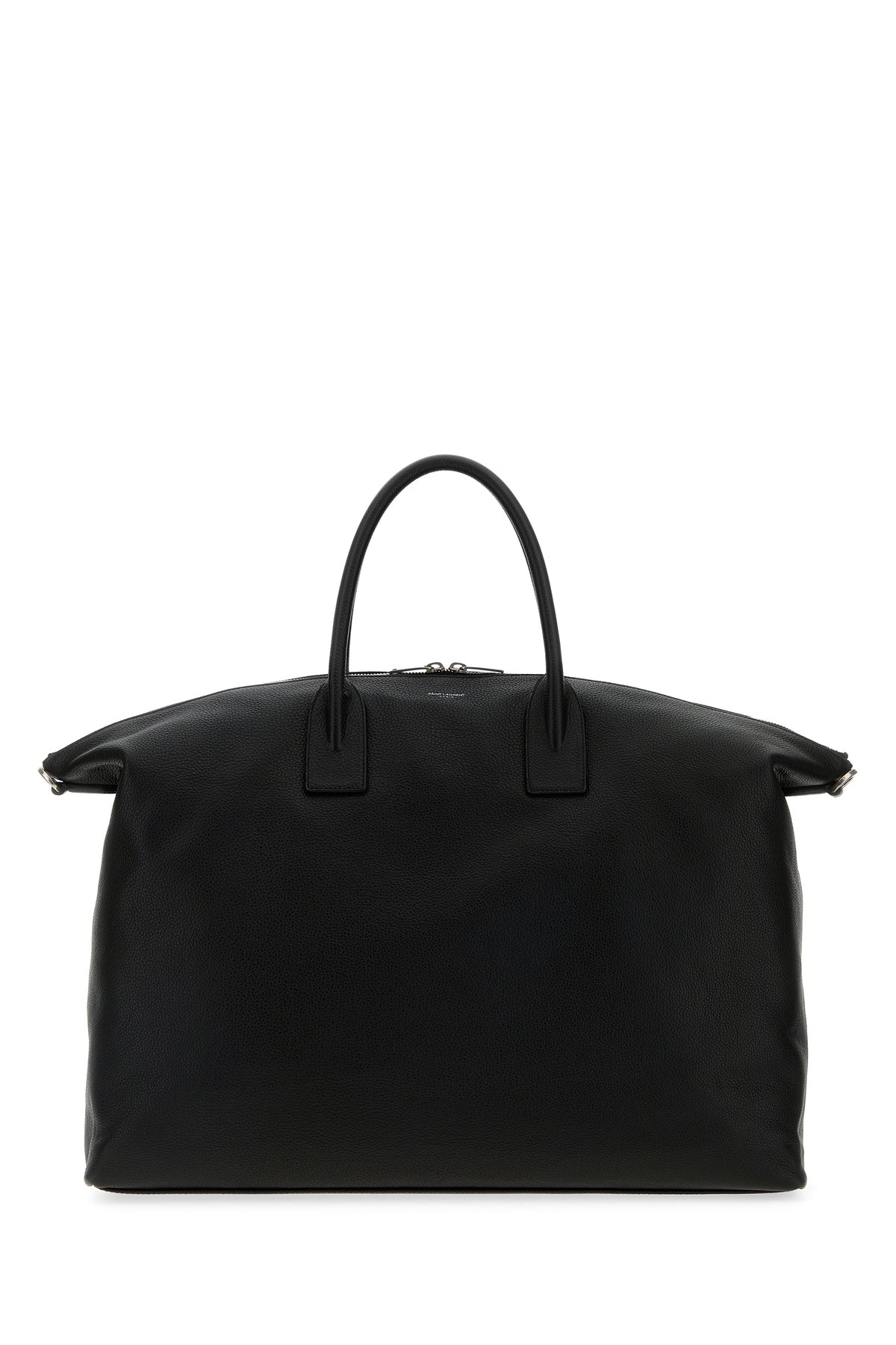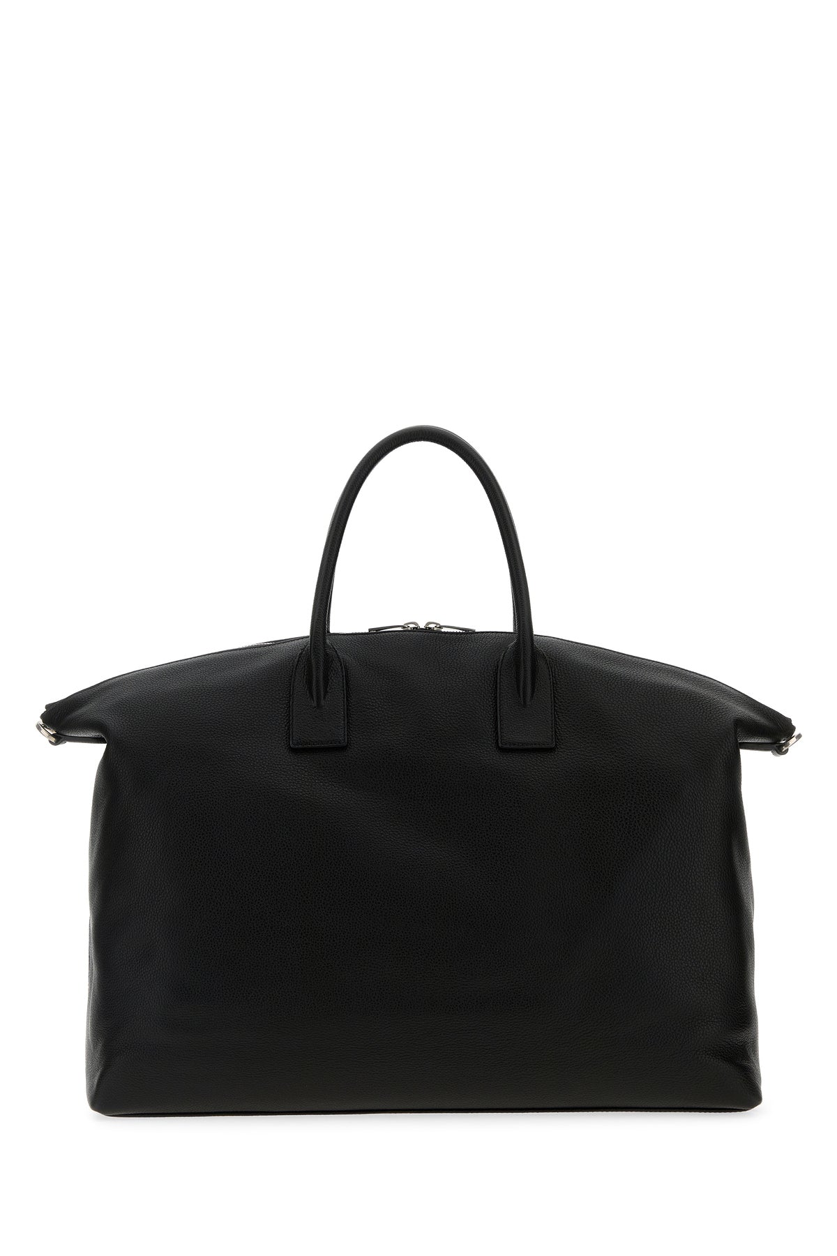 Travel bag realized in pebble calf leather characterized by laminated printed logo at the front.