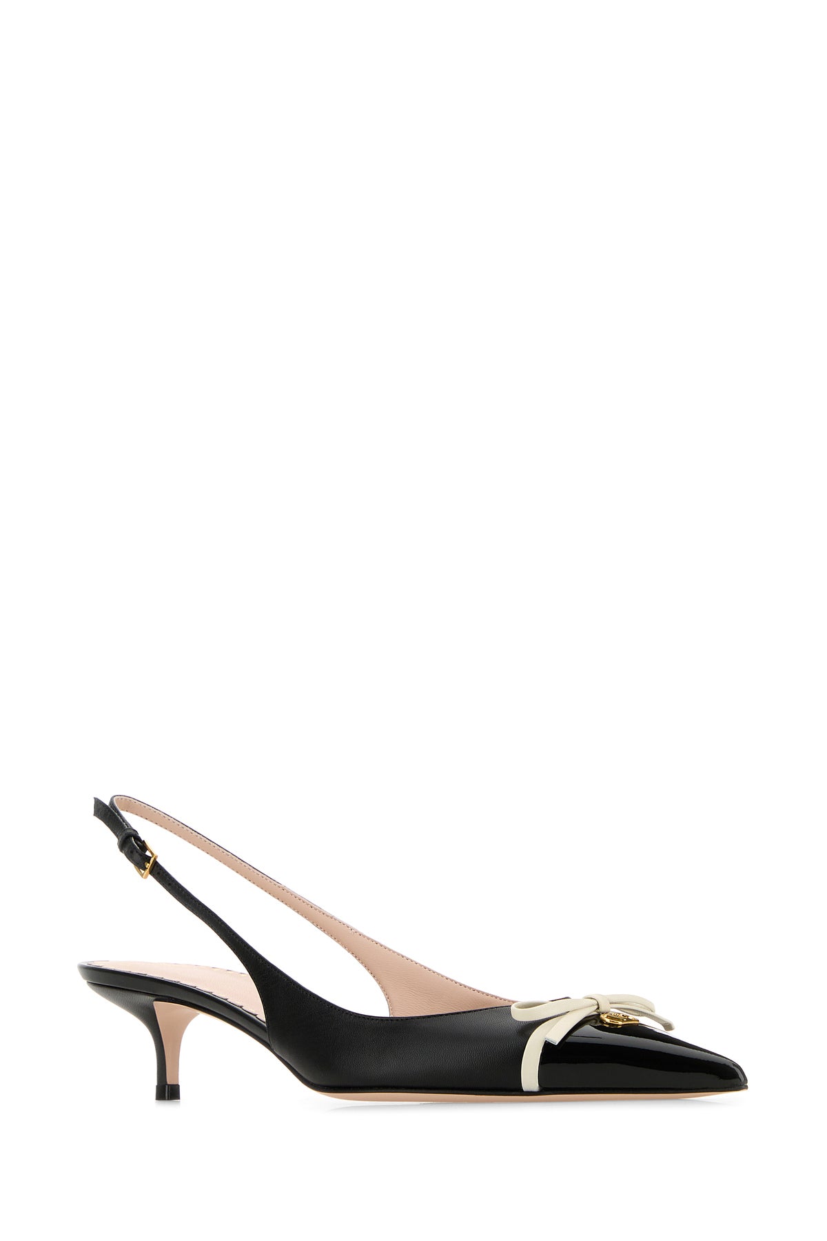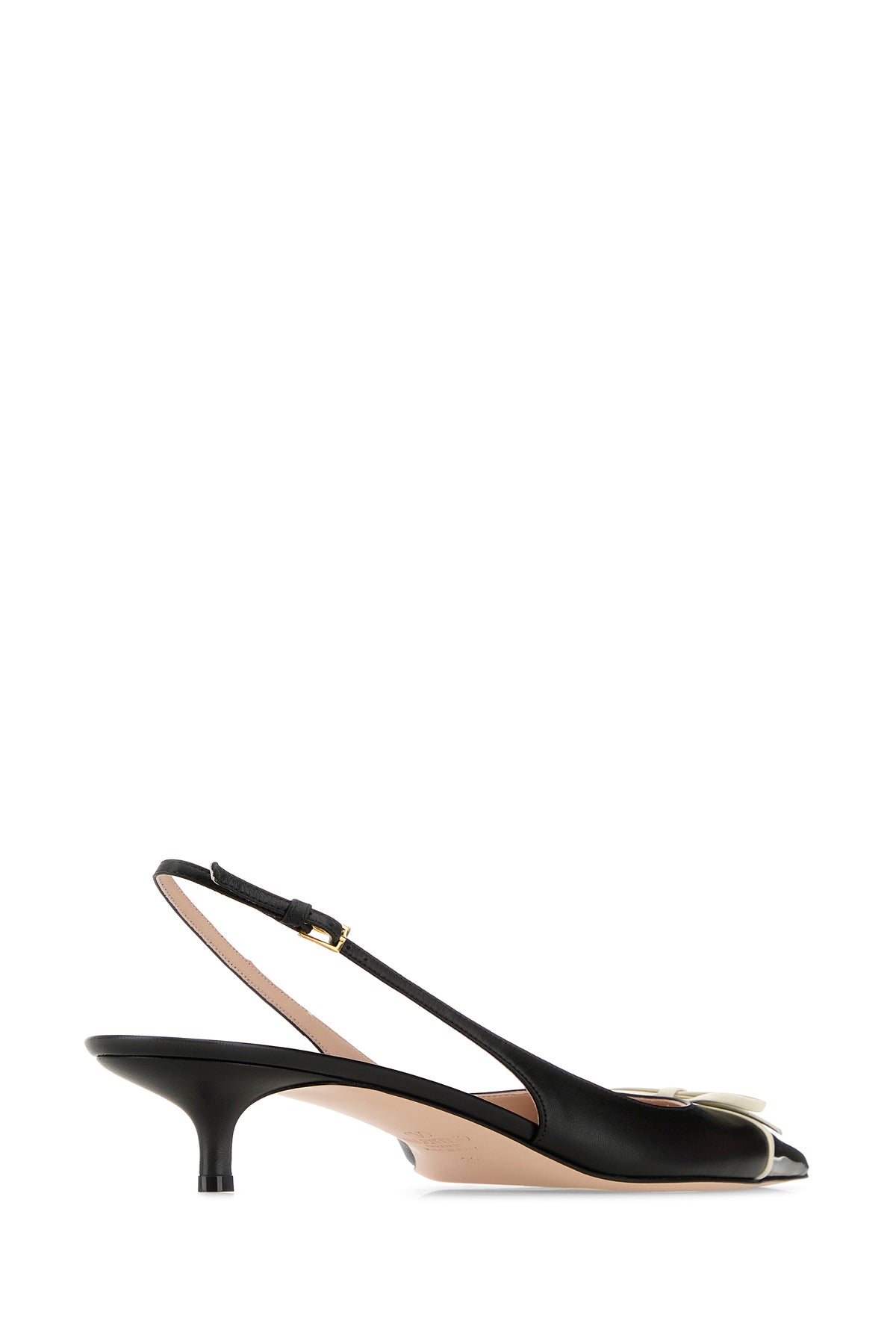Slingback realized in smooth leather enriched by metal VLogo detail and contrasting decorative bow at the front.