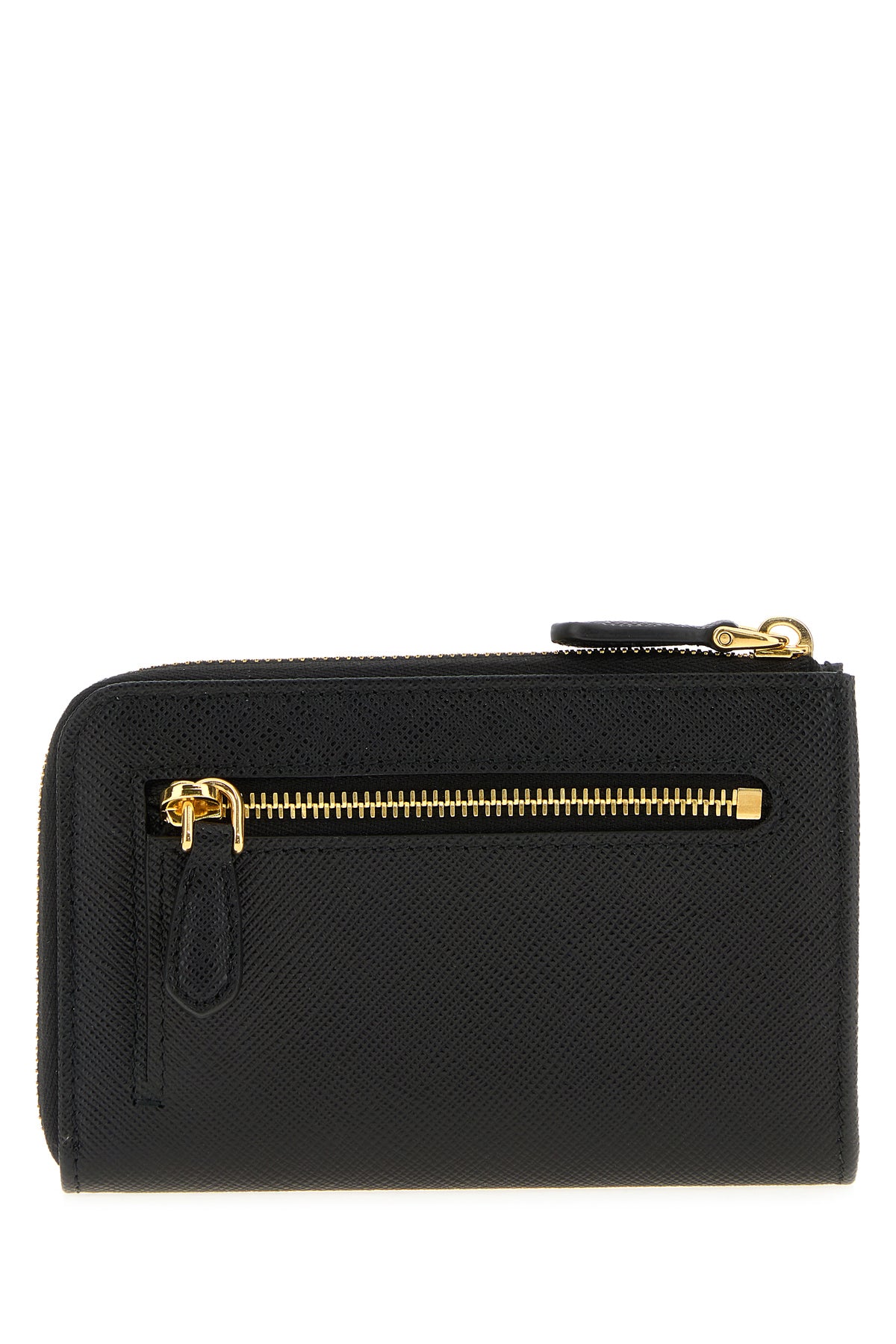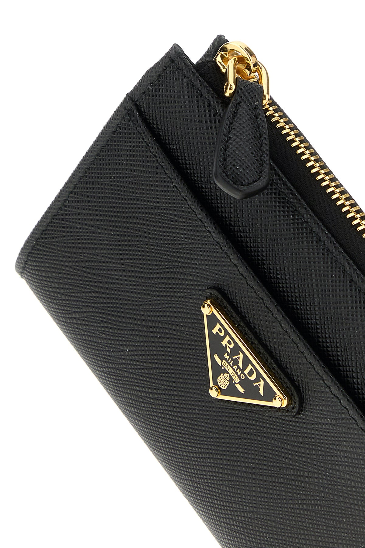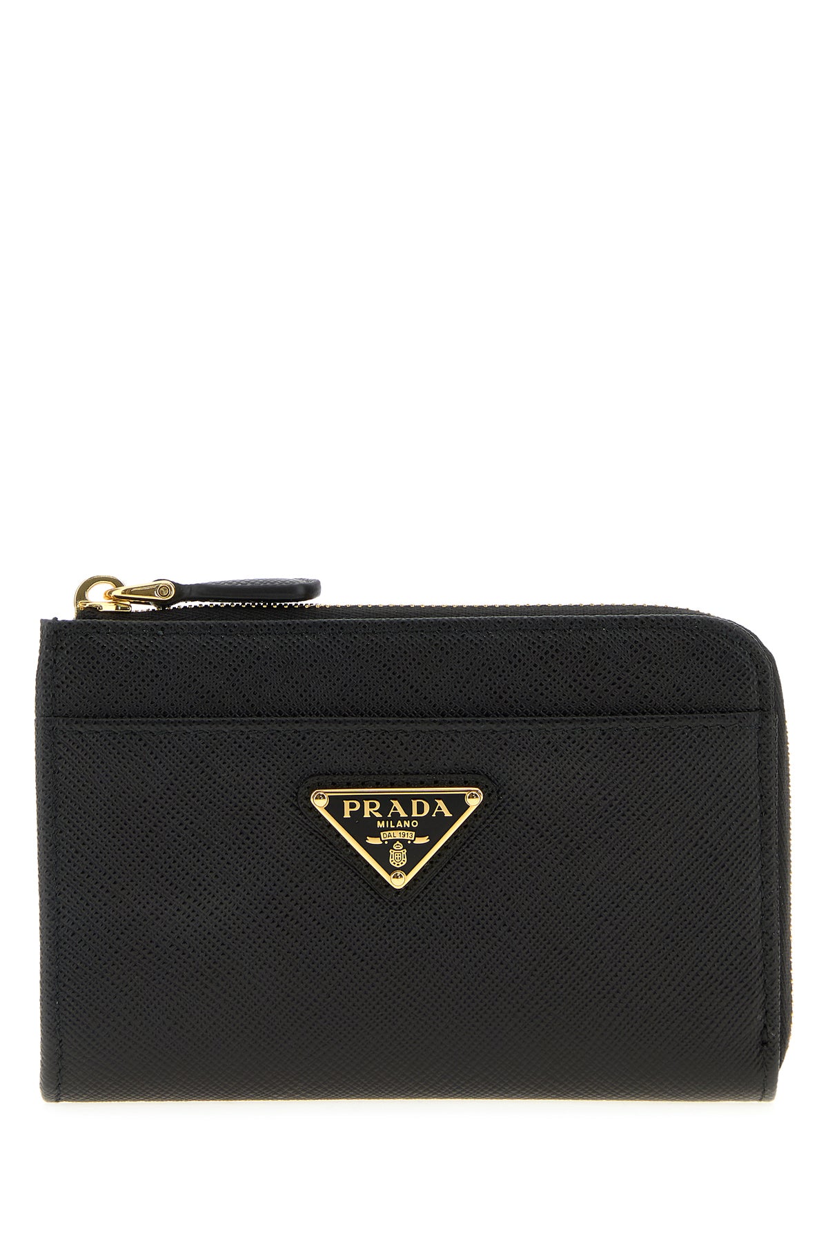 Wallet realized in Saffiano leather enriched by iconic logoed metal triangle at the front.