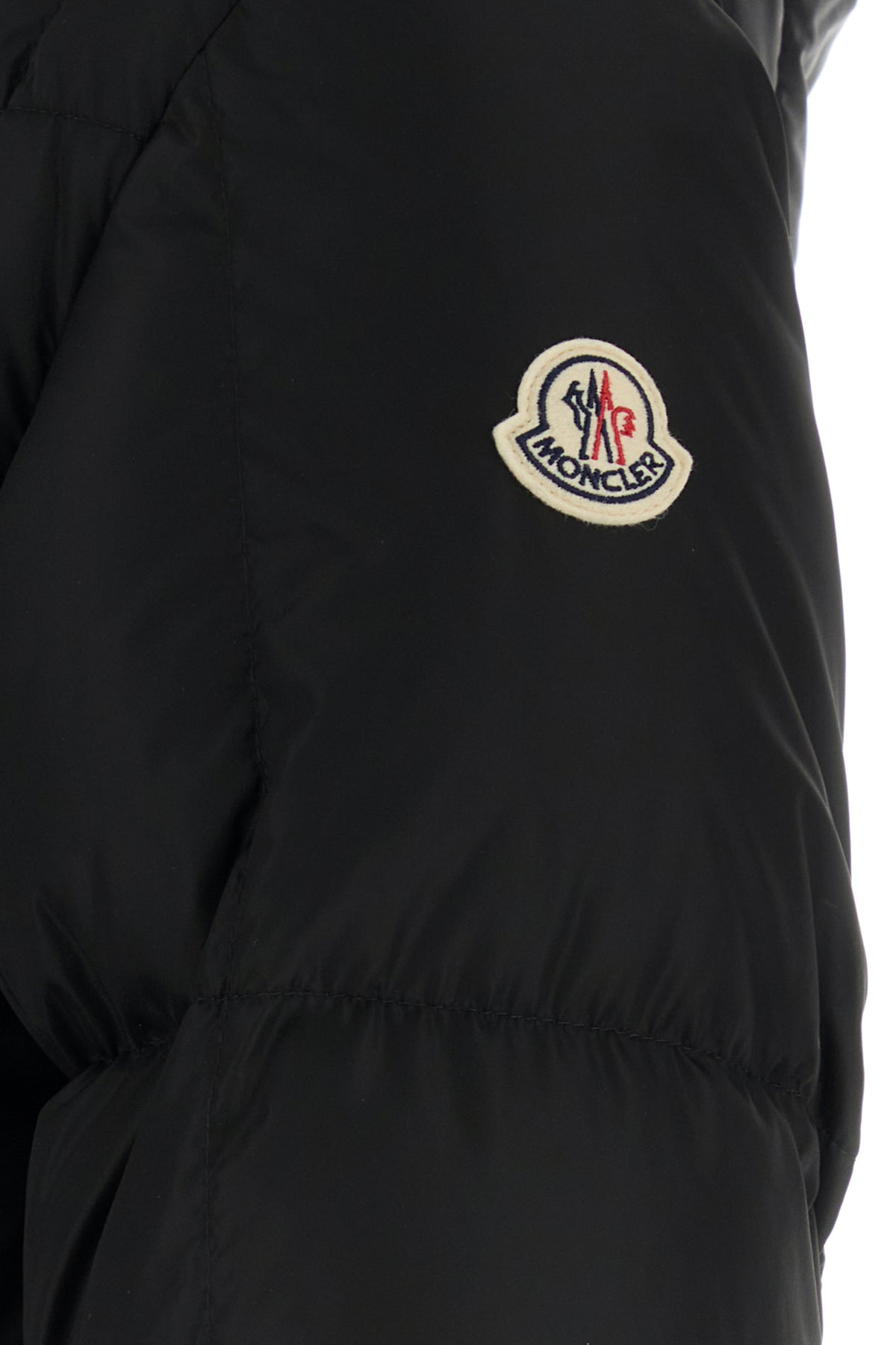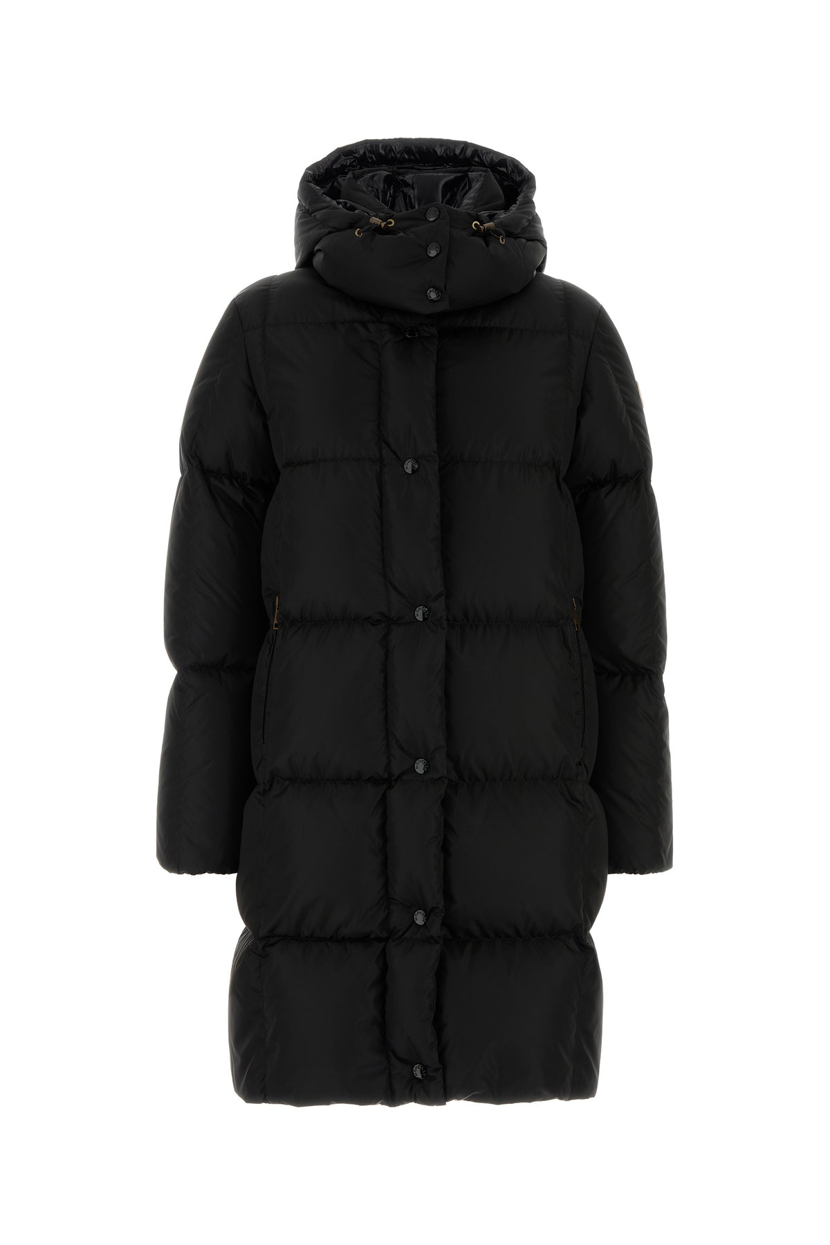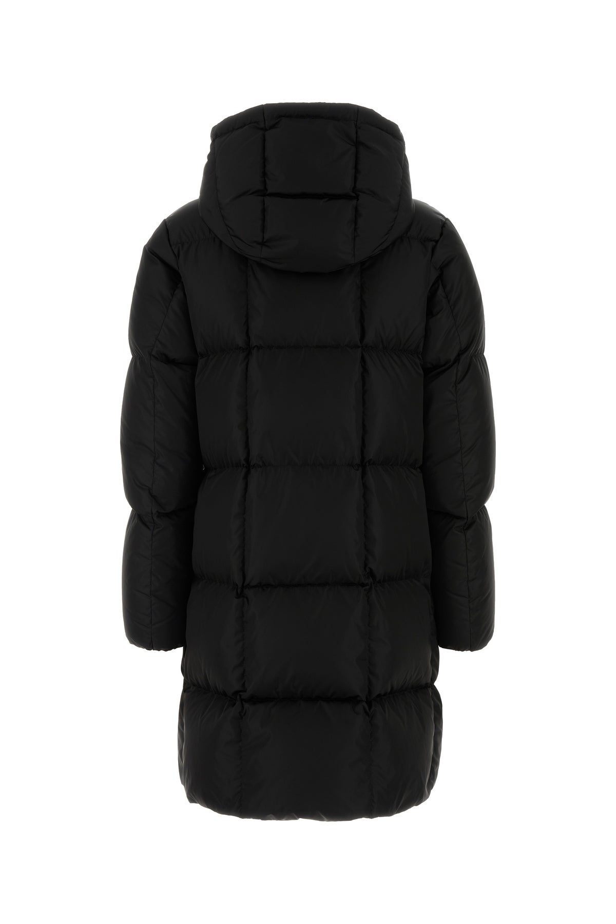 Long-cut down jacket realized in quilted nylon enriched by contrasting logoed patch on the sleeve.
