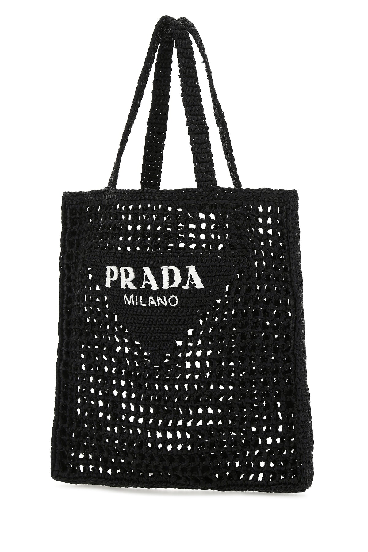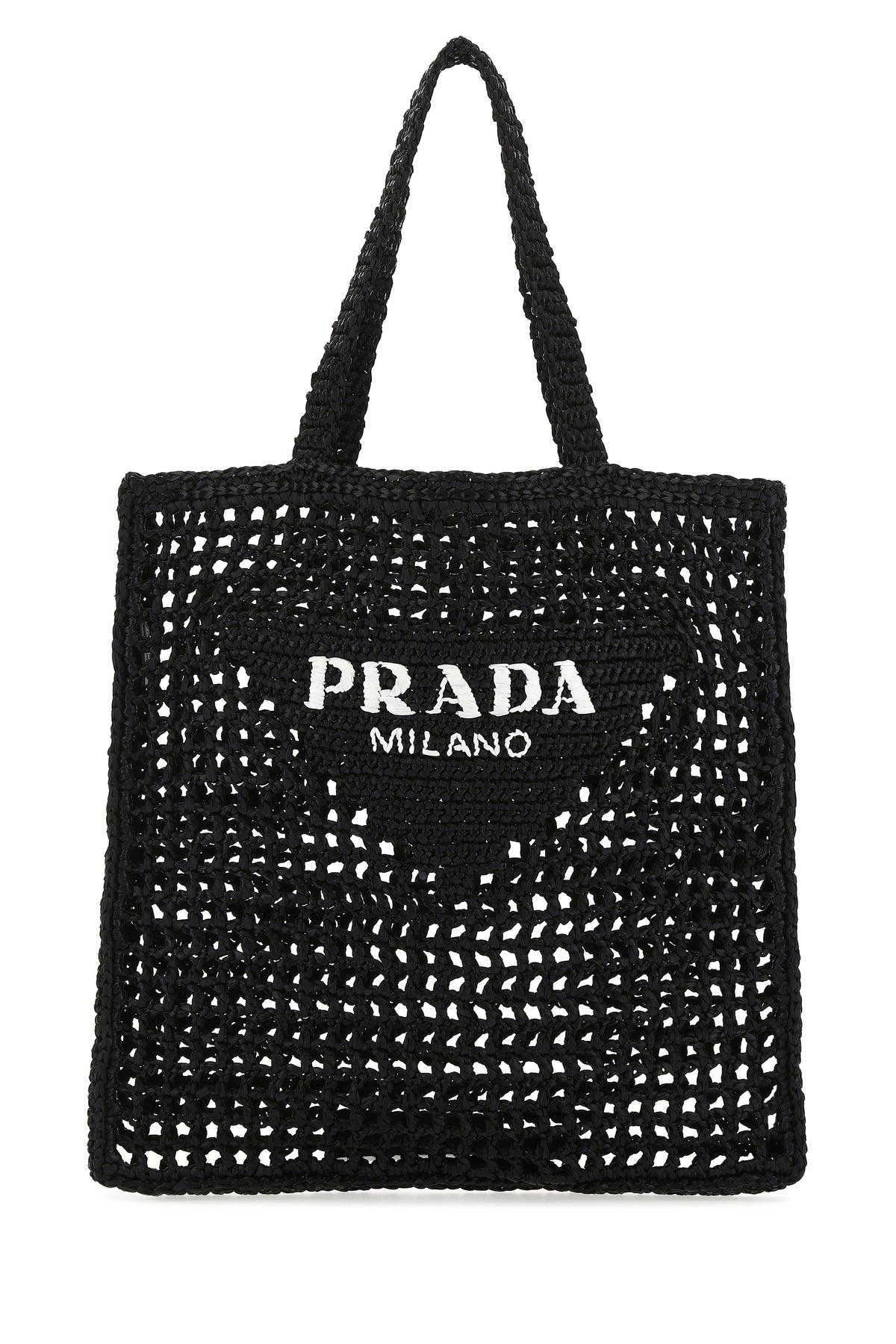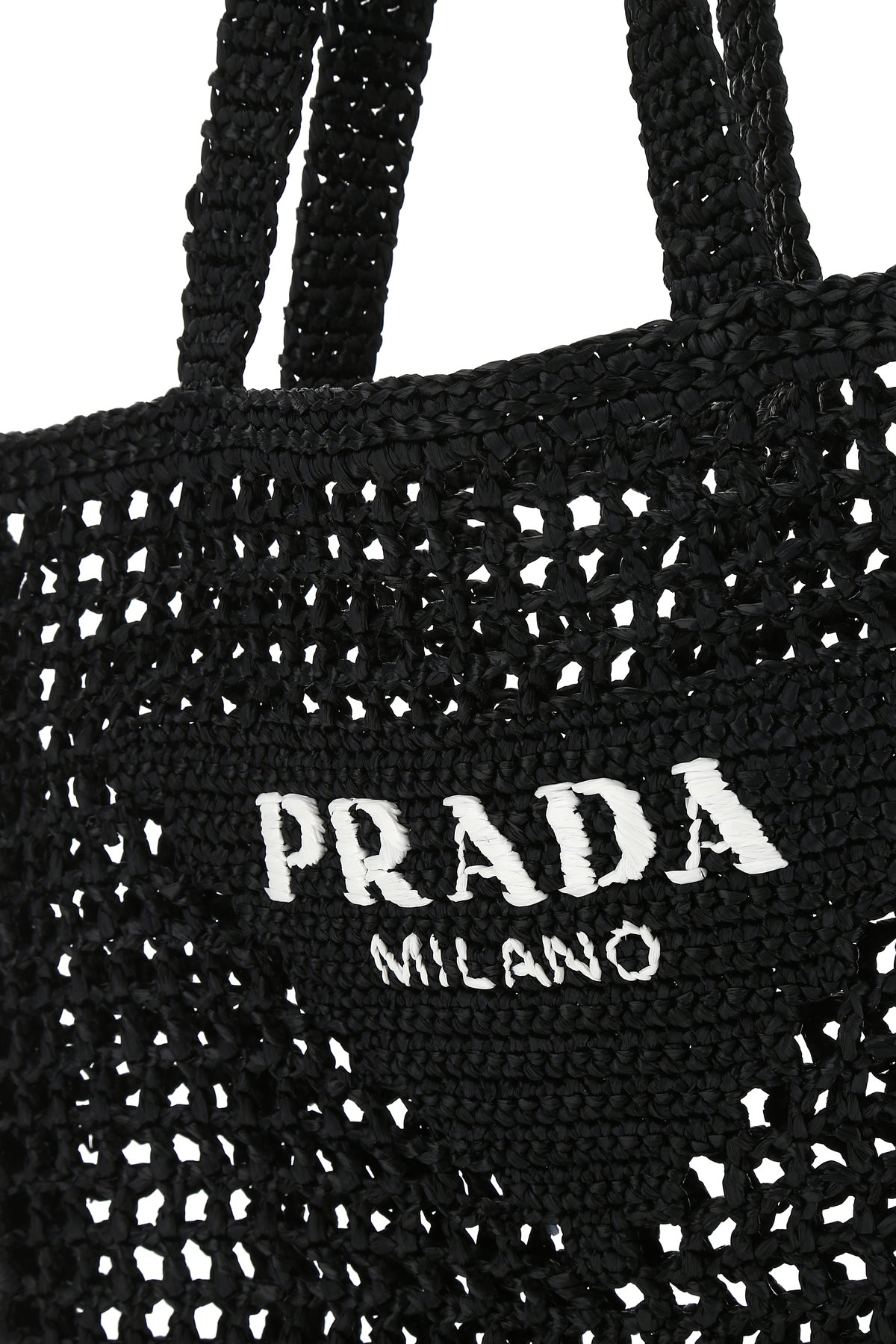 Shopping bag realized in woven raffia characterized by iconic logoed triangle at the front.