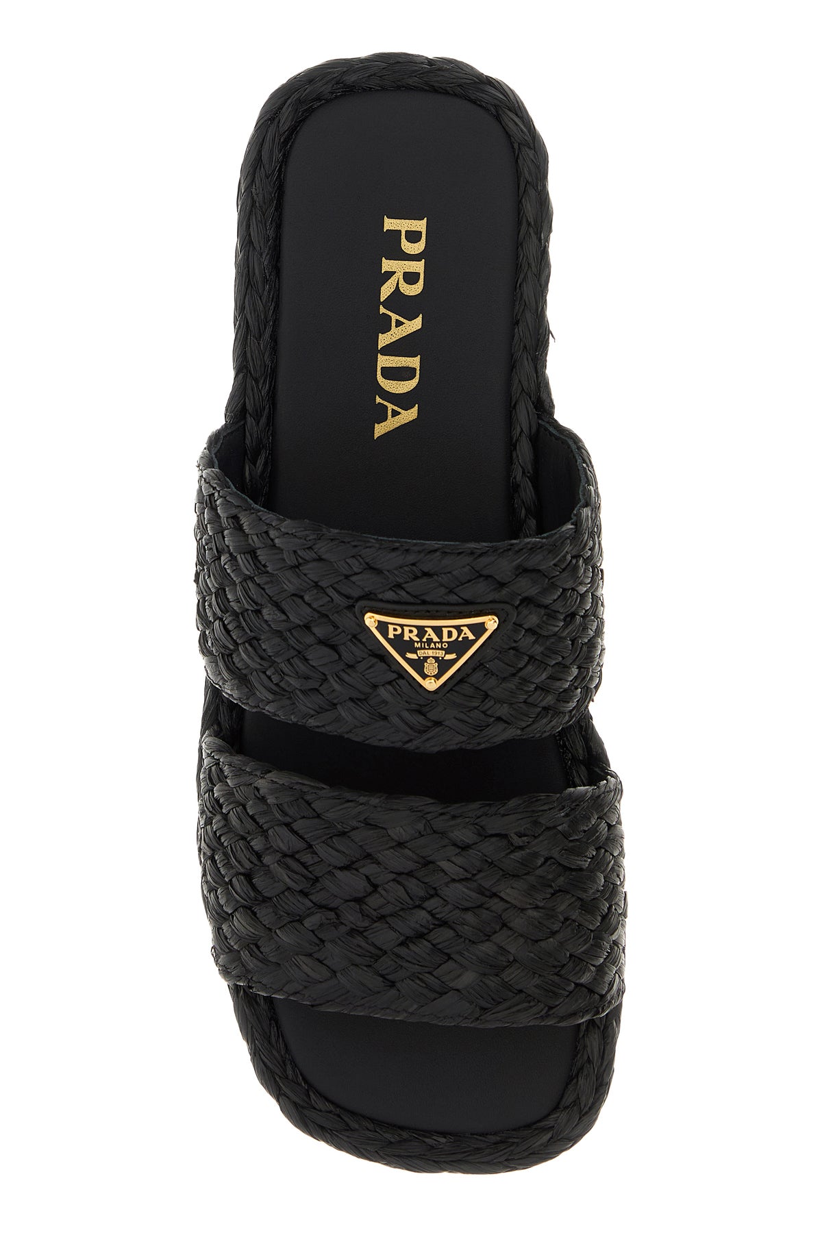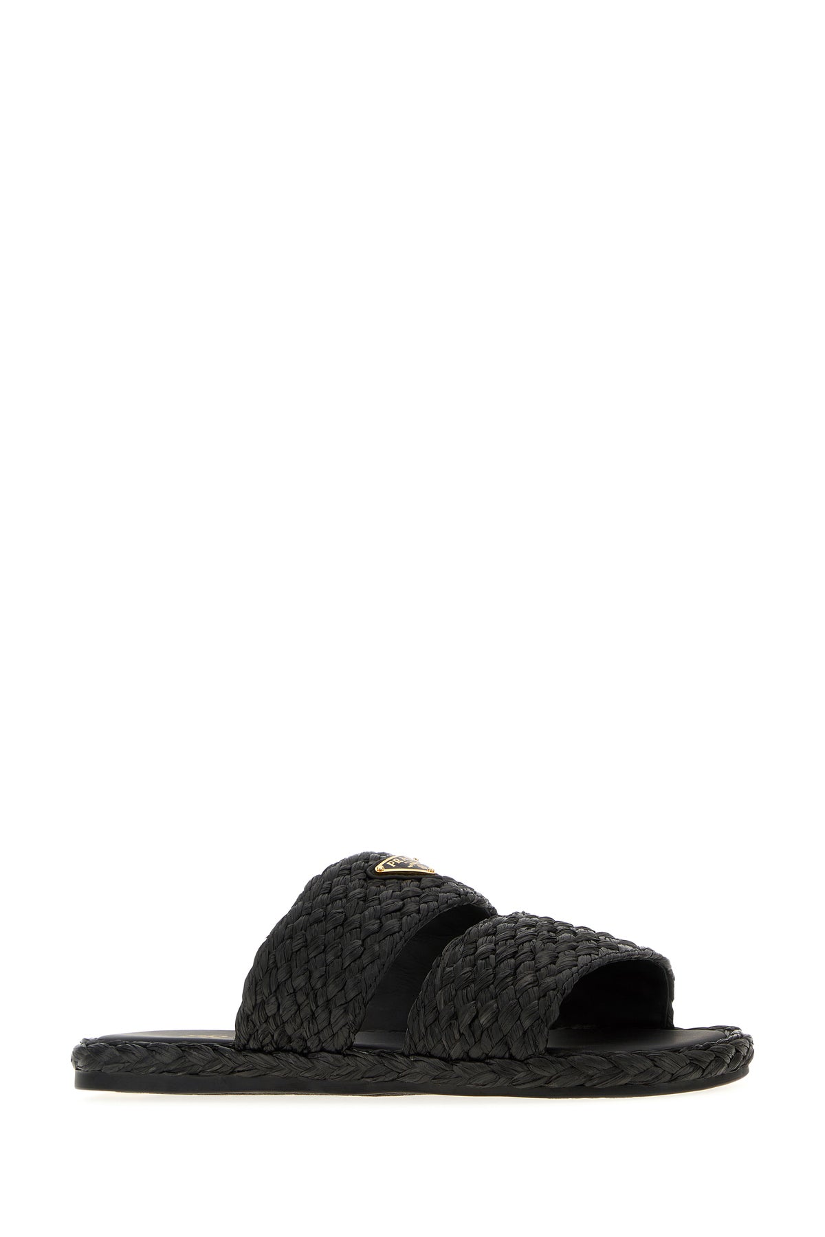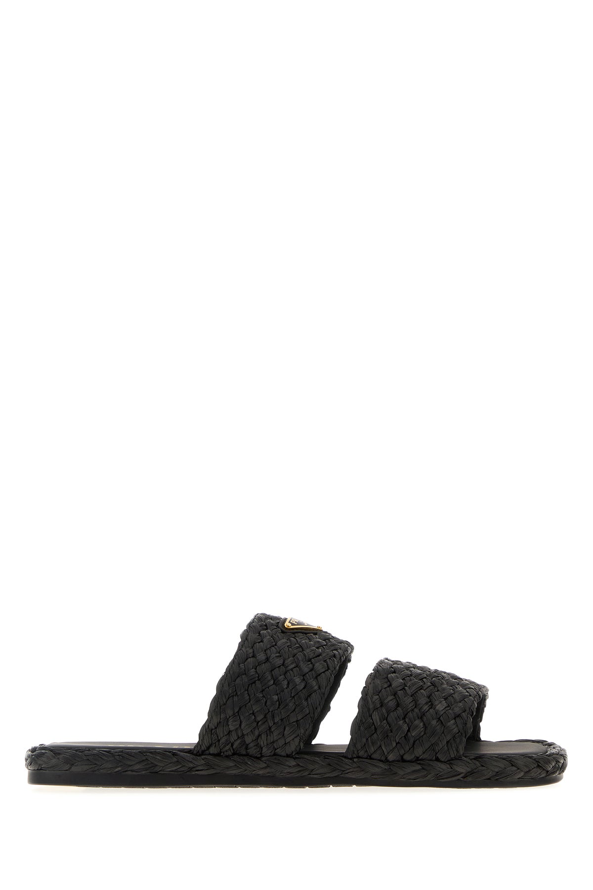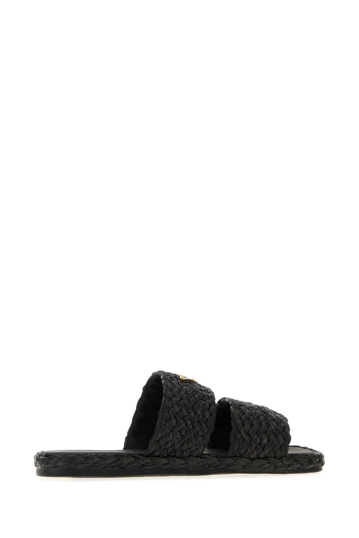 Slippers realized in woven raffia enriched by metal iconic logoed triangle on the instep.