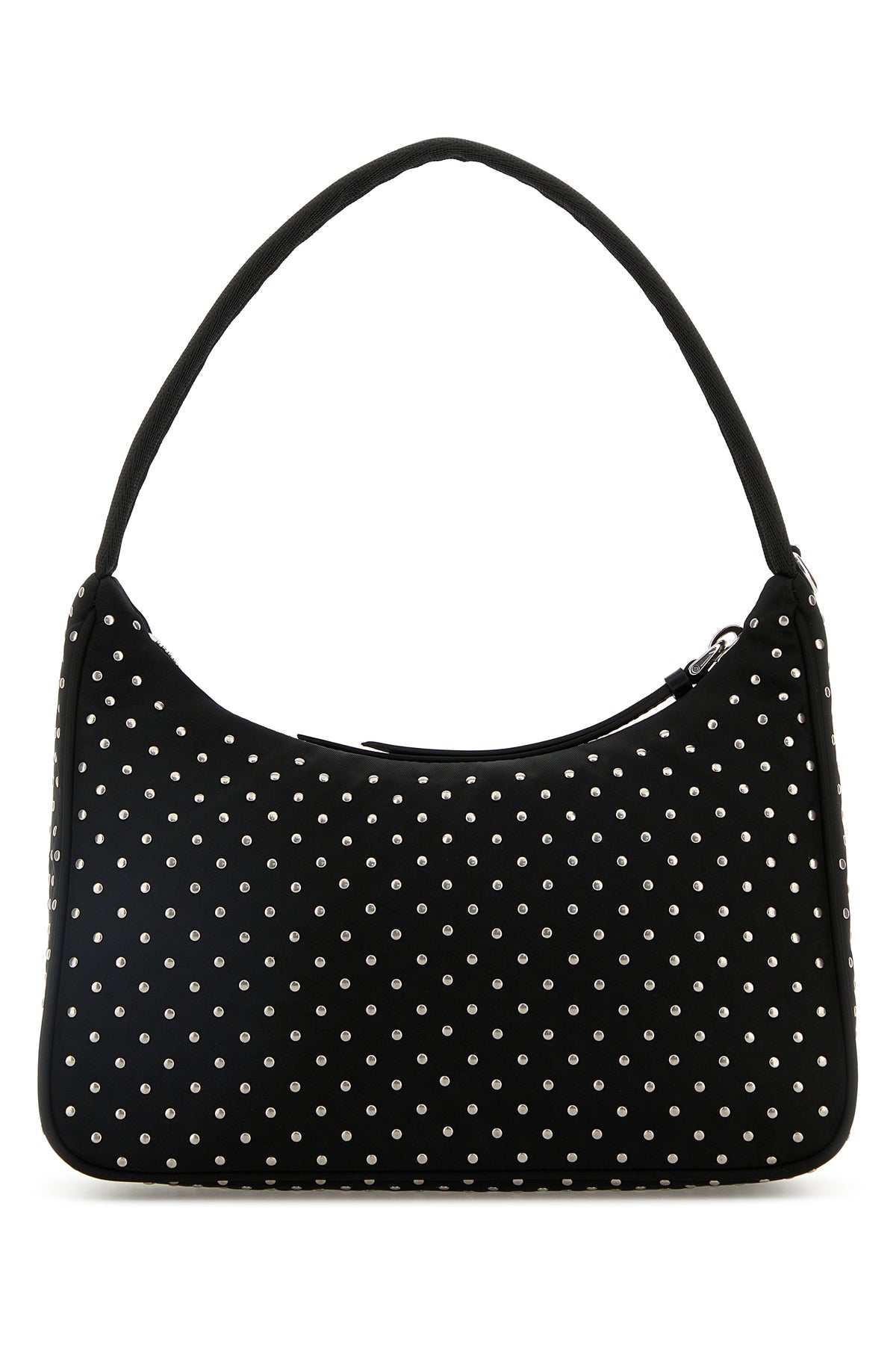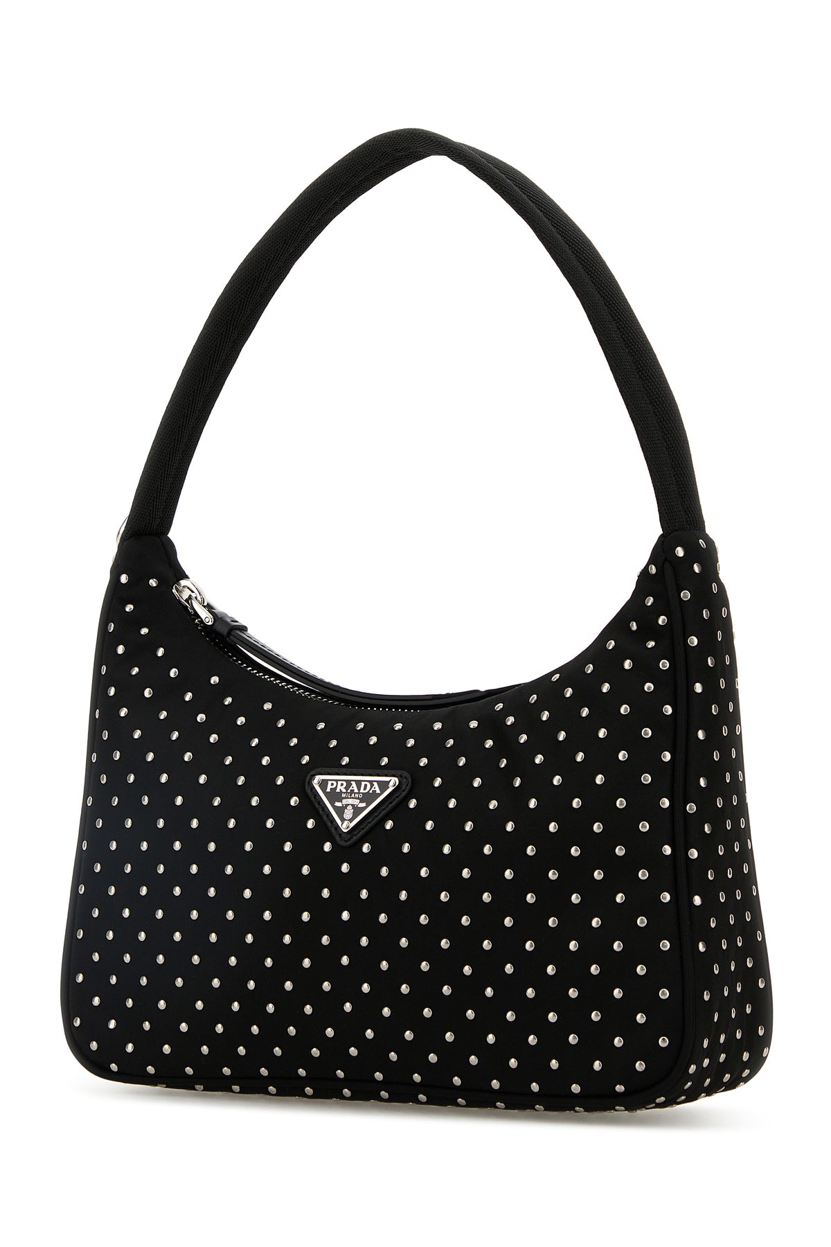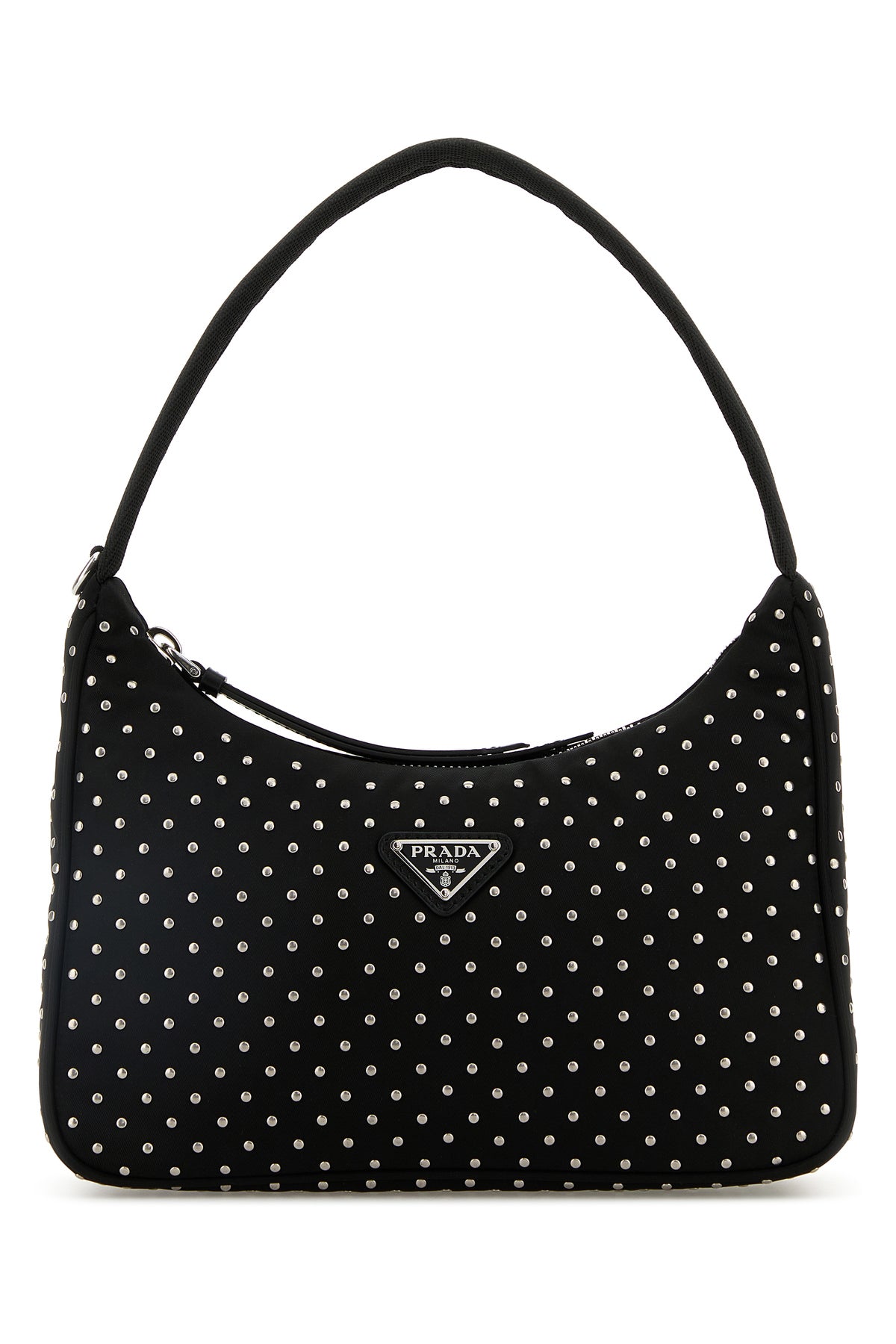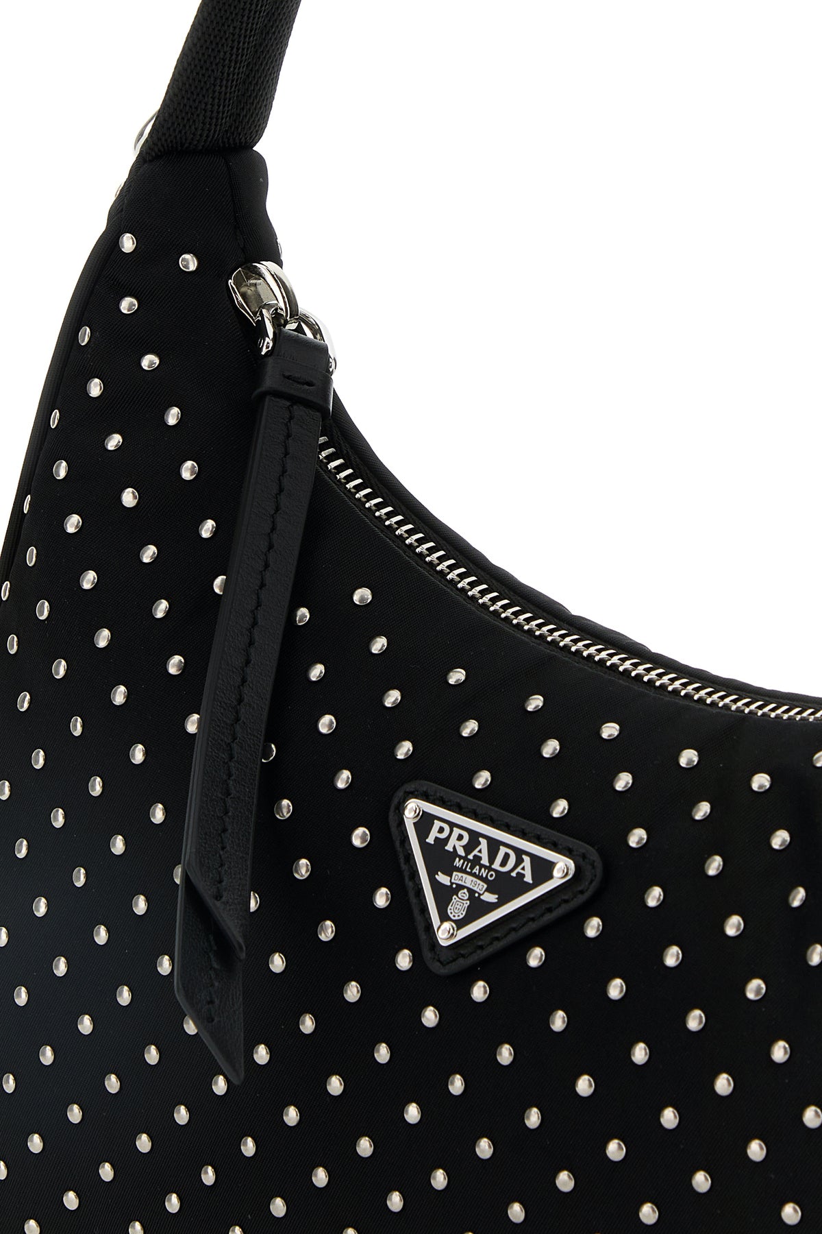 Shoulder bag realized in Re-Nylon enriched by iconic metal logoed triangle at the front and metal studs at the front, on the sides and at the back..
